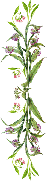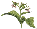 violette bet witte Blöden. Beinwell blöht vun Mai bet August. In en oll Krüderbook steiht: