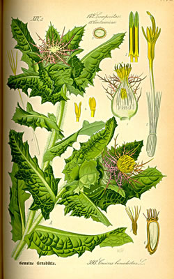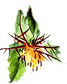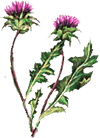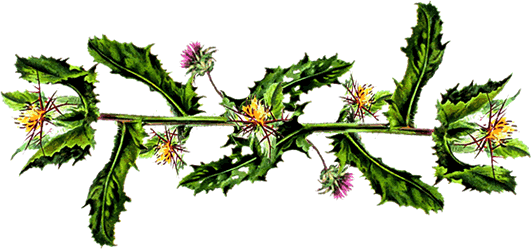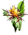 Herba cardui benedicti, also Bläder un blöhen Spitzen vun de Telgen in'n Juli un August (Handschen antrecken!). | |
