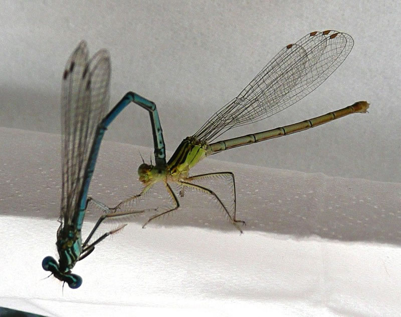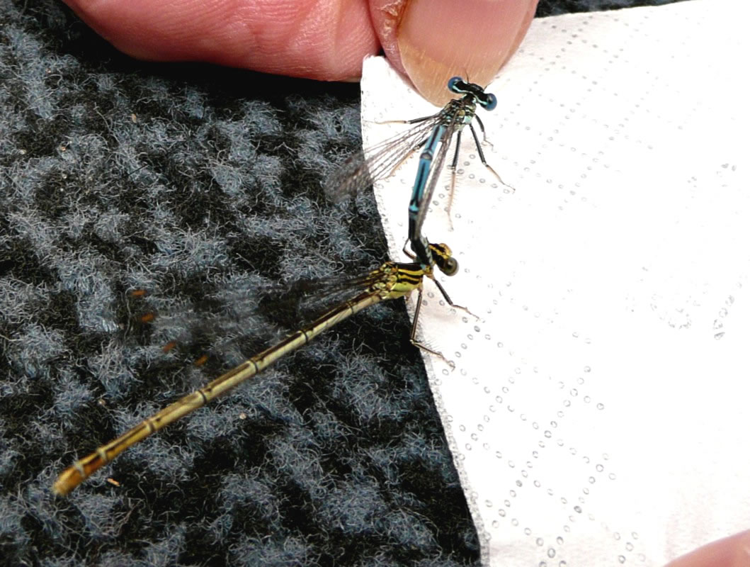So wiet weer dat bi uns' Poor noch nich. Man "ümarmt" höllen se sik al, un dor seten se un leten sik nich stören; se harrn allens üm sik rüm vergeten, dat maakt de Leev. Ik güng in de Knee, üm se to knipsen. Aver so geev dat keen goot Bild af. Dor keem mien Mann mi mit en Tempotaschendook to Hölp. Beid hockten wi nu up den Footbodden vun dat Schipp. Ganz vörsichtig hebbt wi de Libellen up dat Dook bugsiert. Jümmers noch leten se sik nich stören!