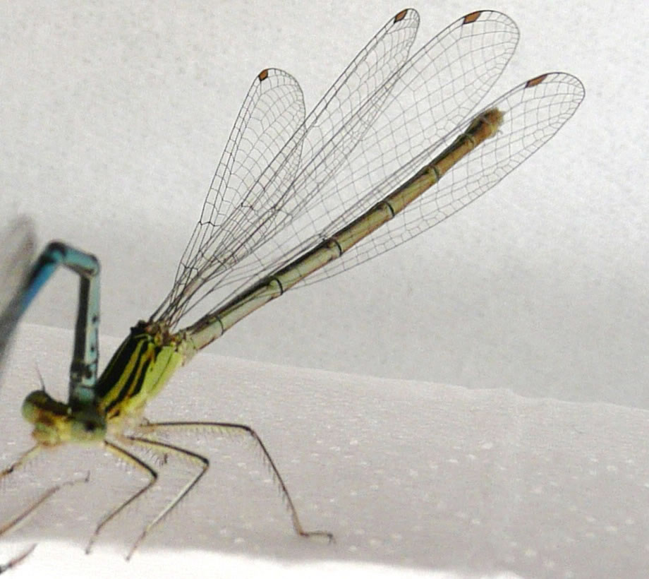 Torüch kaamt Se denn mit'n Zurück-Knoop vun den Browser. De eerst Fohrt up den "Amazonas des Nordens", de Wakenitz, hett uns so goot gefullen, dat wi al wedder up den Wakenitzdamper na Rotenhusen ünnerwegens weern. Un wedder weern Swattfohrer an Bord! Dittmal weern se up de Hochtietsreis. Blaue Federlibelln weern dat, de kannst faken an't Water drapen, sünnerlich wenn dat en reines, ruhiges Water is dor sünd se tohuus. Se wullen ehr Hochtiet an Bord fiern! De Libellen kemen glieks in Tandem anflagen. He weer blaag as Mannslüüd dat ja oftins op Hochtieden sünd, ok bi uns Minschen; avers de Libellerich vun düsse Oort is alltiet blaag, nich blots bi de Hochtiet. Un dat is en schönes, lüchen Blaag. De Bruut weer hellbruun, so seht de Fruuns bi de Blaue Federlibelle ut, vun Kind an. Vörn up dat Lief un an'n Kopp harr uns Libelle schöne Striepen in depes Düüsterbruun un Ocker, meist as en Tigerin. Dat weer en wunnerschöne, rassige Bruut!