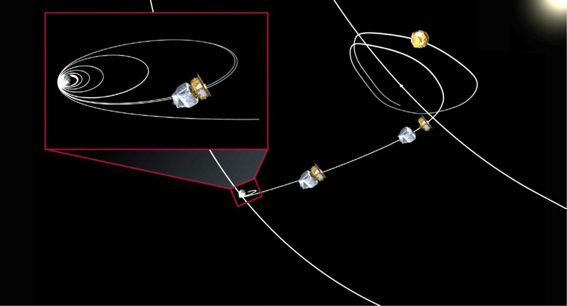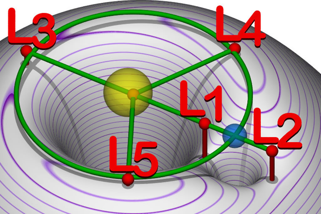 Sünne (gäl) un Eern (blaw). Lagrange-Punkte sünd