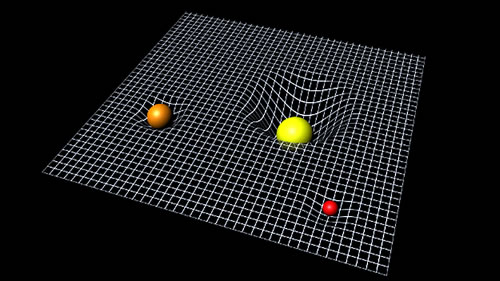 Dit Bild wieset dei Ruumtied as einen einfachen tweidimensionaolen Plaon, dei dör drei massive Objekte, as farwde Kugeln dorstellt, daoltrocken werd. Dit Daoltrecken is proportionaol tau dei einkeln Kugelmasse. So ein Daoltrecken in dei Ruumtied lenket dorbinnen dat Bewägen van ein massivet Objekt. Anners seihn, wenn sick massive Objekte in dei Ruumtied bewäget, werd dat Daoltrecken ännert un dei Geometrie van dei Ruumtied ännert sick staodig. Gravitation beschriff dornao ein dynamischket Wark tüschken Materie un Ruumtied. Süh ESA-Originaol-Bild un ESA-Missions-Siete.