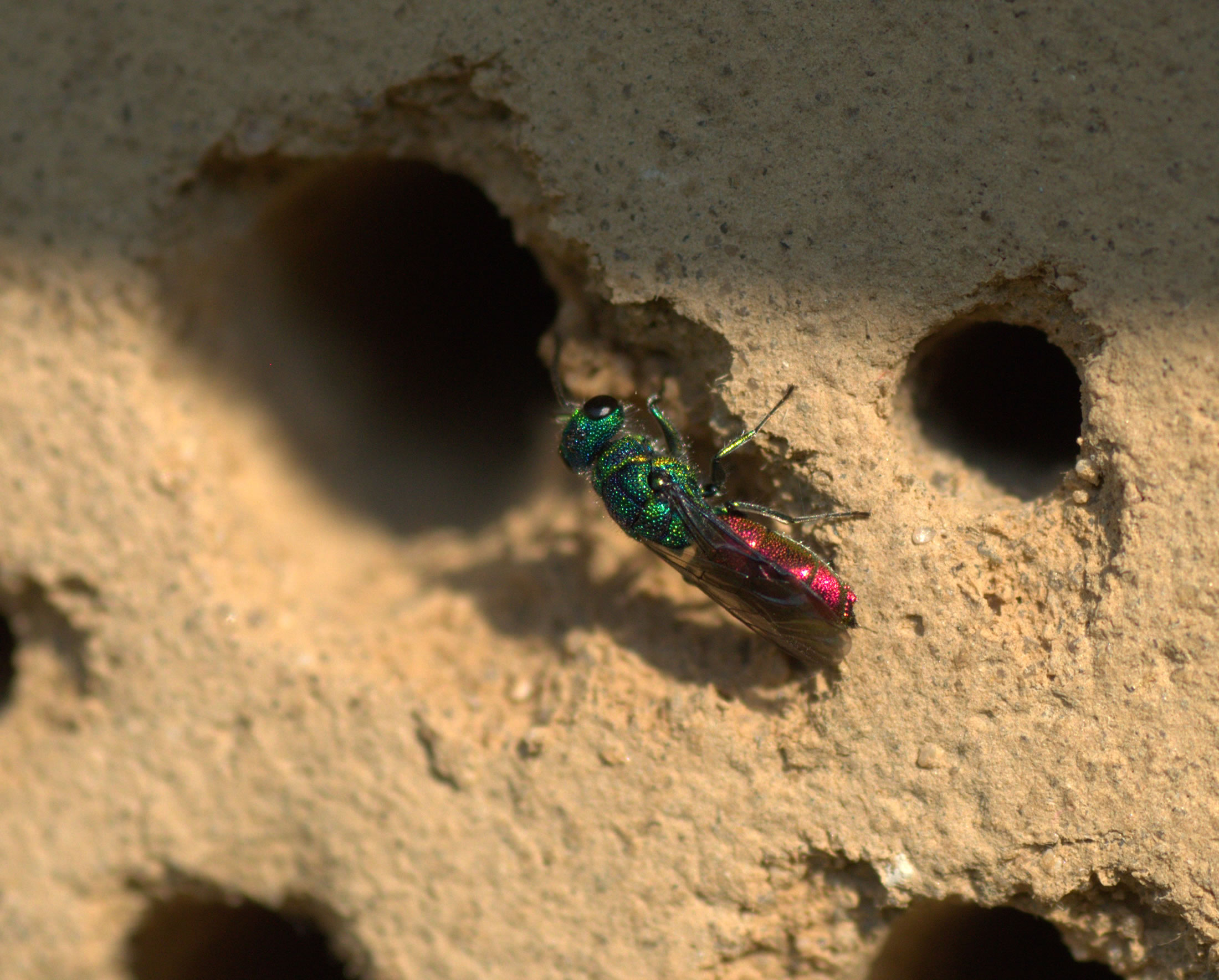 ![]() Luftakrobaten 2019 In de verleden Johrn sünd uns flegen Insekten gewaltig trüchgahn. Al siet 'n Tied maakt de oostfreesche Hobbyfotograf Thomas Seemann Insektenfotos för Fotokalenner, de sien Team "Tandem"/OBW rutgifft. Verleden Johr hebbt wi mit düsse Fotos en Kalenner uns Bottervagels toegnet. Düt Johr schall dat üm annere Luftakrobaten in Pagels' Goorn gahn. Se köönt de Fotos per Klick vergröttern. Trüch kaamt Se denn mit den Zurück-Knoop op de Browser-Symboolliest. Januar-Akrobat: vun Thomas Seemann un Marlou Lessing De Guldwöpsen sünd en groot Ünnerfamilie vun Steek-Immen. Gifft vele Aarten, in Europa en poor hunnert. Se all hebbt so'n Glänzen un Schemern op't Liev, as weern se mit Guldstuff överpudert. Orr mit Metallic-Lack anpöönt. Ok uns Fotomodell. Düt wunnerschöne Deert in meist exotische Farvenpracht is Chrysis ignita, de Gemeine Guldwöps orr Füür-Guldwöps. Baven blaaggröön, nerrn purpurrood, is dat ganze Deert man bloots 4 mm bit 1 cm groot. Dat Bild wiest ehr an den Ingang vun en Toonröhr, t.B. an en Insektenhotel, 'neem se jüst op'n Sprung is, ehr Eier rintoleggen. Hach, en junge Moder bi de Ei-Aflaag! Idyllisch, nich? Vun wegen! De Röhr is nämli nich lerrig. Dorbinn hett al en anner wille Imm orr Wöps ehr Eier rinleggt, villicht ok al Foder-Vörraat för den Nawuss, un warrt bald wedderkamen, dat Lock to verkleistern. Un dor leggt de Guldwöps ehr Ei rin! Wat passeert denn? Denn sluppt de Larv vun de Guldwöps un fritt dat Ei vun de egentliche Huusherrin. Orr, wenn dor ok al de Larv sluppt is, fritt se de. Denn fritt se de Fodervörrääd. Denn verpuppt se sik un sluppt as de wunnerschöne Guldwöps, in de nümsnich en Kannibalin un schaamlose Parasitin vermoden wöör! Un dat smucke Deert flüggt in de Welt un, ja, deit sien weertvulle Arbeit bi't Bestöven vun Planten, fiert ehr Leevsspeel un Begattung bit dat denn wedder an de Ei-Aflaag geiht. Denn wiest se ehr dunkle Siet. Se is de Kuckuck, de Swattfohrer ünner de Wildimmen un -wöpsen. Ach wat, de Kuckuck is en Waisenkind gegen düsse lütte Wöps. Kiek eins, so kannst di tüüschen! Schillerguld, 8.1.2019