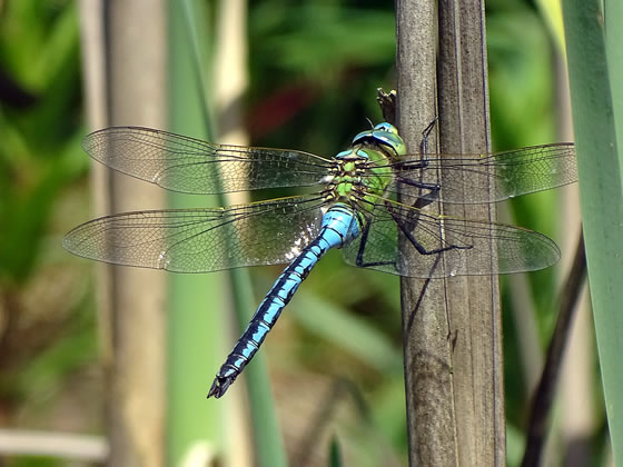 ![]() Luftakrobaten 2019 In de verleden Johrn sünd uns flegen Insekten gewaltig trüchgahn. Al siet 'n Tied maakt de oostfreesche Hobbyfotograf Thomas Seemann Insektenfotos för Fotokalenner, de sien Team "Tandem"/OBW rutgifft. Verleden Johr hebbt wi mit düsse Fotos en Kalenner uns Bottervagels toegnet. Düt Johr schall dat üm annere Luftakrobaten in Pagels' Goorn gahn. Se köönt de Fotos per Klick vergröttern. Trüch kaamt Se denn mit den Zurück-Knoop op de Browser-Symboolliest. August-Akrobatin: vun Thomas Seemann un Marlou Lessing In'n Hoochsommer kümmt nu ok endlich de Libellntied. En wohre Floogkünstlersche is de Königslibell, de mit ehrn latienschen Naam "Anax imperator" wöörtlich sogor "Kaiserliche Herrscher" heet. Natüürlich höört se to de Familie vun de Eddellibelln. To'n Glück is se noch nich bedrauht. Düt staatsche Deert warrt bit 11 cm breet. De Lief is üm un bi 9 cm lang. Uns Bild wiest en Heken, sien massive Vörrerlief is smaragdgröön, sien Achterliev saphirblaag mit en swatte Teknen. Bi dat Wievken schemert ok de Achterliev in Gröön. As all Libelln leevt se ruhiges Water, 'neem se Mücken un anner lütte Insekten, avers ok anner natüürlich lüttere Libelln jagen kann. Keen Wunner, dat dat Heken in't Foto an en Schilfrohr op de Luur liggt. Sünnerlich dat Heken is för sien utduurn Floogkünst beropen. De Königslibelln fleegt un poort sik bloots in'n Hoochsommer, dorna is ehr Tied vörbi, denn se hebbt dat geern warm. Libelln as mennig anner Insekten ok erinnert uns jümmer wedder an Matthias Claudius sien Wiesheit, wenn he dicht: "Siehst du den Mond dort stehen? Er ist nur halb zu sehen und ist doch rund und schön. So ist's mit manchen Sachen, die wir getrost verlachen, weil unsre Augen sie nicht sehn." Wi seht de Libelln as de prächtigen schillern Kunstflegers avers in düsse utwussen Foorm (se warrt "Imago" nöömt) leevt de Libell bloots wenig Maanden. Se danzt bookstäävlich bloots een Sommer lang. Avers wenn düsse Libell "to Welt kümmt", also ut de Larv sluppt, is se al twee Johr an't Leven! Düt Leven is vör uns borgen, un dorwegen is dat för uns ok noch keen Libell. Se leevt avers, bringt de Tied ünner Water to, woneem ehr Moder de Eier afleggt hett, as Larv, freet dor lüttste Waterdeerten un Fischlaich un wasst so langsam ran to de wunnerschöne Imago-Existenz, de wi endlich to Kenntnis nehmt un seggt "Oh, en Libell!". Eentlich avers is düsse Wesensfoorm bloots för de Hochtied un Foortplanten dacht. Se is keen Sülvstzweck, ok de ganze Schöönheit nich. Wat wi nich to Kenntnis nehmt, is liekers reaal. Un hett Respekt verdeent. larv popp imago wat 1.8.2019