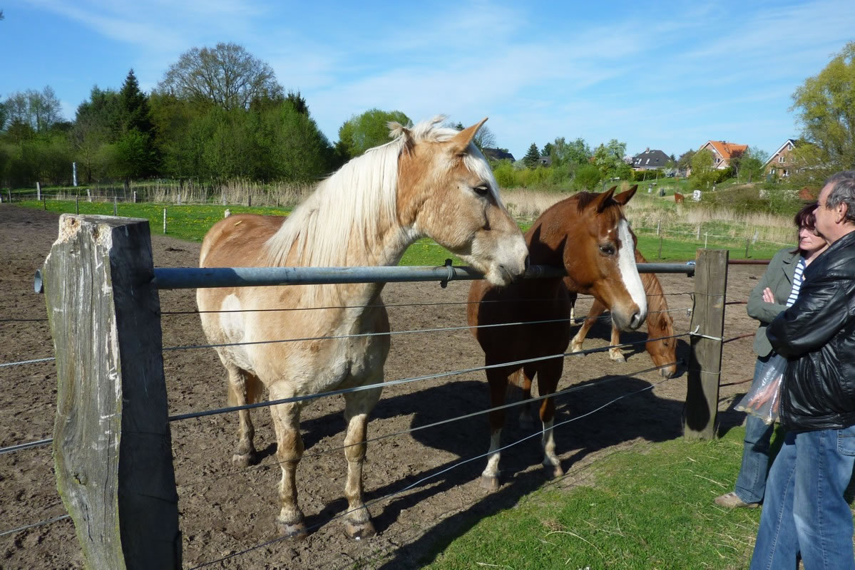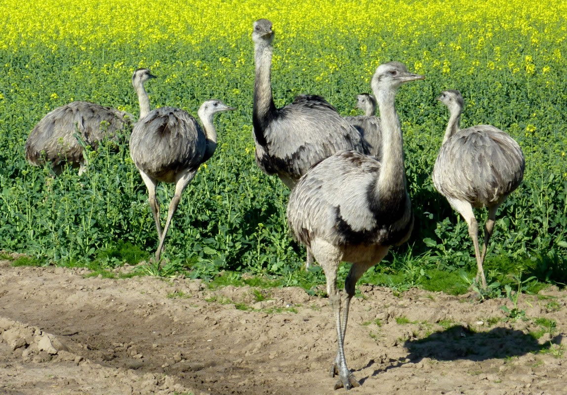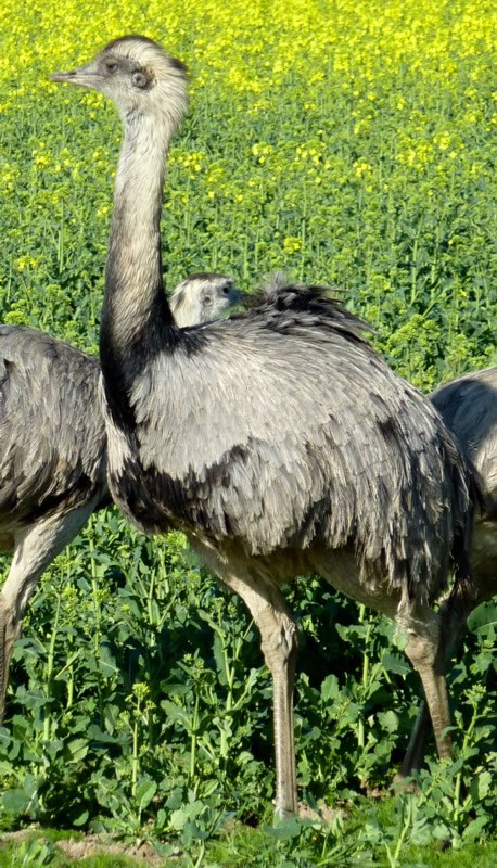 Wi hebbt noch mit den Besitzer vun den Rietstall snackt. De kunn sogoor Plattdüütsch. He hett uns noch vertellt, dat de Beek mank de Wischen de Grönau is. De groten komischen Grasbüschel kenn he ok, wüss aver nich, wat dat weer. Up unsen Nahuusweg snacken wi ganz begeistert vun uns Maifohrt. Wedder kemen wi an de Rapsfeller vörbi. Un dor stünnen doch an de een Kant vun en Rapsfeld en ganze Reeg Nandus. Anhollen un utstiegen weer eens. Mit den Knipskassen in de Hand slieker ik mi vörsichtig neger an de Nandus. De gröötst Nandu keem mi in de Mööt. He reck sien Kopp gefährlich hoch un keek mi mit sien scharpen Ogen an. Dor kreeg ik dat mit de Angst un bün gau wedder in't Auto stegen.
