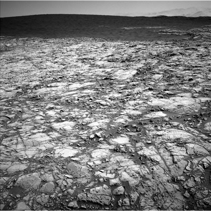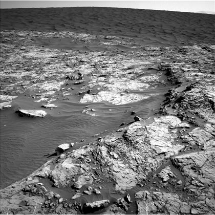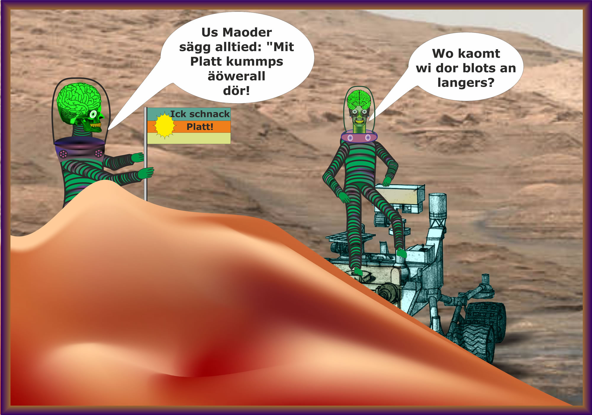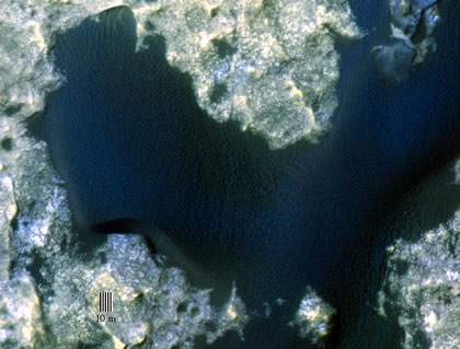 (Mars Reconnaissance Orbiter [MRO]). Dit Bild, ut den Mars-Ümloop knipset, wiest dei Sanddüne, wo Neiwind nu up den Weg nao dei höger liggen Laogen van den Sharp-Barg (Mount Sharp) henfeuhern schall. Disse Ansicht gaiht äöwer 380 m in't Quadraot. Dor ligg "Düne 1" in dat Bagnold Dünenfeld. Dei MRO-HiRESE-Kamera"nöhm dit Falschk-Farwen-Bild up. Dorbinnen sünd dei Spektraol-Andeile van rot, blaw-greun un infrarot tausaomeleggt.
