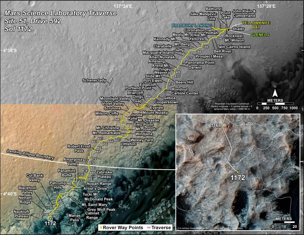 Dei ganze Neiwind-Mission op Platt: hier Disse Korte wiest den Weg, den dat Mars-Fohrtüg Neiwind (Curiosity) in dei 1172 Marsdaoge (Sol 1172) up siene heele Mission feuherde (Eerd-Daotum: 23.11.2015). Dei Punkt-Nummern up den Weg gäwet den Marsdag för jede Einkelfohrt an. Dat Längten-Maot up dat Bild steiht för einen Kilometer (~0.62 Meile).Van Sol 1168 bit Sol 1172 feuherde Neiwind einen orig lieken End van 50,56 Meter (süh Vergröttern). Dat unnerleggte Bild för disse Korte knipsde dei hoch uplösen