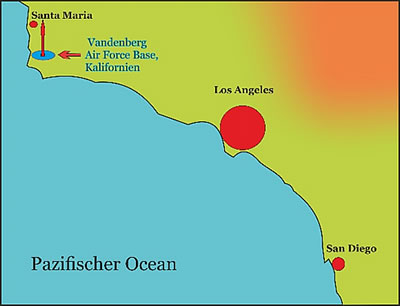 Dei InSicht-Sonde schall dat eierste planetore Ruumschipp wän, dat van dei USA-Westkante mit eine United Launch Alliance Atlas V-Rakete van den Space Launch Complex-3 up dei Vandenberg Air Force Base in Kalifornien starten dait. Wenn dorbi dei Sicht klor is, denn kann man den Start van Santa Maria nao San Diego, Kalifornien seihn. ![]() Stä, wor dei Rakete upstiegen schall. Bild: Ludgerd Lüske, Koort: Google Den Puls van den Mars mäten