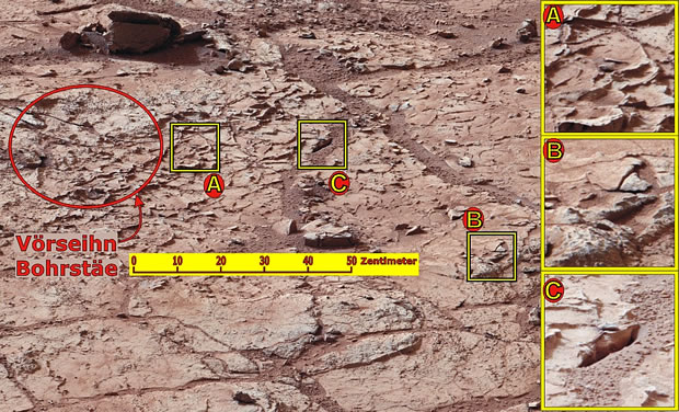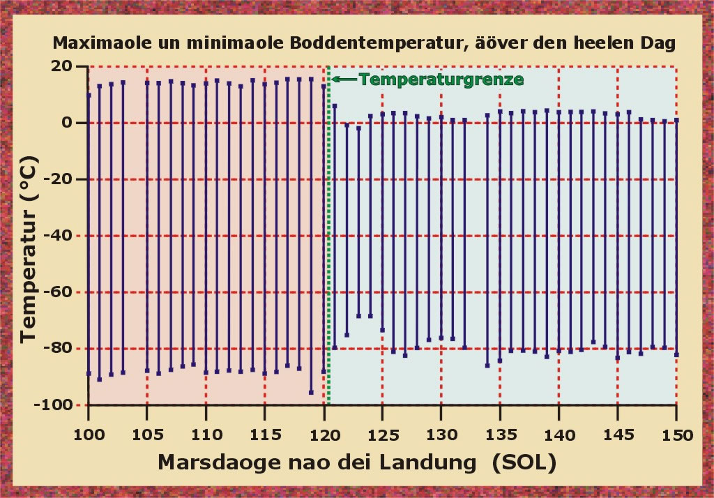 Lange schall et nich mehr duuren. Neiwind hett tau'n eiersten Maol sienen Bohrer up einen Stein settet un sachte andrücket. So wull man fastestellen, of dei Kräfte, dei dorbi up den heelen Apparaot wirket, so sünd, as man dat uträket harr. Nao dei Landung van Neiwind up den Mars dö man aale Instrumente an Bord utprobeieren. Nu is dei Bohrmaschine an dei Riege. Dei lüttke Schlagbohrer an den Roboterarm kann in den Stein bohren un denn dat Steinpulver tau'n Unnerseuken upnähmen. Eine utsöchte Stäe kreeg den Naomen "John Klein". Dit Felsenwark schall pass wän för dissen Test. Dei Nasa-Lüe werd bi disse technischke Aktion orig rutföddert. Dat Rüsten tau dit Wark löpp up't üppste. Bi den Vör-Test wörd dei Bohrer so up den Stein drücket, as wenn dei bohren schull, dorbi gewünnt man dei nödigen Daoten van dei Kraftwirkungen. Dornao schall noch ein Vör-Test in dei Nacht afloppen. So krieget dei Mars-Forschkers uk Daoten tau dei Temperaturunnerscheide tüschken Dag un Nacht. An disse Stäe fallt dei Temperatur van näömdaogs 0° Celsius up minus 65° Celsius in dei Nacht af. Dör disse Temperaturunnerscheide ännert sik dei Maote van dat Fohrgestell un van den Roboterarm. Dei Technikers schätzet, dat et bold 2,4 Millimeter utmaoken kann. Et schall noch mehr up disse Ort unnersöcht wern, üm mehr Künne tau kriegen äöver dat, wat dei Rovertechnik uthollen kann. Dat kann wichtig wern, wenn dei Bohrer bi dei taukaomen Aktionen eis äöver Nacht in den Fels sitten bliff. Ansik schall dat nich passeiern, Vörsicht steiht an eierste Stäe. So willt dei Nasa-Lüe uk noch mehr äöver den Taustand van den"John-Klein-Stein" rutfinnen.