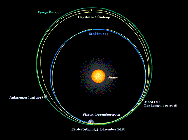 Dei Mission "Hayabusa" heit "Wanderfalk" up Japanischk in Asien schnacket sei gern wat blaumiger. Dei Chinesen neumet ehr Ruumfohrtüge ja sogor "Morgendämmerung", "Götterschipp" orr "Himmelspalast". "Wanderfalk" is dor in'n Vergliek noch nüchtern! Dei Ruumsonde Hayabusa 2 is an'n 27. Juli 2018 bi den anstüerten Asteroid ankaomen. Eiers wörd van wieden dei Asteroid naokäken un laöterhen schall disse Sonde dor landen un Steinwark upnähmen. Dit Materiaol schall dei Apparaot denn nao dei Eern trügge bringen. Bit tau drei annere Rovers un MASCOT helpet dat Mauderschipp bi dat Seuken nao eine passen Stäe för dei Probenaohme. MASCOT schall uck sülwes up Ryugu Experimente maoken.