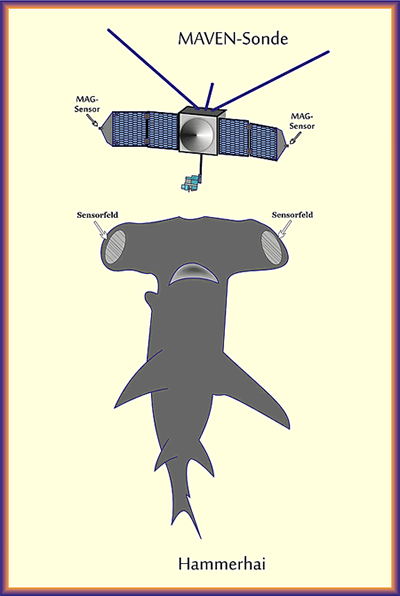 Hammerhaie käönt orig gaut elektrischke Felder wohrnähmen. In dat breit utleggte Koppdeil sittet dei woll besten Bio-Sensoren för elektrischke Felder. Dormit käönt dei Hammerhaie elektrischke Felder faoten, dei van Muskeln un Nervenbaohnen in annere Deierts utgaoht. So käönt disse Haie ehre in den Meerbodden verstäken Fauer-Fischke finnen. För dat gröttere Ruum-Uplösen sittet dei Sensoren in den breien Koppdeil wiet van einanner weg. Dit Bauvörbild häbbet dei Konstrukteure bi dei Magnetsensoren in dei Maven-Sonde uck naohmen. Dei Physik gellt in Technik un Natur up dei süftige Oort. 16.8.2014