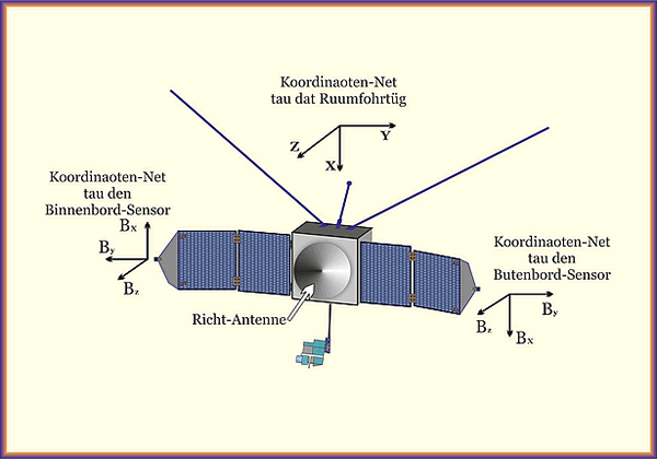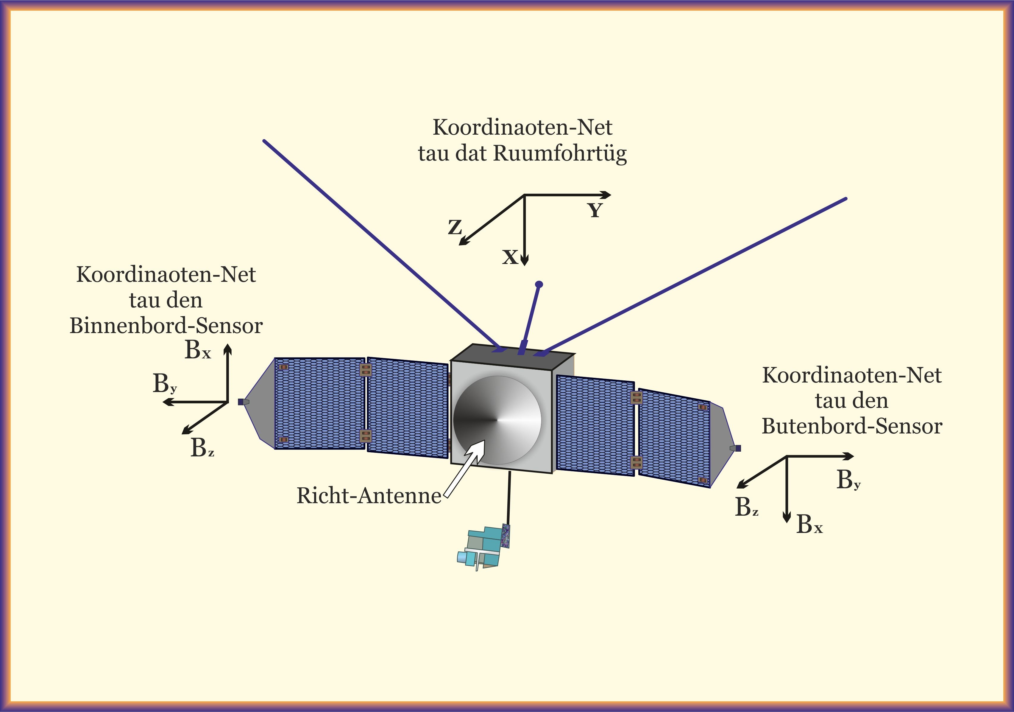 Maven-Sonde und Koordinaotensystem Dei Sondenkapsel un dei z-Assen sünd an der Richt-Antennen-Hauptstraohlrichtung utrichtet. Dei x- un y-Assen ligget in dat Plaonfeld van dei vördersten Plattform. Dei Solarplaoten-Gelenkassen ligget parallel tau dei x-Assen van dei Sondenkapsel.