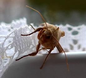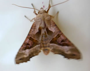 Dor seet doch wohrhaftig in de Gardin vun't Kökenfinster en Uul! Keen grote Uul mit en Fedderkleed, ne, en Nachttuul. Dat weer en Nachtfalter. So en smucke Uul heff ik dat eerst Mal to Gesicht kregen.