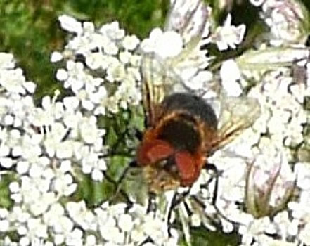lütt Wanzenfleeg seet up en witt Doldenblööt vun de
