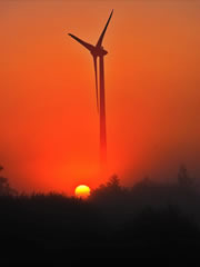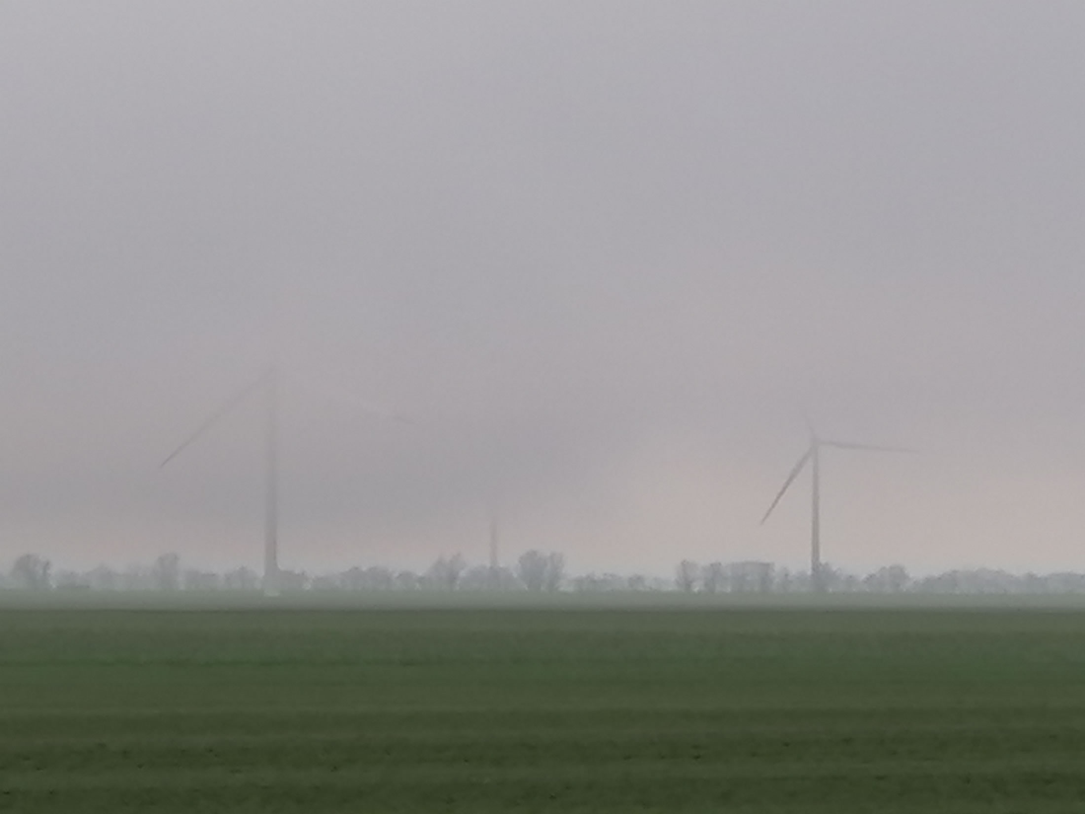 De Sünn un dat Windrad seht beid ut, as wulln se hooch opstiegen. De Harvstnevel licht sik. Dat grote Radnett vun de Krüüzspinn hett den Nevel infungen un glinstert in de eerste Sünn. So warrt se nich veel Büüt fangen, dat Nett is to good to sehn!