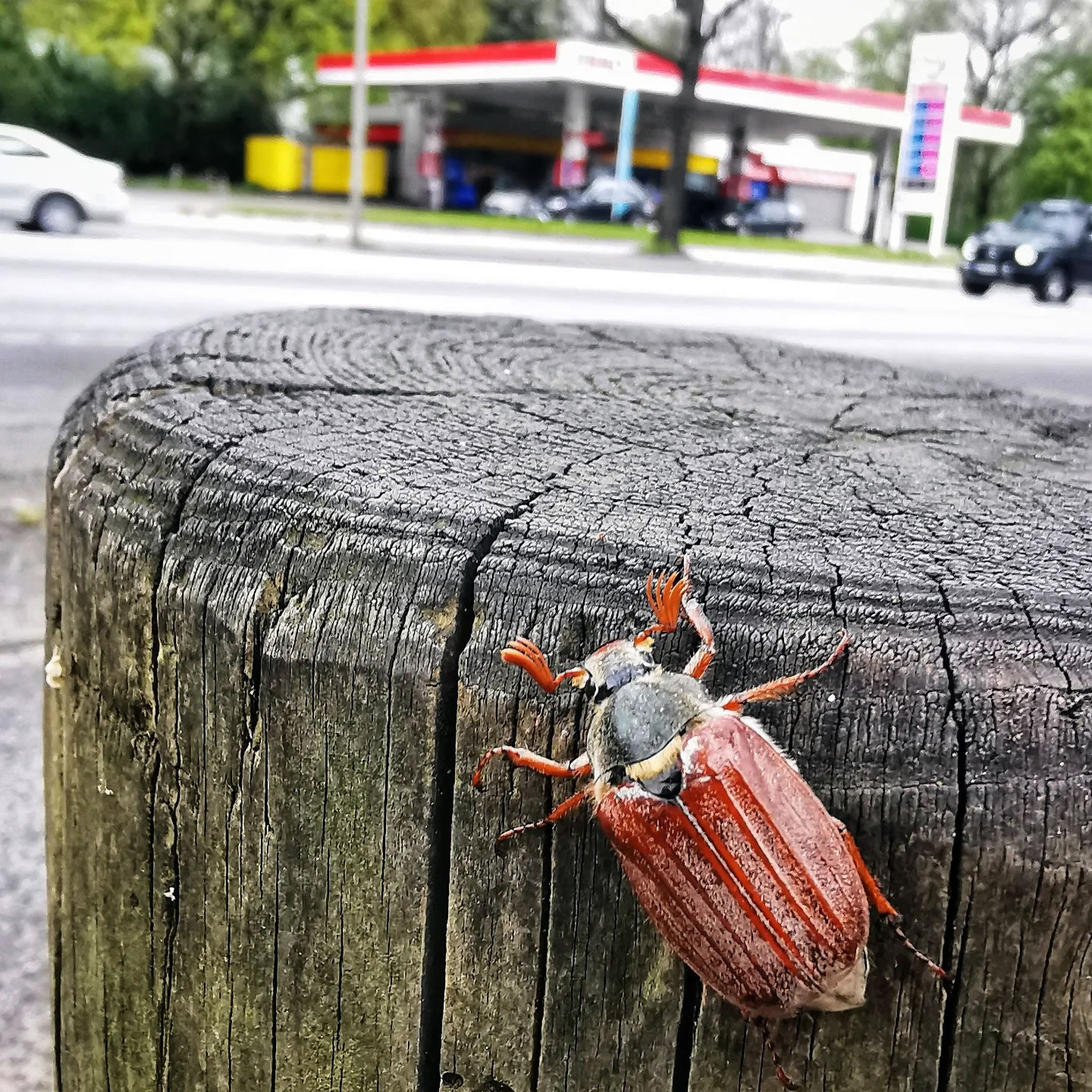 Mien Fohrrad-Plaan is heel un deel backsig vun de Linnenbööm vör uns Huus dat heet, vun dat Pipi vun de Blattlüüs, de in den Boom op de Bläder sitt. Un woneem de söte Blattluus-Pipi is, is de Larv vun'n Marienkäver nich wiet. Se bevölkert ok mien Plaan, un een hett sik sogor op mien Balkon verbiestert. Dor heff ik mien Besökersch en Stück Aprikosen-Pell henleggt. Se hett mit Weel vun den söten Saft runüm fröhstückt un ok an de Schaal nascht. So'n lecker Backskraam is doch wat anners as Lüüs-Pipi! Dat Bild köönt