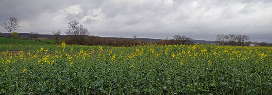 Kiek an, dor is doch wohraftig al en gele Schemer op den Raps! De eersten kiebigen Rapsblöden sünd dor un kiekt sik mal de Welt an. Un de Welt is sünnig avers dröög. Över den Raps gaukelt de eersten Bottervagels, hooch baven dreiht de Gavelsteert sien Krinken, de Milan man de Grund is hart un knökern, un wenn dat nich bald regen deit, hebbt de Raps un de Deerten keen godes Leven. Dat Bild köönt Se per Klick vergröttern! Marlou Lessing |