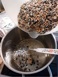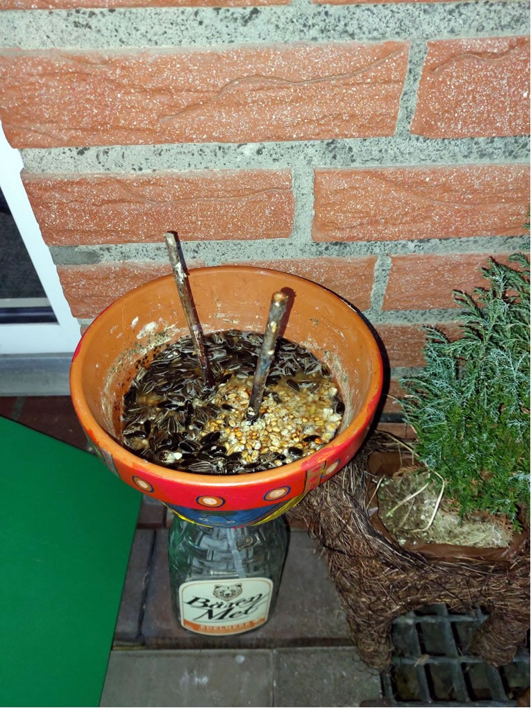 Ik heff ehr utschüddt ut den Deckel baven, un se is foorts wegsluppt. De Vagelröhr mutt ik reinlich maken un höger hangen. De Muus is op mien Terrass willkamen, avers se schall vun dat leven, wat de Vagels rünnerfalln laat. De Biller köönt Se per Klick vergröttern! Marlou Lessing |