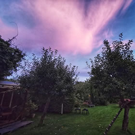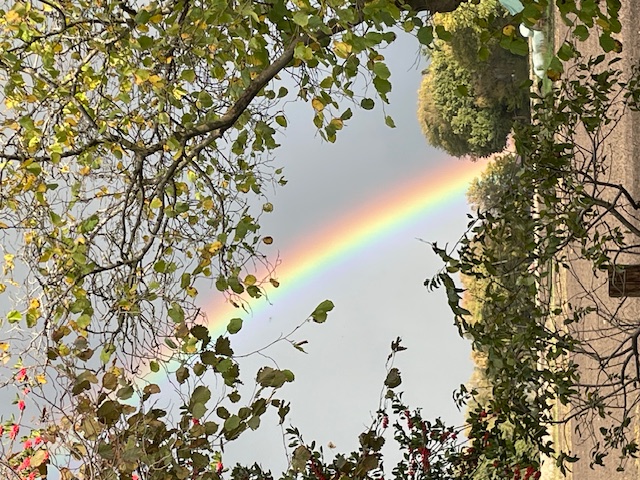 Na en avendlich Gewitter bi deep stahn Sünn wies sik gistern een vun de intensivsten Regenbagens, de ik sehn heff. Knipst heff ik em dör de Schiev. De twete Bagen is ok good to kennen (in't Foto links). De Regen driev noch in fiene Wulken in den helleren Ruum in't Bagenbinnere. En Bagen, de sik sehn laten kann, meen ik. Dat Bild köönt
