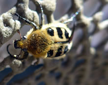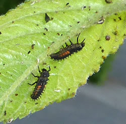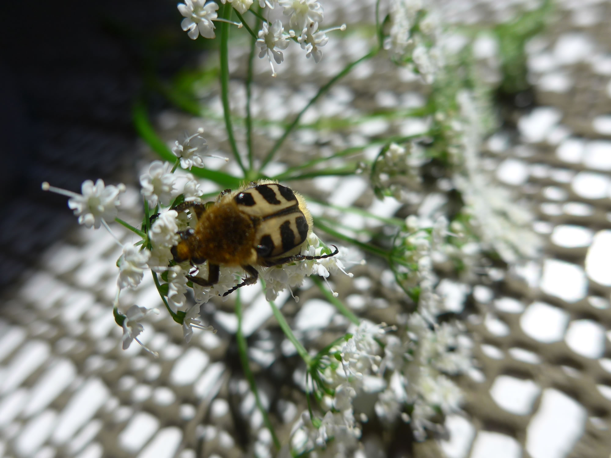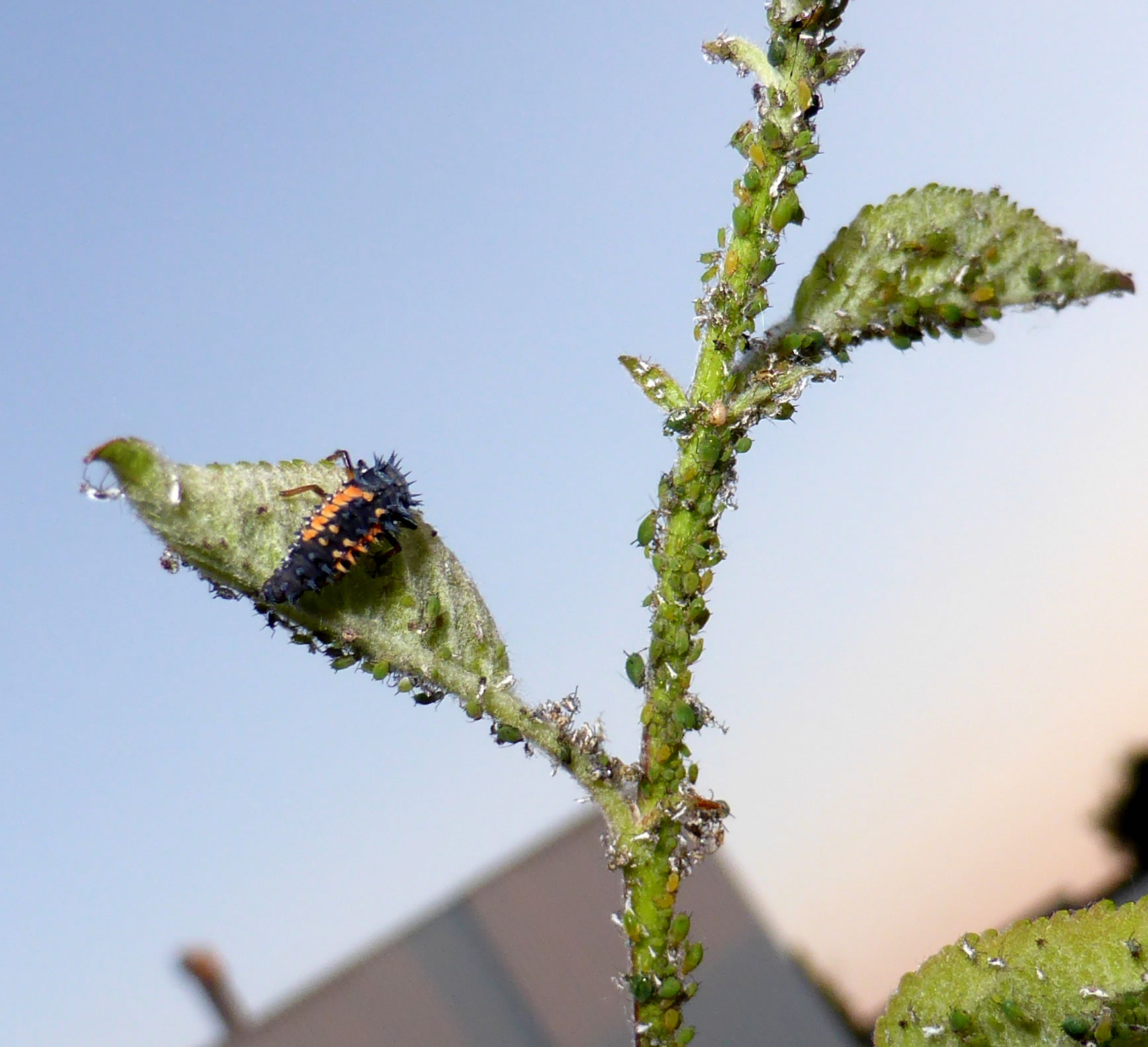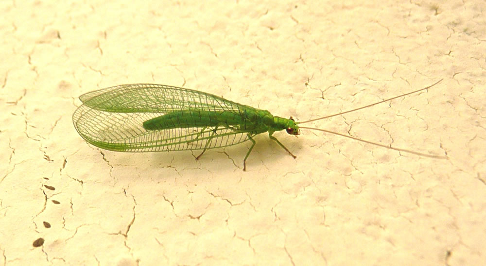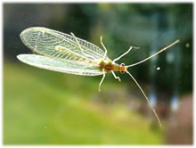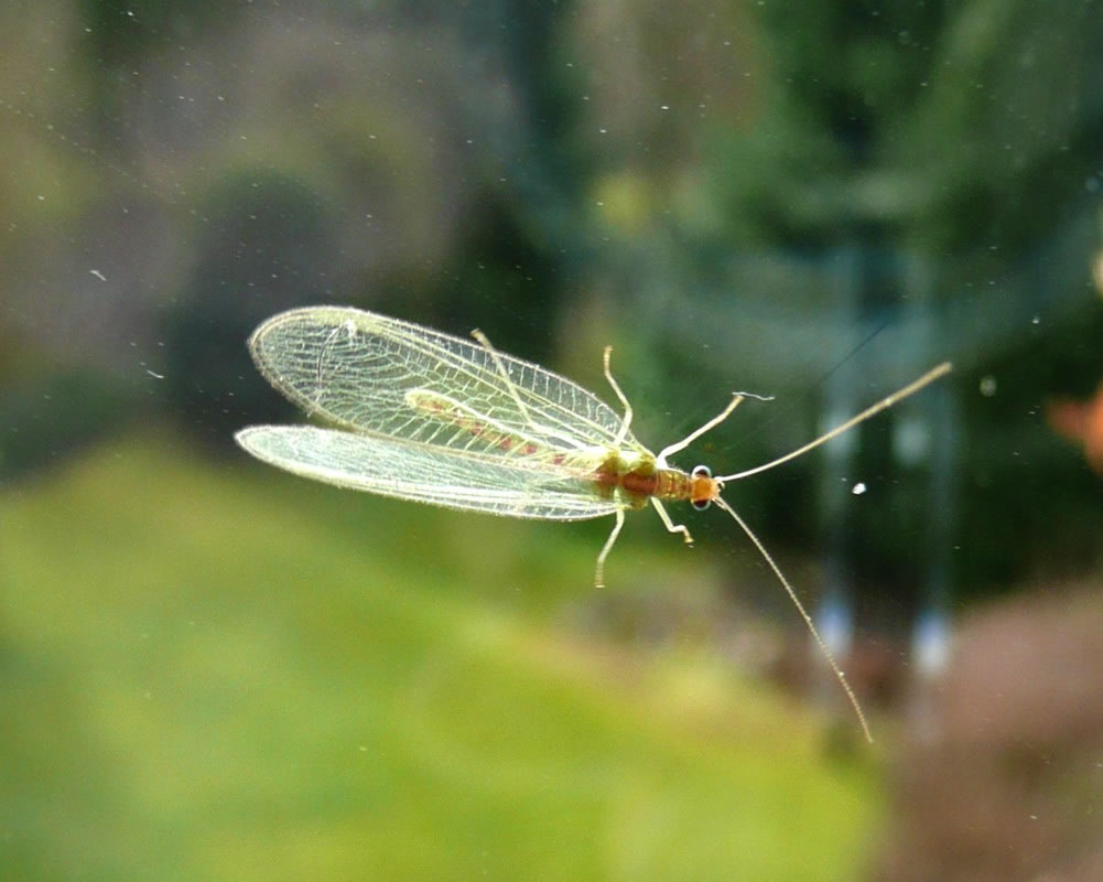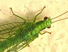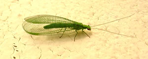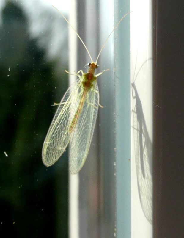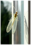 Hett denn so'n Larve 2 bet 3 Weken lang uns Blattlüüs upfreten, denn spinnt se sik in en Kokon in. Dor schlüpft denn de schimmern gröön Florfleeg rut, un de süht ut, as weer se ene "Elfe". Biller: Antje Heßler. De Biller
