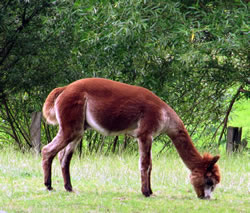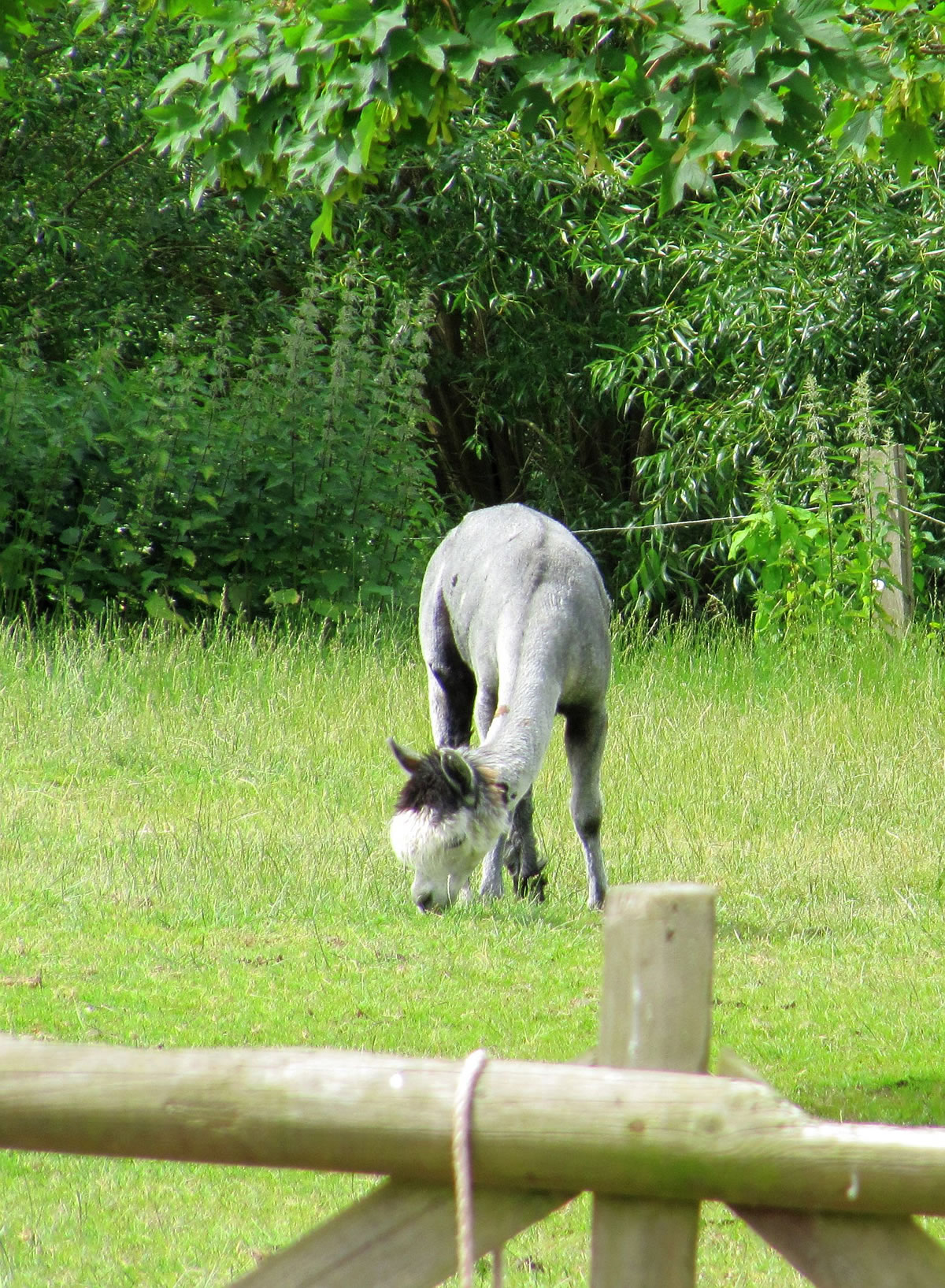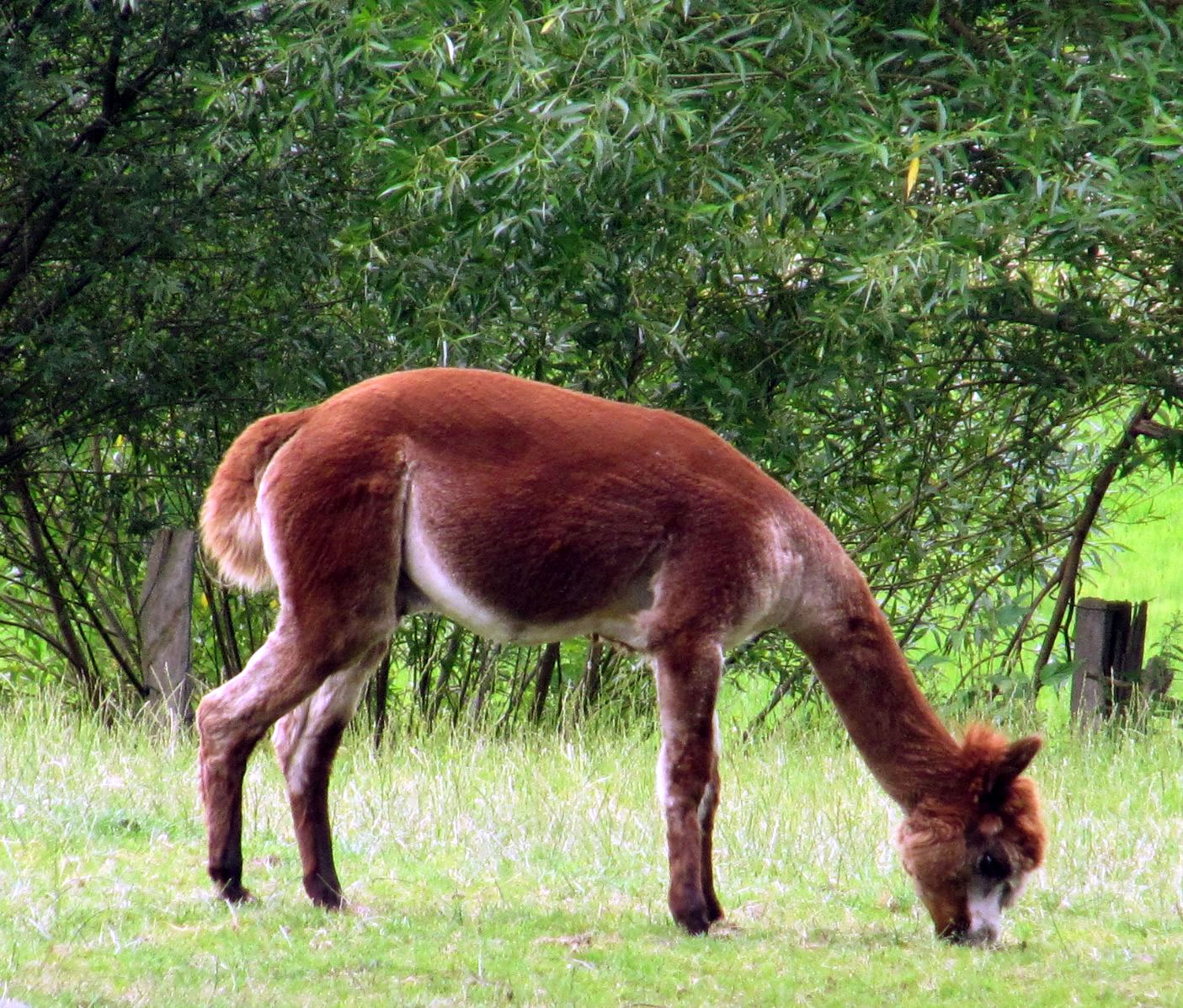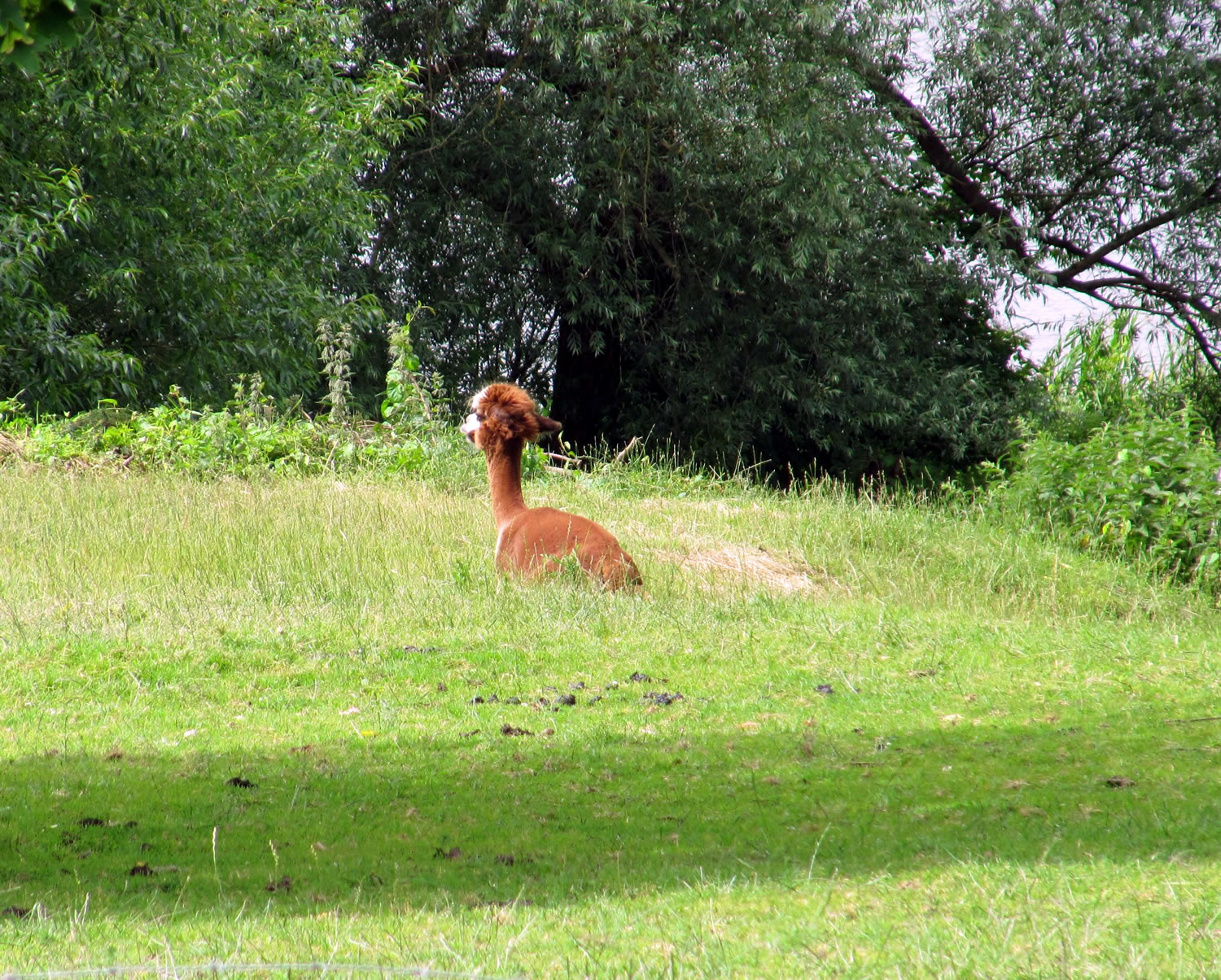nich so dicht ran!" Later hett man uns vertellt, dat dit Deert en Alpaka weer. Un dor weer noch tweet Alpaka. Un Alpakas höört to de Familie vun de Kamele. Un Alpakas geevt 'ne wunnergoot, weke, warme Wull. Un disse beiden Alpakas hier, de harrn graad de Wull afschoorn kregen. Ik segg ja, een mütt sik wunnern, wat een so allens övern Weg lopen kann! De Biller köönt Se per Klick