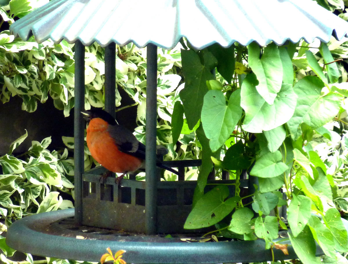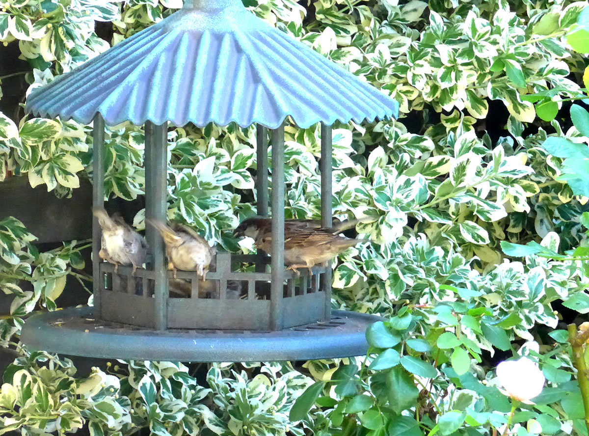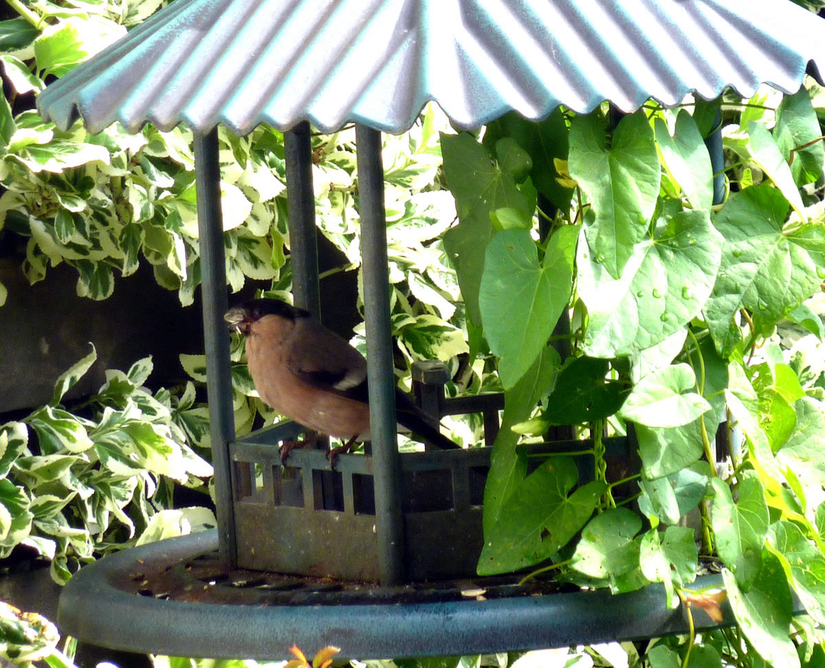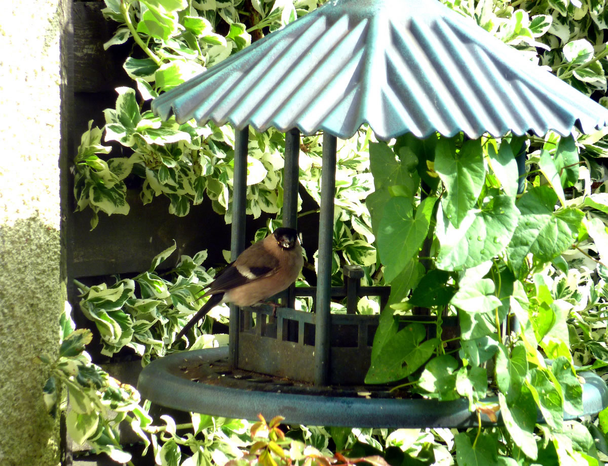 31.8.14 .... Vagelampel in'n Sommer De Vagelampel weer in't Fröhjohr eenfach up de Terrass hangen bleven. Ünner de Ampel weer en Rosenstock ranwussen. De stütt de Ampel bi Storm. Üm den Rosenstock rankel sik en Ackerwinn. Mit ehr gröne Bläder bedeck se de Galerie vun de Ampel. Dor kunnen sik de Vagels un ok anner Veehtüüch goot achter versteken. Mank dat Gröön möken sik de bunten Vagels besünners goot. Dat weer en Freud, wenn de Dompfaff sik mit sien Fru dor dat Foder haal. De beiden weern düssen Sommer besünners oft to Besöök. Een Dag bröchen se ehr Kinner mit. Twee junge Dompfaffenkinner! De seten baben up de Muur un betteln mit liesen "di, di, di" üm Foder. De Öllern keken ut de Vagelampel un locken ehr Kinner. Aver de weern noch bannig schuuch. Se leten sik noch dat Foder vun de Öllern bringen.
