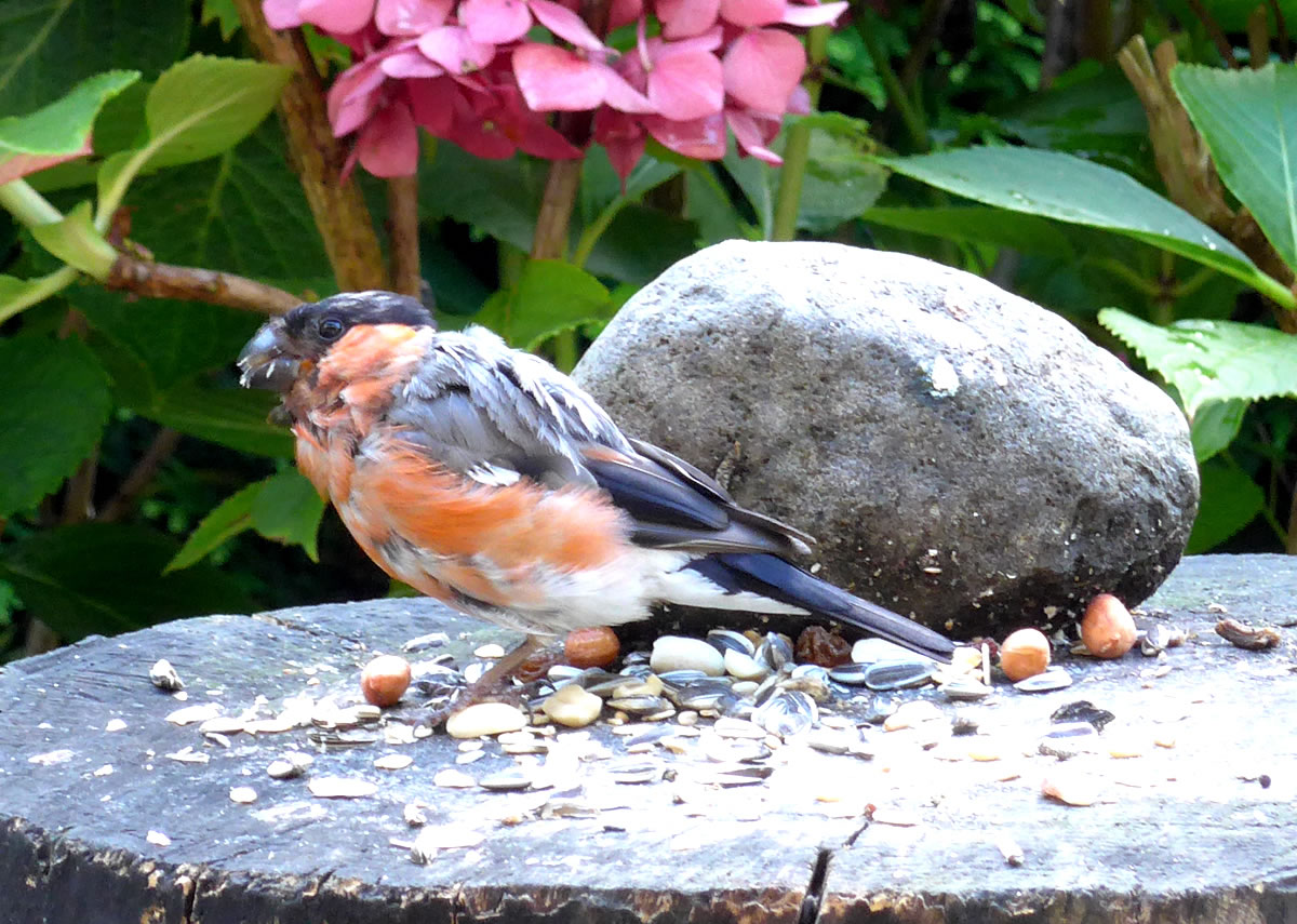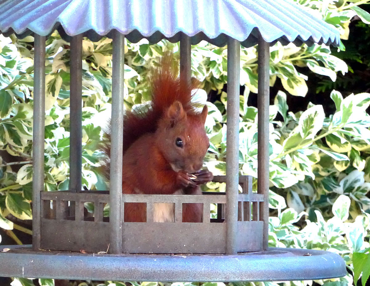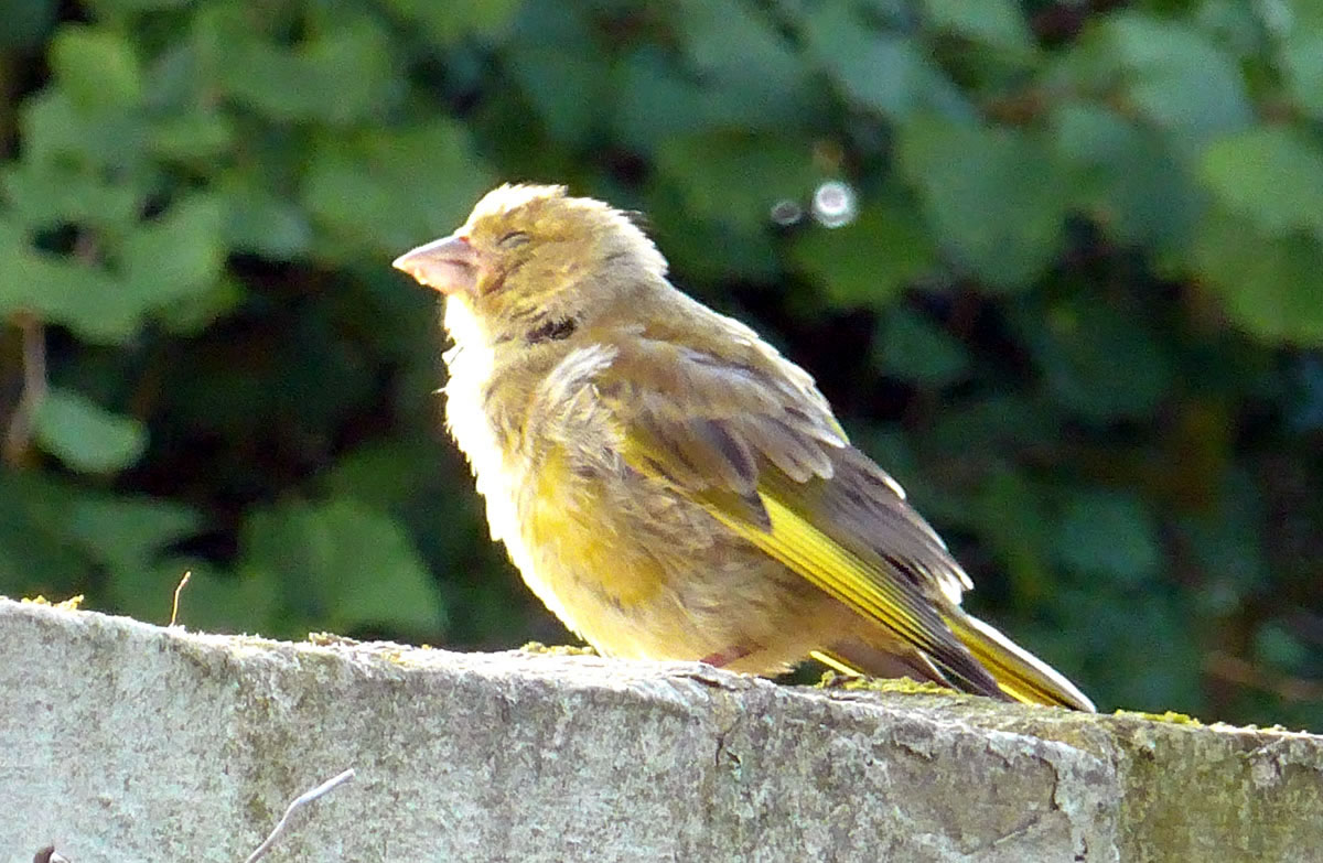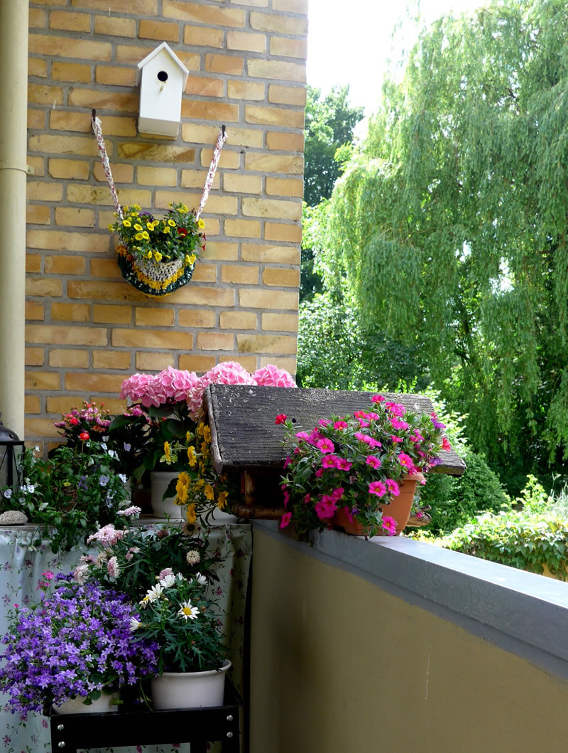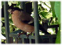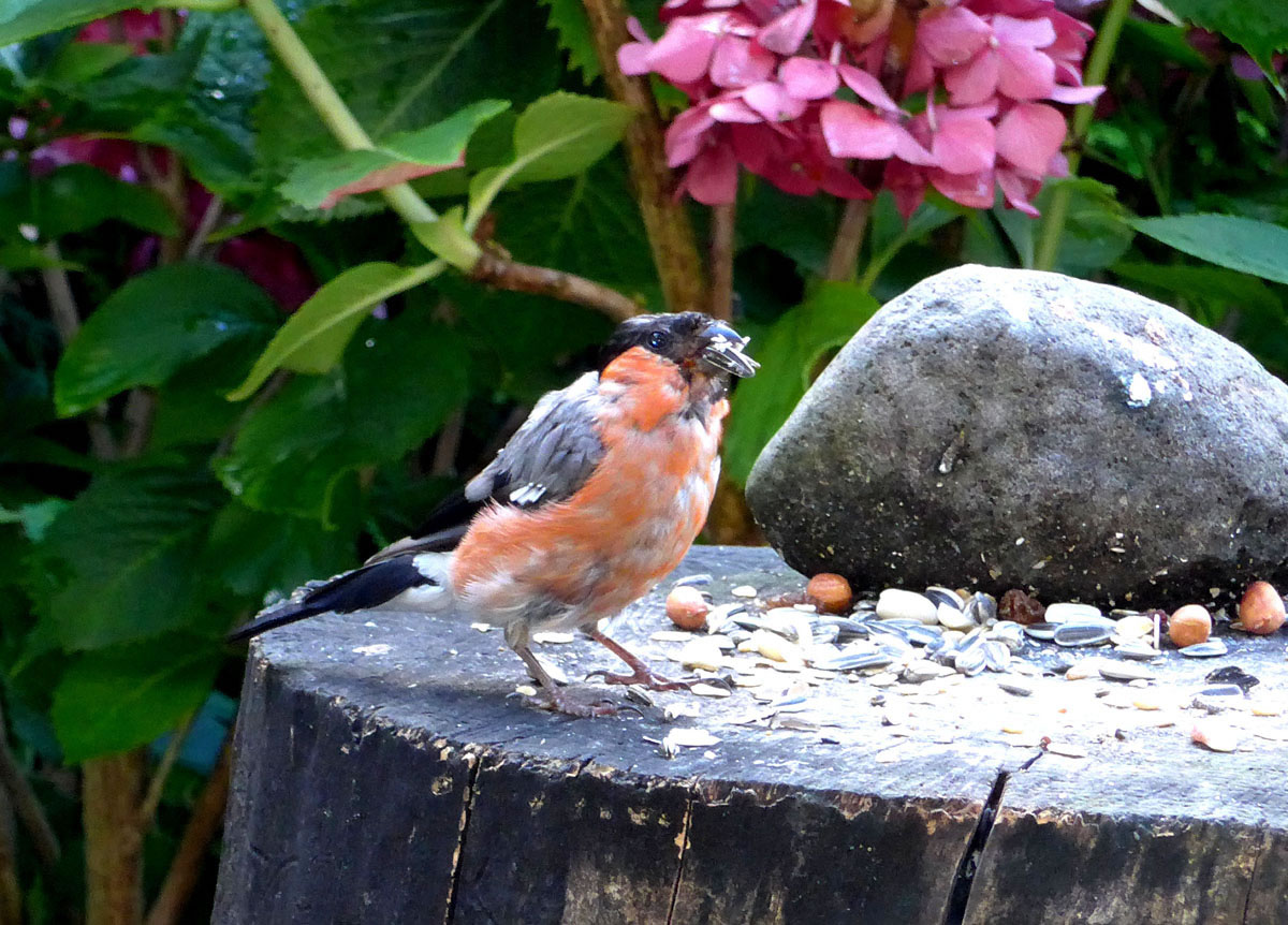 31.8.14 .... Vagelampel in'n Sommer De Vagelampel weer in't Fröhjohr eenfach up de Terrass hangen bleven. Ünner de Ampel weer en Rosenstock ranwussen. De stütt de Ampel bi Storm. Üm den Rosenstock rankel sik en Ackerwinn. Mit ehr gröne Bläder bedeck se de Galerie vun de Ampel. Dor kunnen sik de Vagels un ok anner Veehtüüch goot achter versteken. Mank dat Gröön möken sik de bunten Vagels besünners goot. Dat weer en Freud, wenn de Dompfaff sik mit sien Fru dor dat Foder haal. De beiden weern düssen Sommer besünners oft to Besöök. Een Dag bröchen se ehr Kinner mit. Twee junge Dompfaffenkinner! De seten baben up de Muur un betteln mit liesen "di, di, di" üm Foder. De Öllern keken ut de Vagelampel un locken ehr Kinner. Aver de weern noch bannig schuuch. Se leten sik noch dat Foder vun de Öllern bringen.