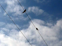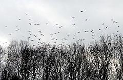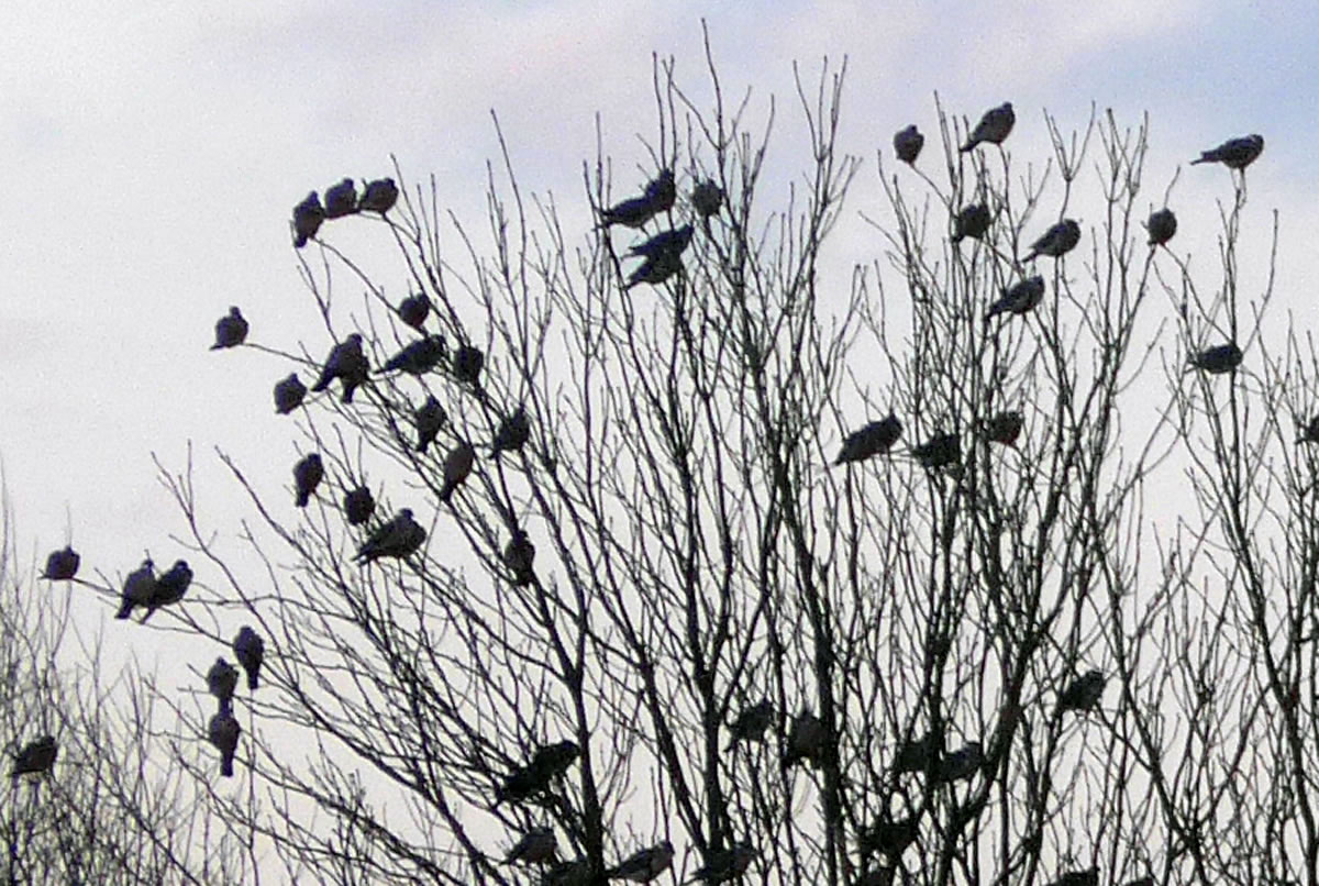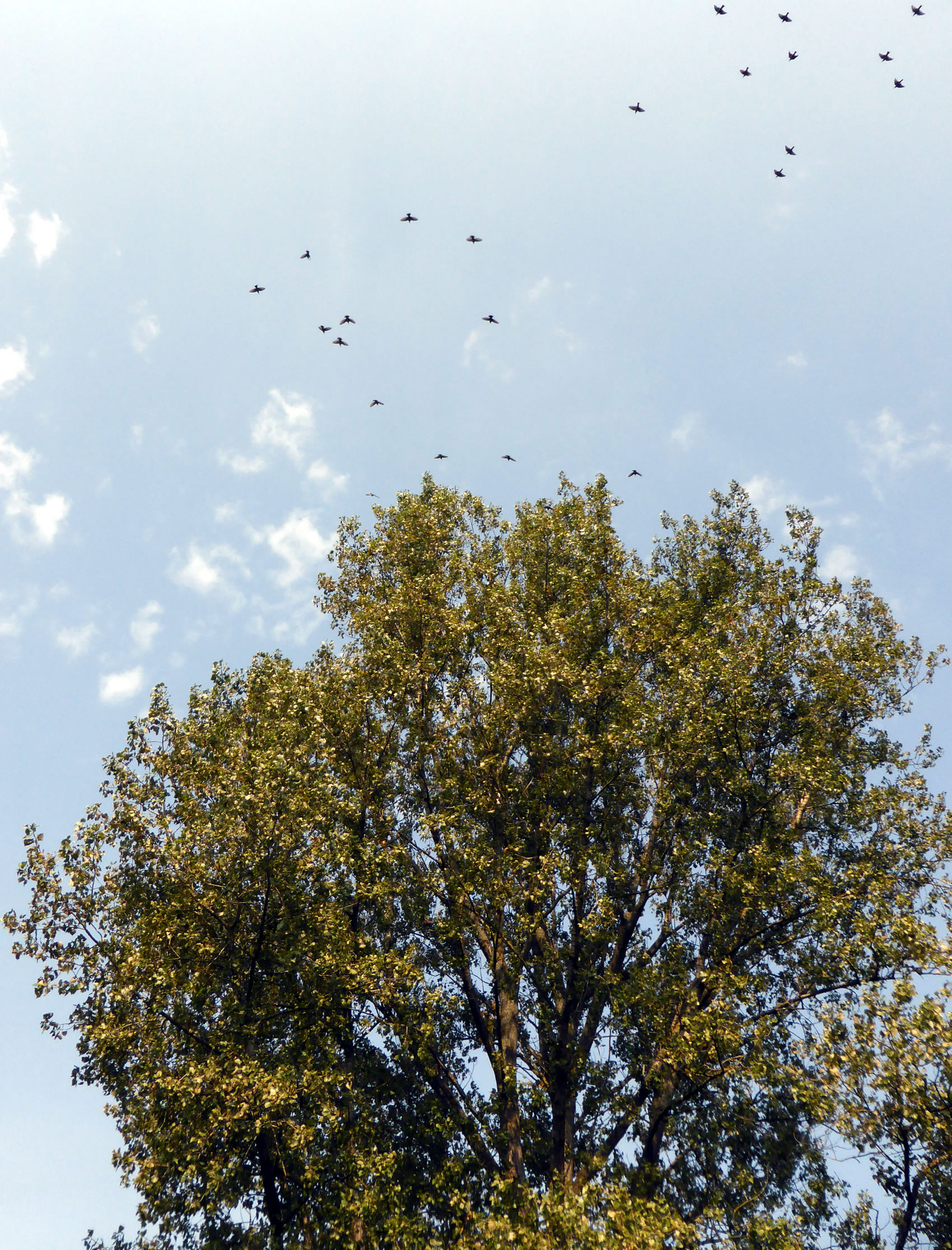 So lang swingt se sik dör de sünnigen Laatsommerdaag in lütte Koppels, swöögt welig dör de Lucht as Delfine in'e See, mal hier, mal dor. Se sünd op Reisen Urlaubsstimmung. Toeerst sünd se ganz tofreden, denn geiht sachten dat Gesnater los. In ehr frömde Spraak snatert se, sirrst un kakelt as verdull, hebbt sik veel to seggen, nich jümmers wat Fründlichs, dücht mi. De Krach duurt un duurt. Se hollt dat lang dör. Denn markst en Verännern: Dat Gesnater warrt hektischer un höger, stiggt an in en groot Crescendo; een Vagel lett sik to Siet ut den Boom falln, noch een folgt; een Momang vun Stillswiegen un denn de grote Exodus: As en Wulk, as en Schadden fallt de ganze Vagelswarm miteens ut den Boom un swingt sik weg in Welln, en eenzig groot Gedanke... Ik kann nich fix noog knipsen. De Pappel steiht noch dor, nich merklich kahler woorn. Man liesen is dat woorn; höörst wedder de Pappel ehr egen Stimm, ruug un sacht, rusen. De Biller köönt Se per