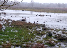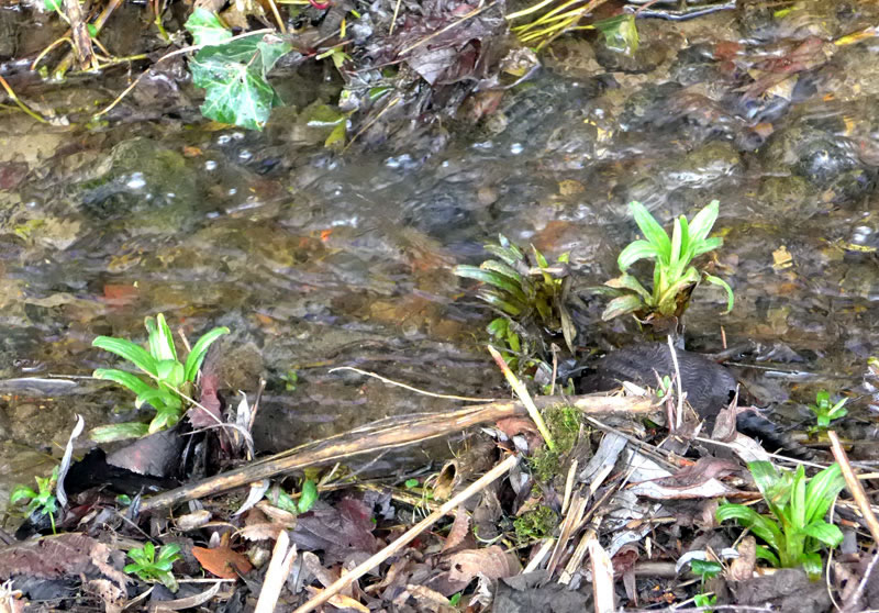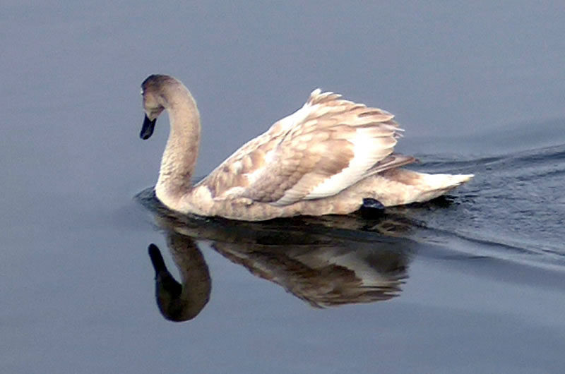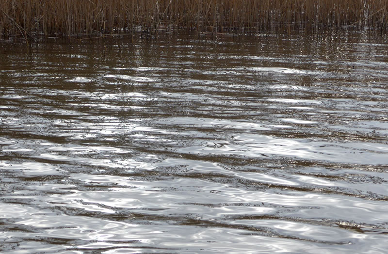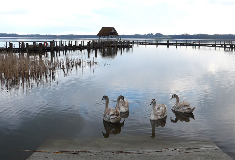 An annern Dag wöör he vun warme Sünnenstrahlen waak. En Blick ünner Modders Fedderkleed na buten geev em Moot. Mit enen Sprung vun dat Nest hindaal sprung he in dat blanke Water meern maank dat Schilf. Dat güng beter as he dacht harr. Luder Kringel harrn sik üm em bild. Mit sien groten Fööt paddel he nu mank de Schilfhalme in enen lütten intüüntes Waterbecken.