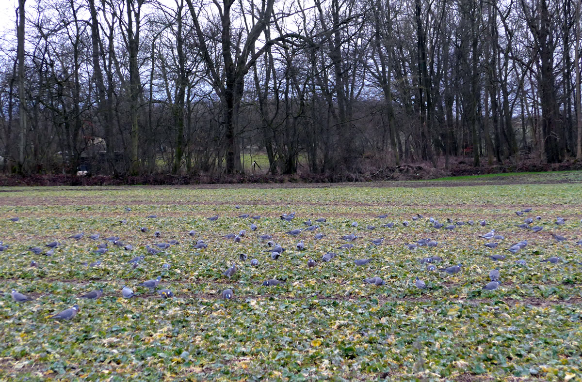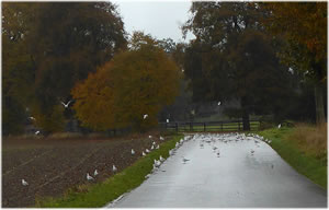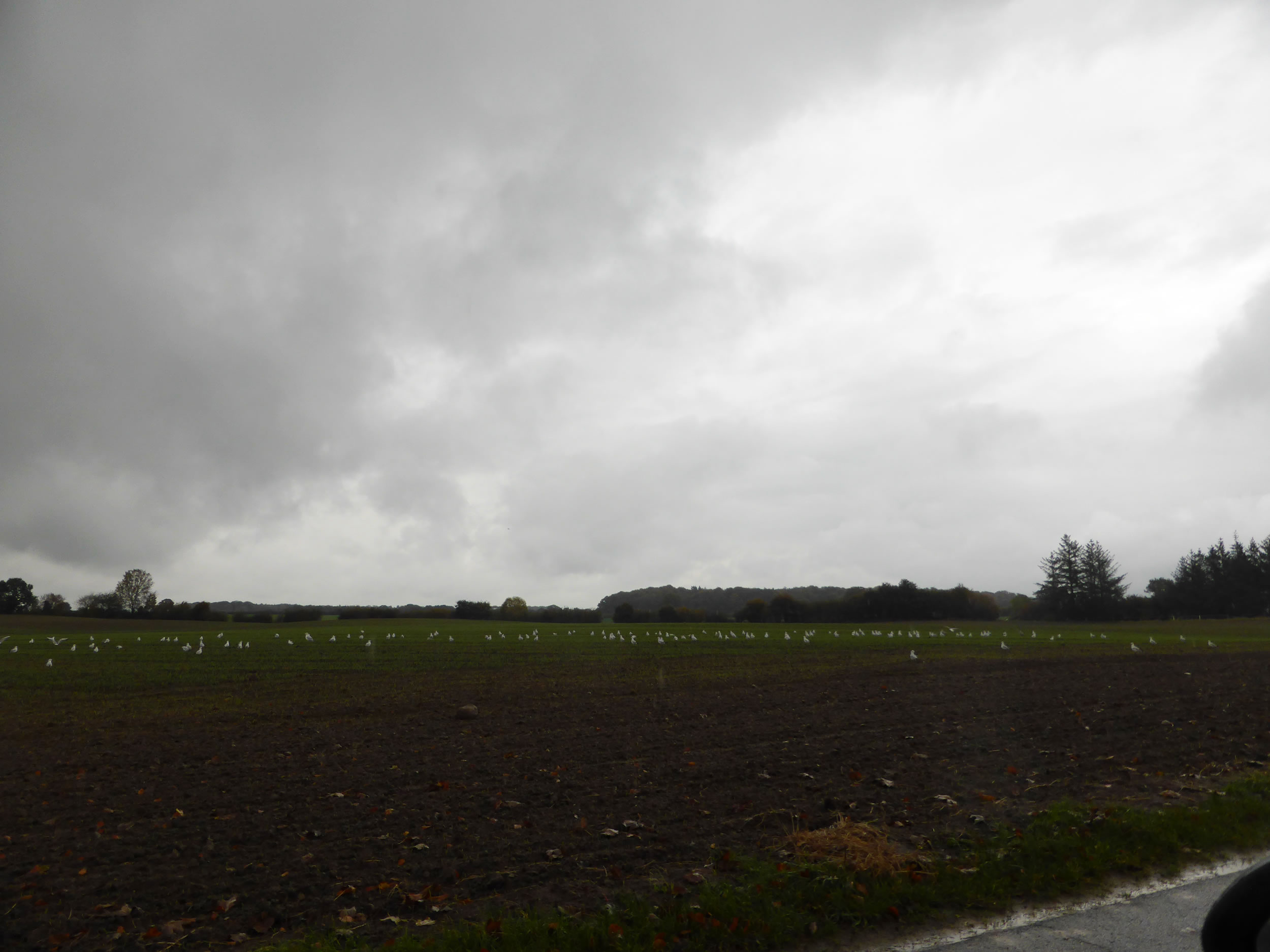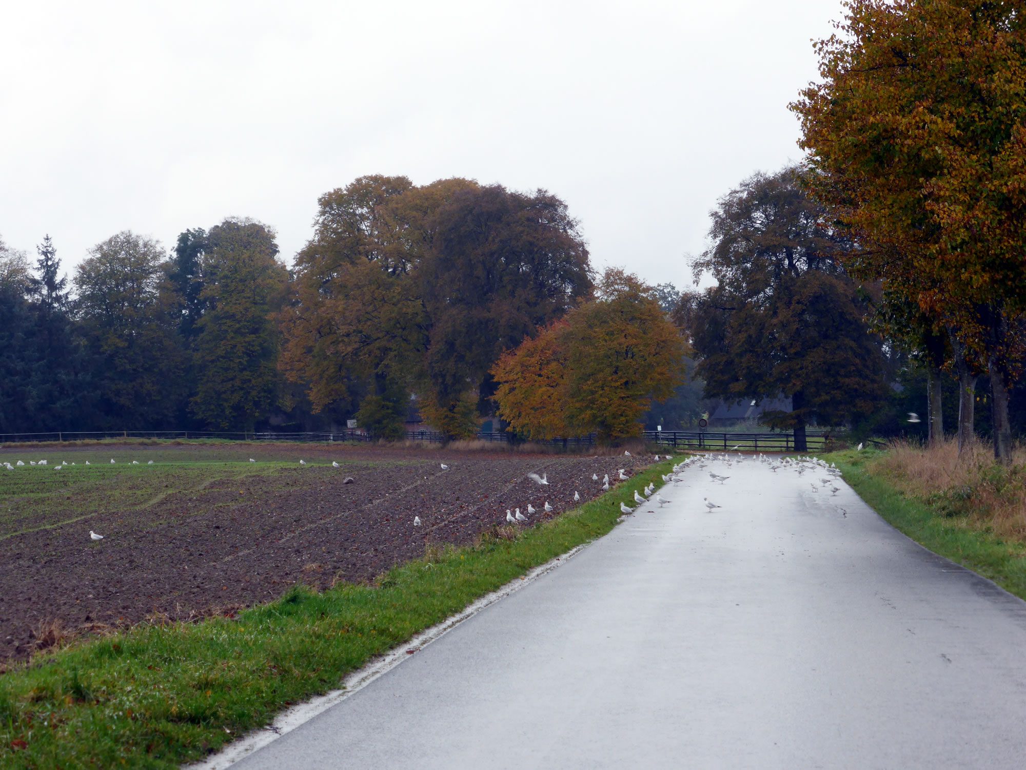 Un all kiekt se na een Richt: na linkerhand op de Acker to, 'neem achter en Striepen, den se frielaat, noch teihnmaal mehr Möwen sitt un all Richt Horizont kiekt, as geev dat dor wat ümsüss orr as wöör dor glieks en Popstar optreden. All de Möwen op dat Feld dreiht mi glatt den Rüch. Ik kiek ok na'n Horizont, de Wulken seht na Regen ut, avers en Tornado orr sowat is dor nich. Natüürlich hebbt se mi denn doch dörlaten, as ik vörsichtig dör den Pulk stüert heff. Wat kann dat west ween? Hebbt Se sowat al mal sehn? De Biller köönt Se per Klick