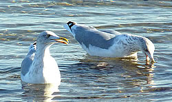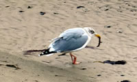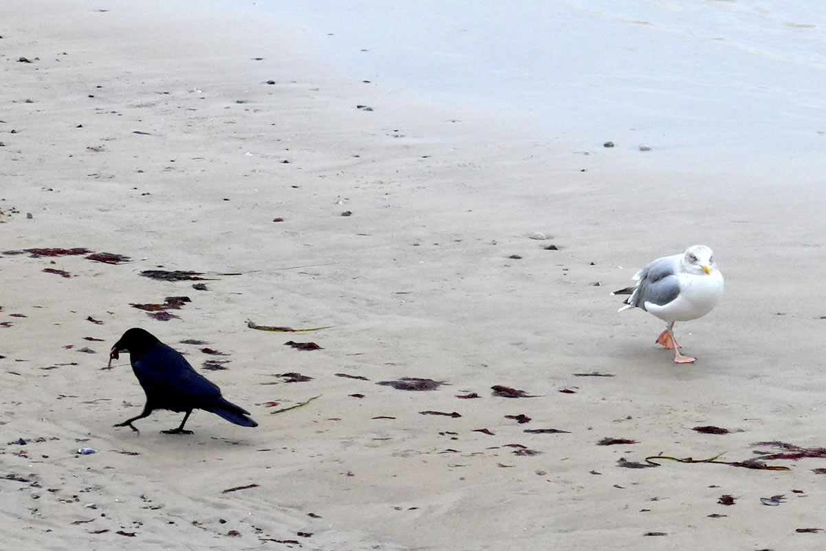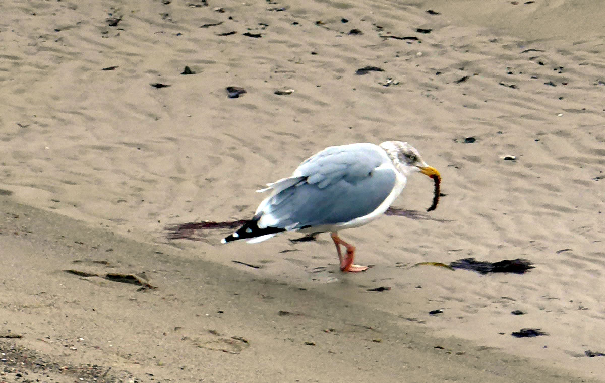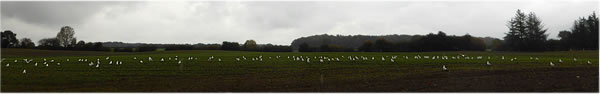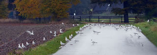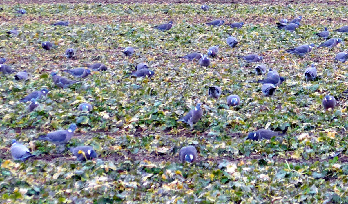 Un all kiekt se na een Richt: na linkerhand op de Acker to, 'neem achter en Striepen, den se frielaat, noch teihnmaal mehr Möwen sitt un all Richt Horizont kiekt, as geev dat dor wat ümsüss orr as wöör dor glieks en Popstar optreden. All de Möwen op dat Feld dreiht mi glatt den Rüch. Ik kiek ok na'n Horizont, de Wulken seht na Regen ut, avers en Tornado orr sowat is dor nich. Natüürlich hebbt se mi denn doch dörlaten, as ik vörsichtig dör den Pulk stüert heff. Wat kann dat west ween? Hebbt Se sowat al mal sehn? De Biller köönt Se per Klick