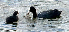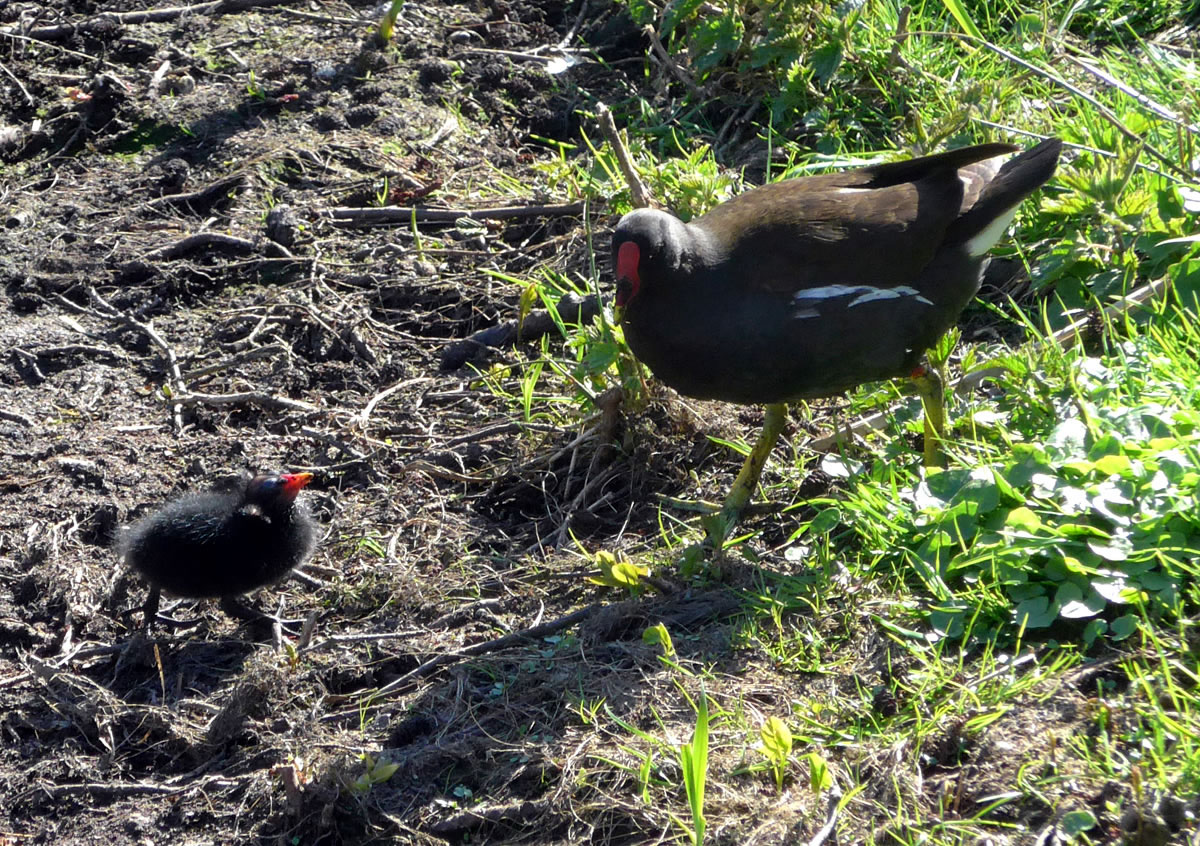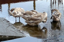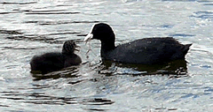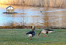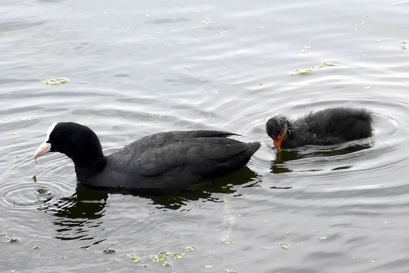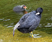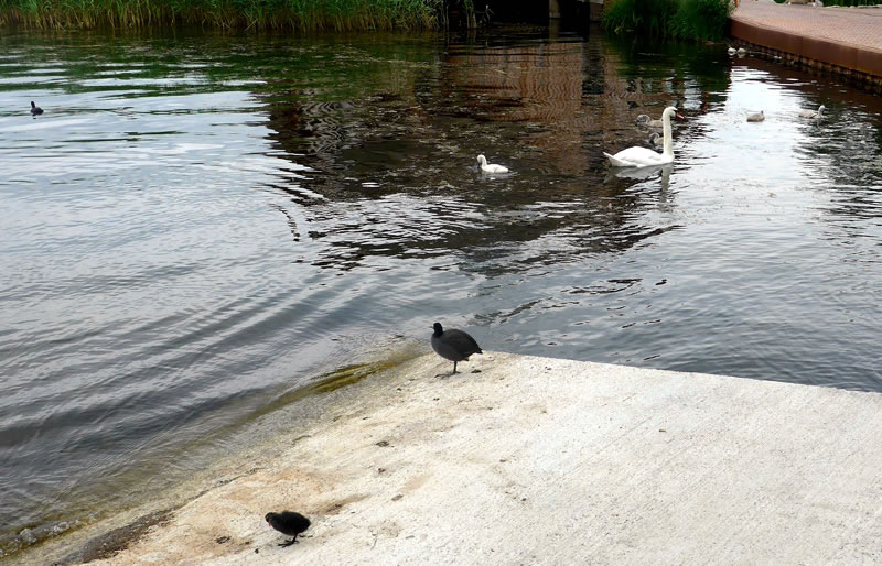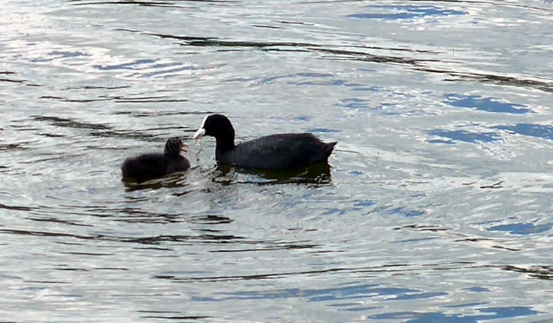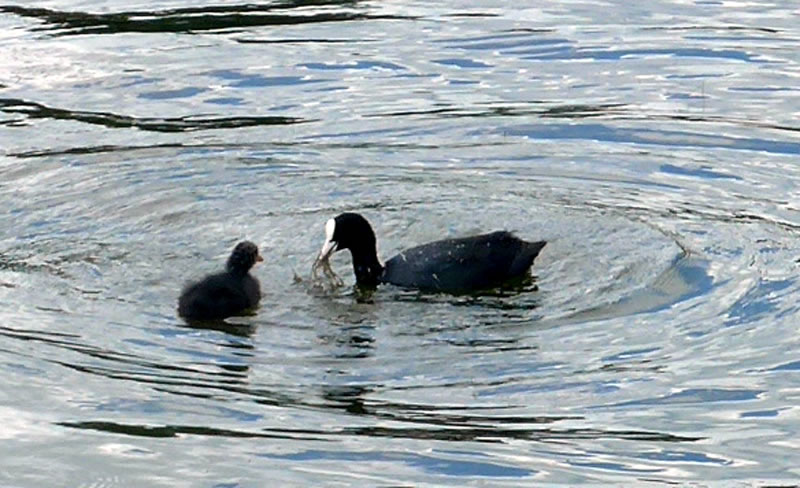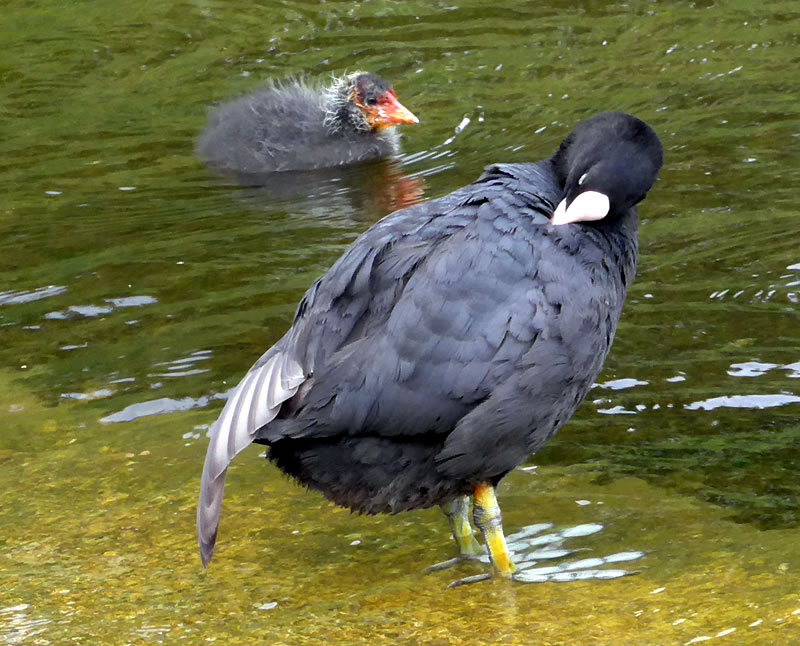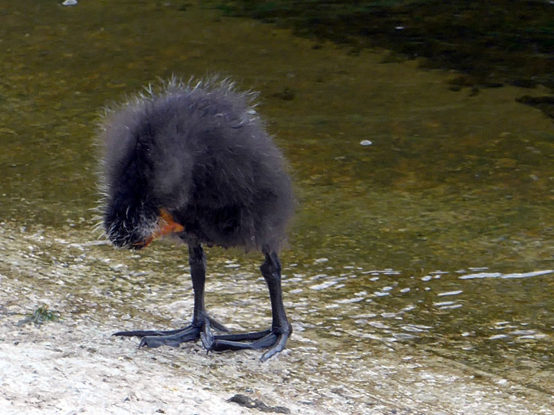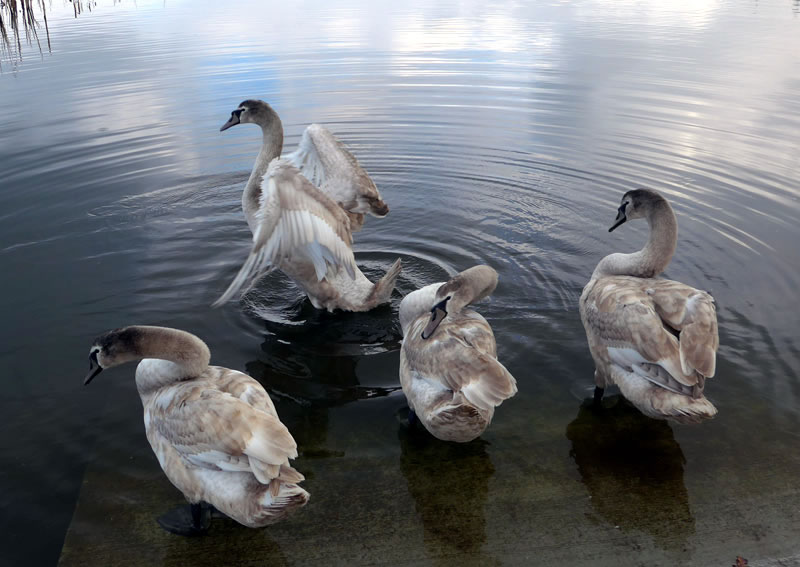 Wat en Glück, dat he dor sien Vadder dreep. De hett em bi dat Söken na Foder holpen. Dat weer doch ornlich wat lichter. In dat Waterbecken weern ok noch anner Watervagels. Swaans mit fief Kinner, Haubentaucher un noch welk ut sien egen Verwandschaap. Dor weer ornlichen Betrieb. Wenn se satt weern güng dat up so'n Steensockel in de Sünn.. Dat Fedderkleed müss doch drögen. De niegen Feddern pieksen dörch de Huut un dat jöök. Blessi kunn sik kuum bargen. He verdreih den Kopp un dreih sik hin un her. He versöch ümmer wedder de lästige Jöökeree los to warrn. Endlich harr he dat Geföhl, dat he keen niegen Feddern mehr kreeg un de annern sauber weern.Dat harr he vun sien Modder lehrt. He jump wedder in't Water. Dor luur al sien Vadder up em. Se müssen doch den See noch na niege Foderstellen afsöken! De Biller köönt Se per Klick