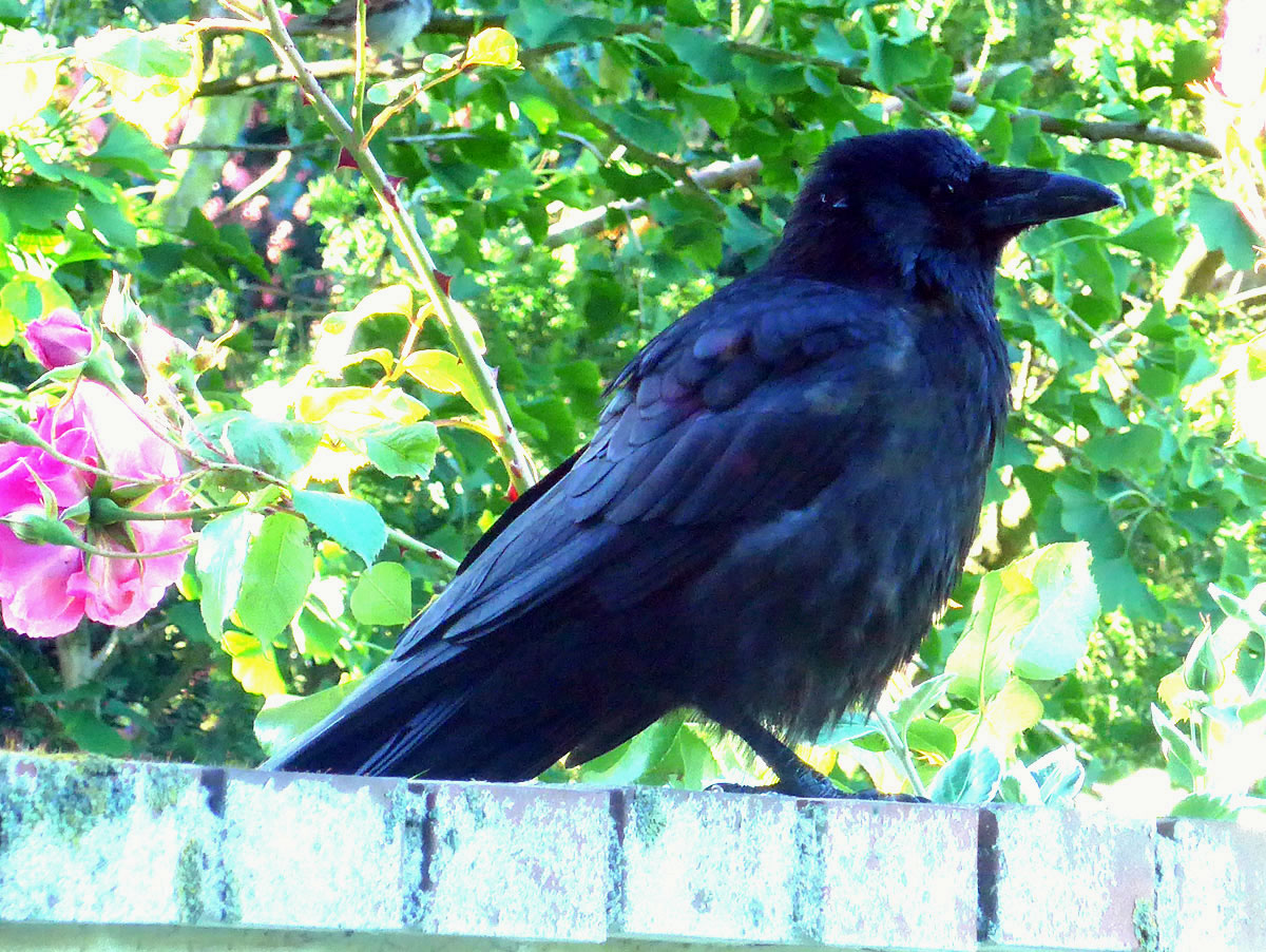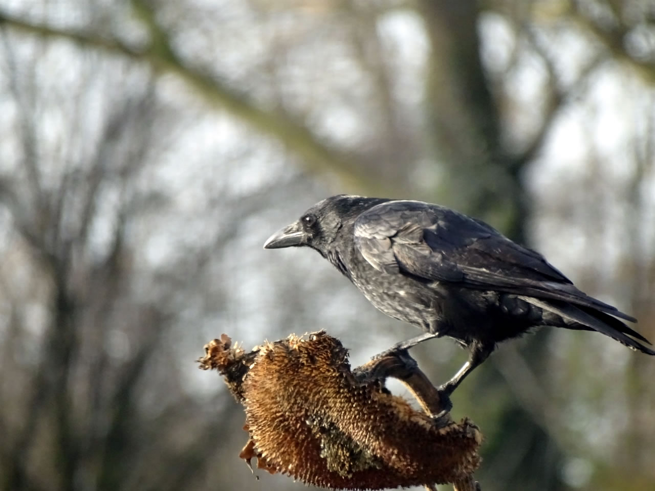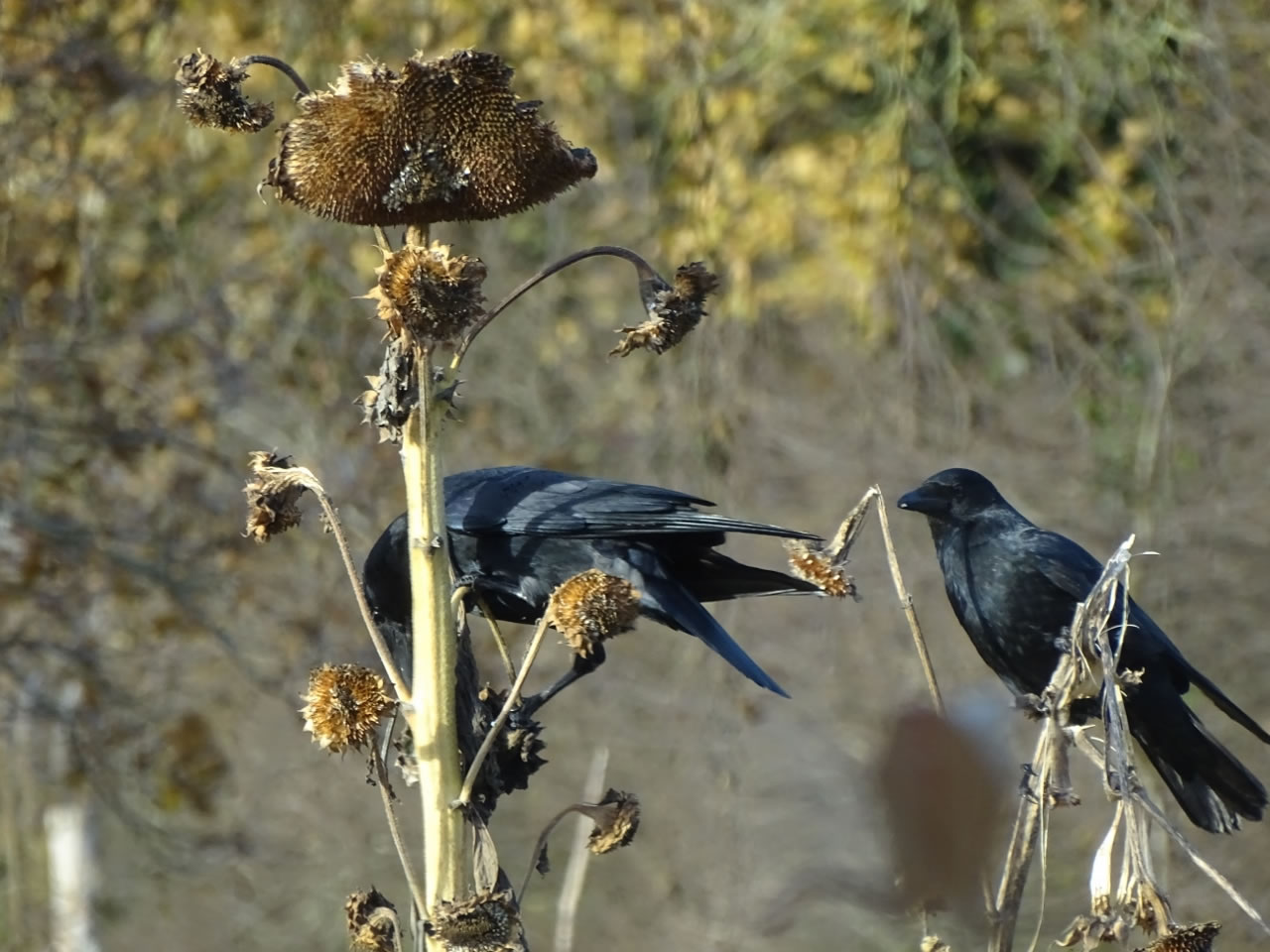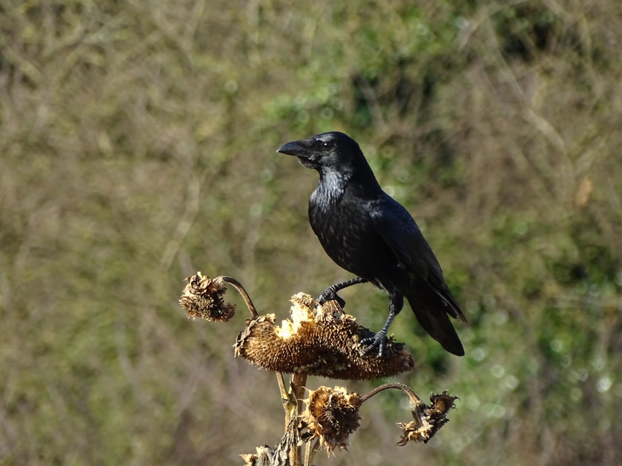 mal even kamen un kieken. Buten seten de Raven up de olen Sünnenblomen