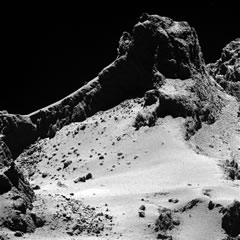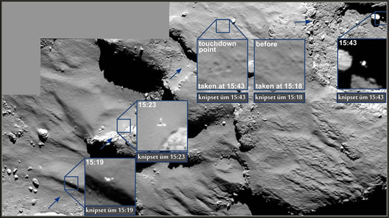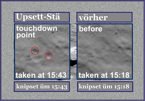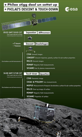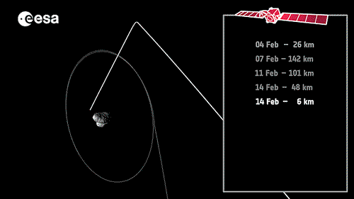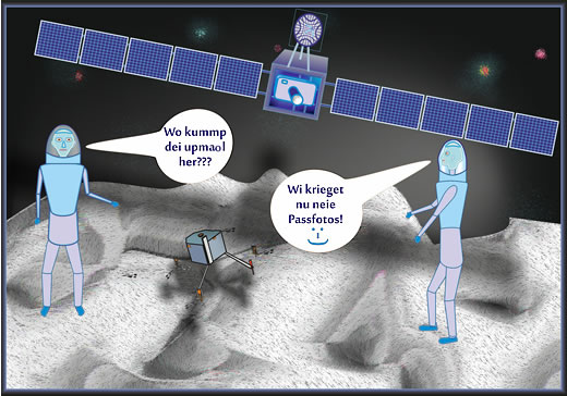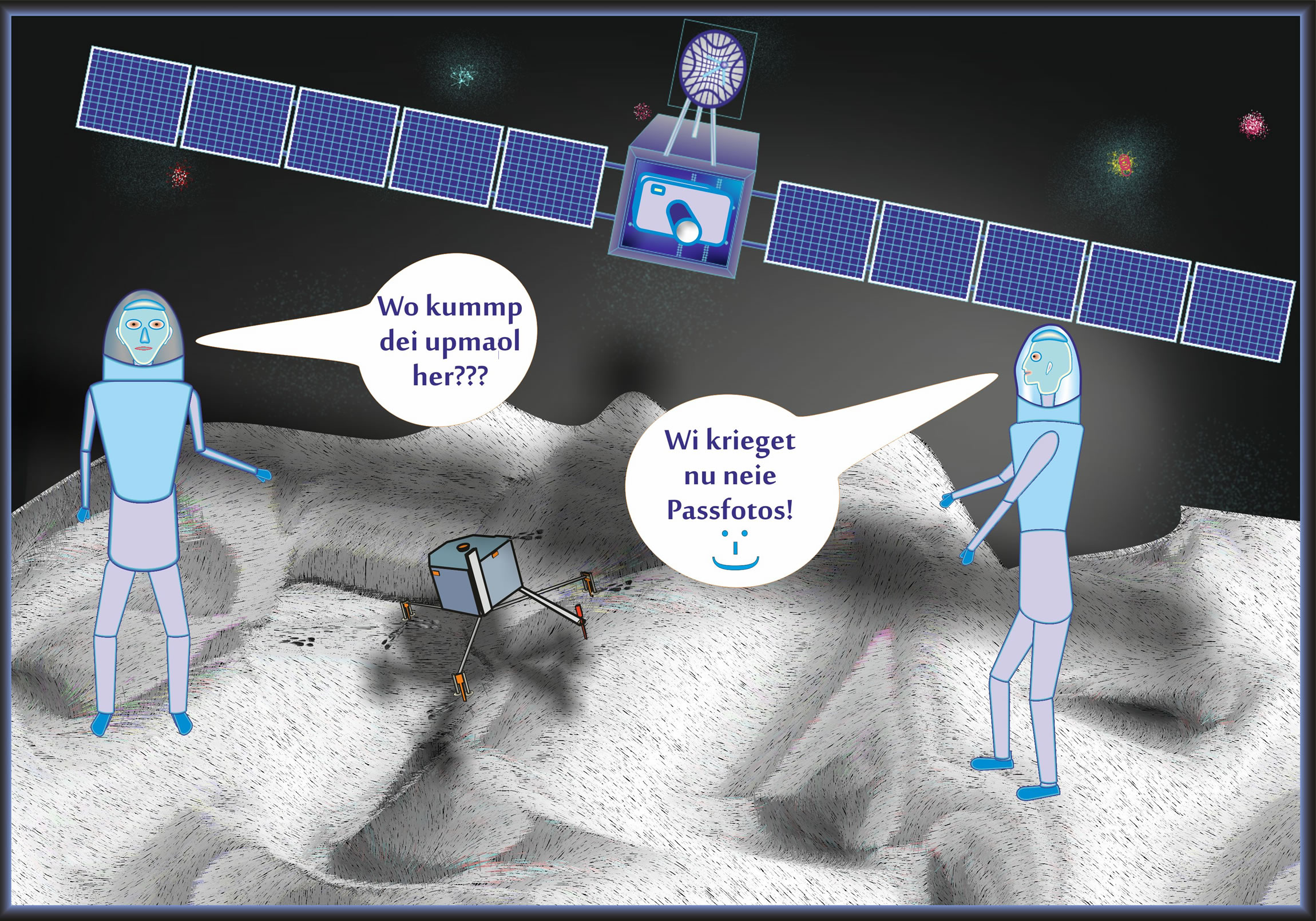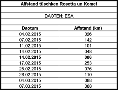30.9.16 ....Rosetta: Kurs för dat Tausaomestöten is fardig Rosetta hätt ehr leßtet Manöver affschlaoten un ist nu up den Weg för dat Tausaomestöten mit den Komet 67P / C-G (Tschuri). Eine lüttke Stür-Rakete werd üm 20.48 Uhr (Welt-Tied) för 208 Sekunnen brennen, dormit Rosetta up den passen Kurs kummp. Dei Navigation-Kameras van dei Sonde werd kort dornao eine Riege van fief Biller upnähmen dormit man süht, off dat Ruum-Schip den Kurs richtig hollt. So kann man uck bäter affschätzen waneiher dei Inschlag passeiern dait. Disse Biller schäöllt so üm 5.00 Uhr (use Sommertied) vörliggen. So kann man üm 6.00 Uhr (use Sommertied) mit einen Bericht van dei ESA räken. Ludgerd Lüske