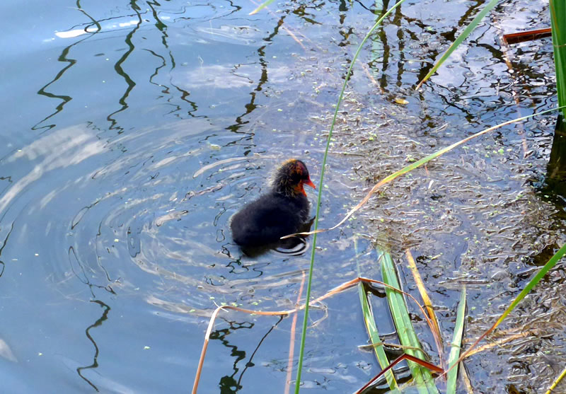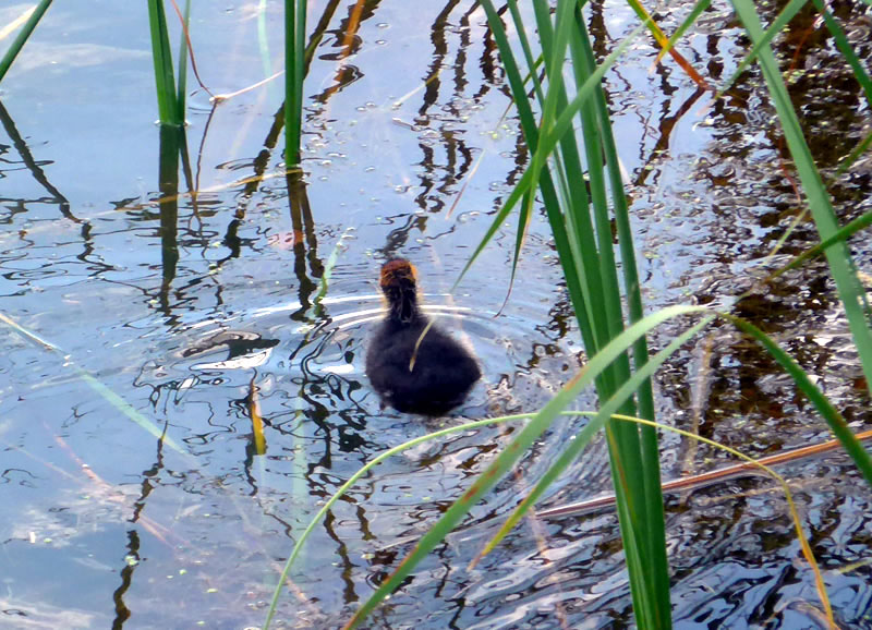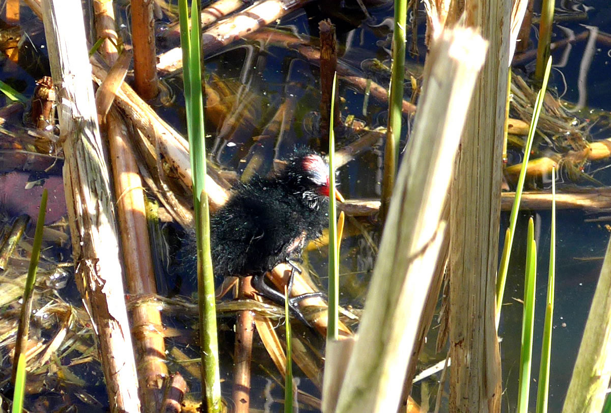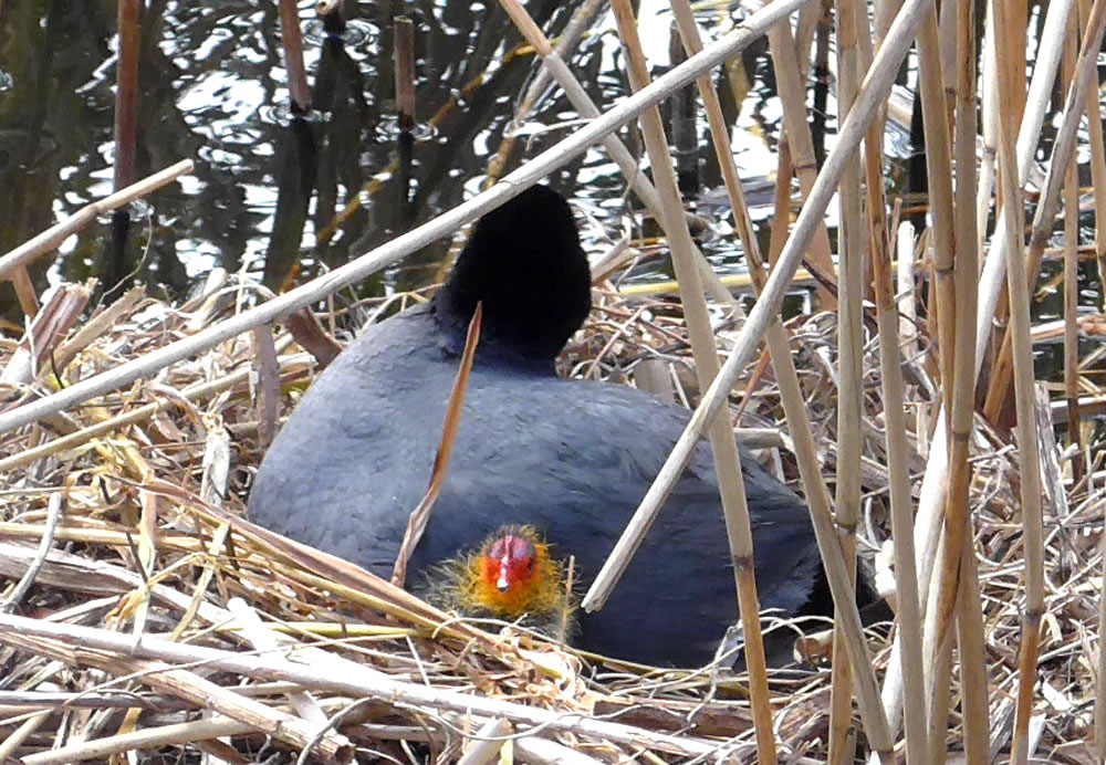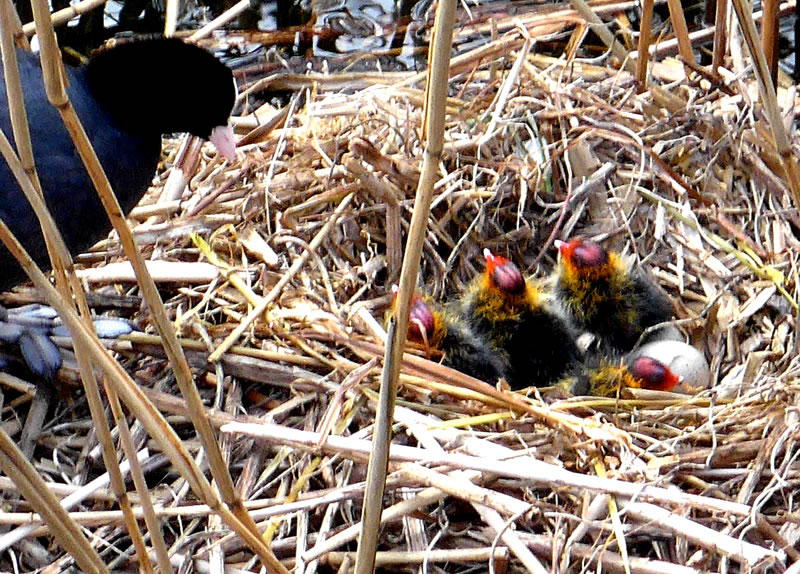 10.7.16 ....Blessi De Öllste ut de Kinnerstuuv Dat is al n'poor Daag her, dat Blessi dat endlich schafft harr, ut dat Ei to slupen. Nu keek he neescheerig ümher. In de Hauptsaak sehg he Water un Schilf. De Schilfhalme versparrn em de Utsicht. Aver ut dat Nest tru he sick noch nich. Lever verkroop he sik noch wedder ünner Modders warmes Fedderkleed.