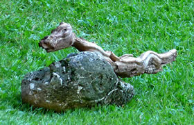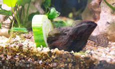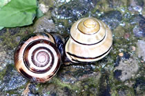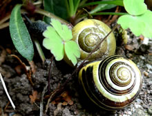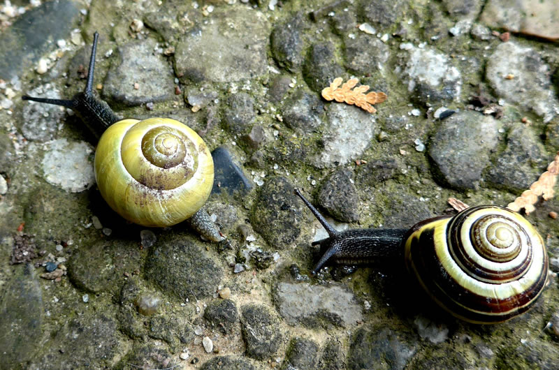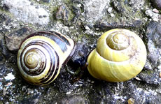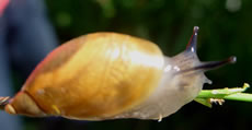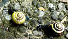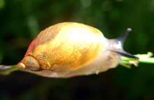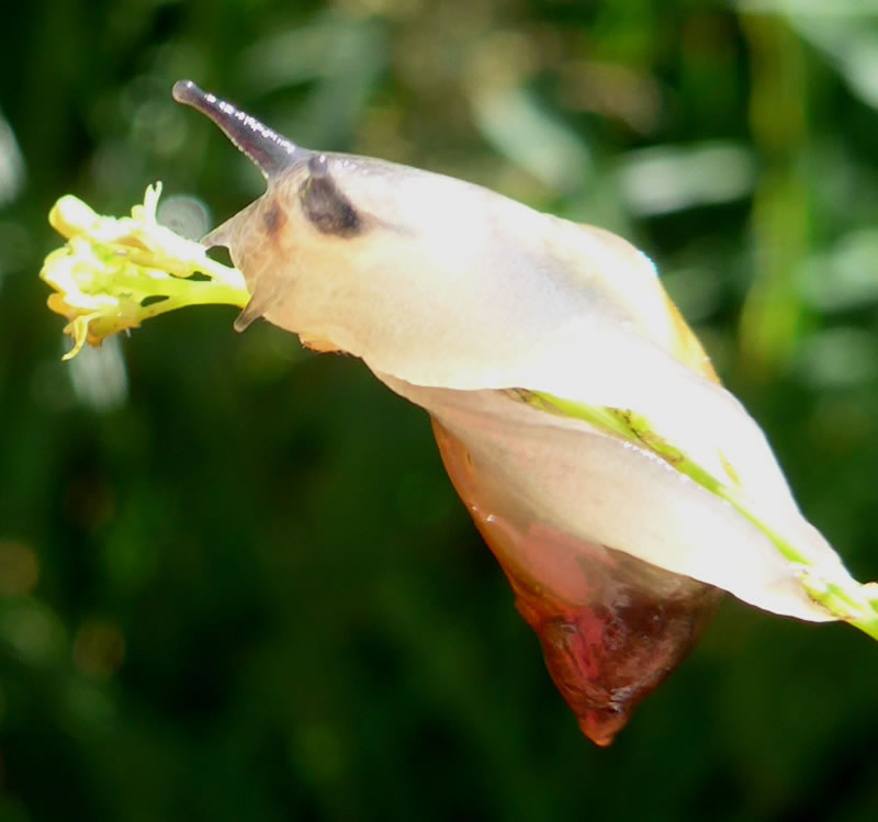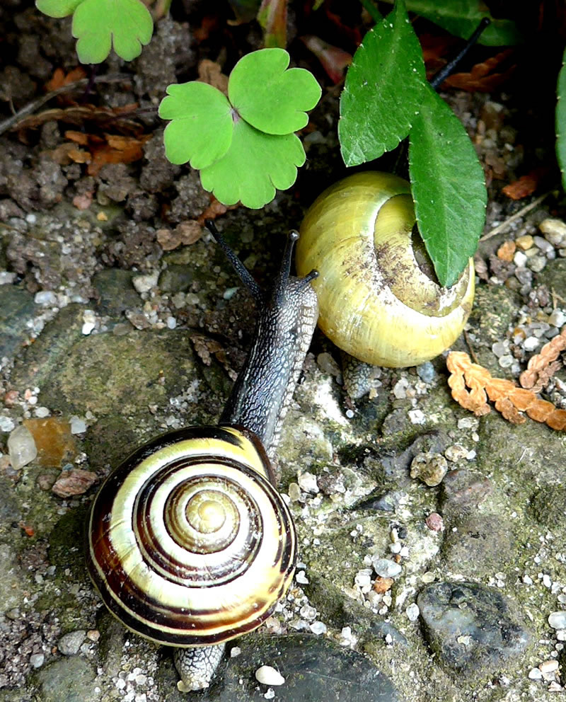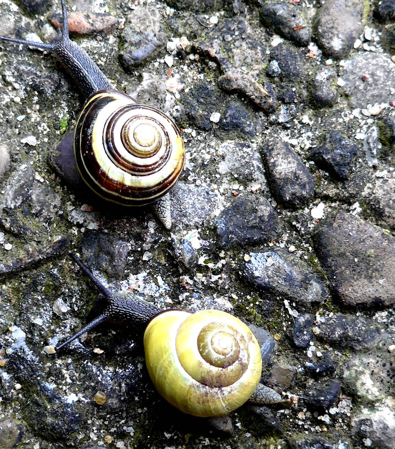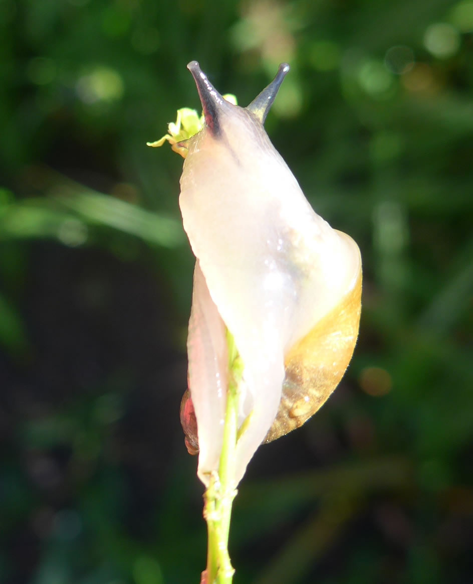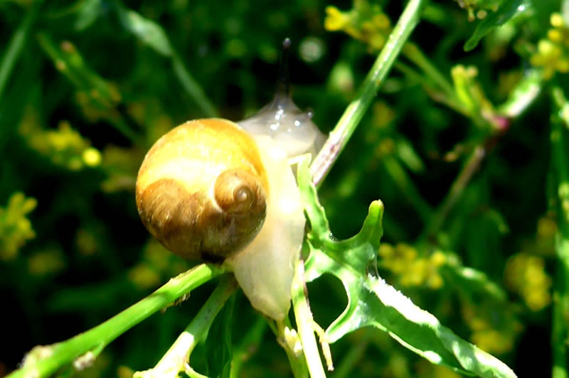Mank Brennetteln un anner gröne Planten klatter en lütte Snick an enen dünnen Stängel. Ik heff den Stängel afbraken un vörsichtig in de Hand nahmen. De Snick bleev sitten, streck sogoor de Föhler ut. Se beweeg sik as so'n Seildänzer up den Stängel. Dat bernsteenfarvte Huus trock se achter sik her. Na de Farv vun dat Huus hett se den Naam kregen. Dat is en Bernsteensnick, ut de Familie vun de Landlungensnicken. Dat Huus is aver oftins so lütt, dat de Snick dor nich in hüsen kann. Denn smitt se dat Huus af un leevt nakelt.