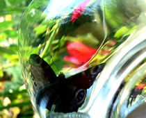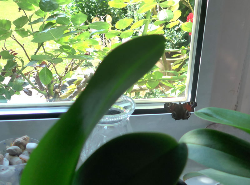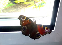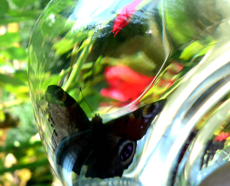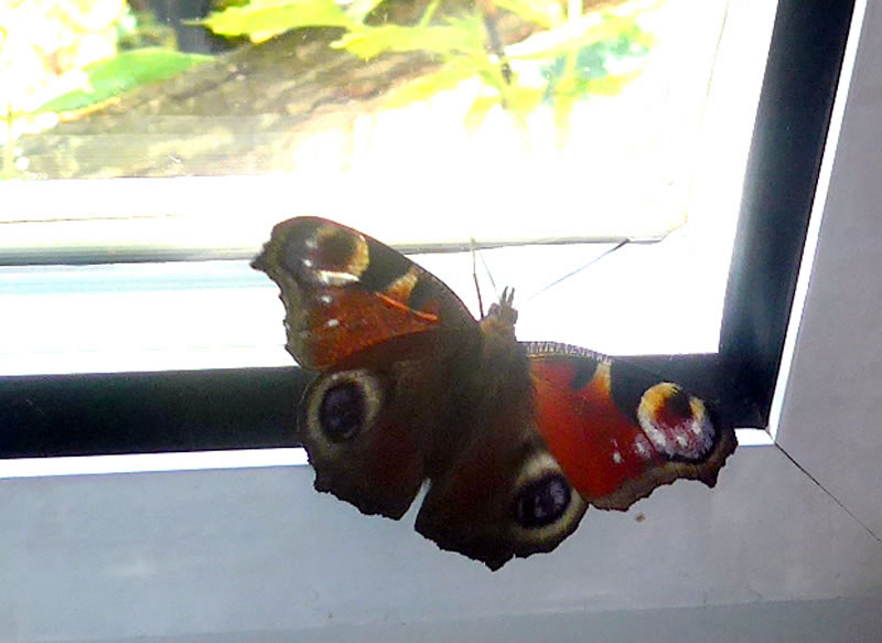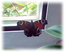 slöög bannig Nu sett he sik för en Momang an de Schiev. Dor kenn ik em. Dat weer en ganz smuck Pfauenoog. Ümmer wedder flöög he mit den Kopp gegen de Schiev. Dat bumms richtig. He wull rut! Denn müss ik doch hölpen. Gau heff ik mi en Waterglas ut de Köök halt. Dat wull ik över den Bottervagel stülpen. Mank de Bloompütt weer dat gor nich so eenfach. Endlich heff ik dat schafft. De Bottervagel weer in't Glas. Mit mien Hand heff ik dat Glas tohollen. Un nu güng ik gau mit dat Glas un den Bottervagel up de Terrass.