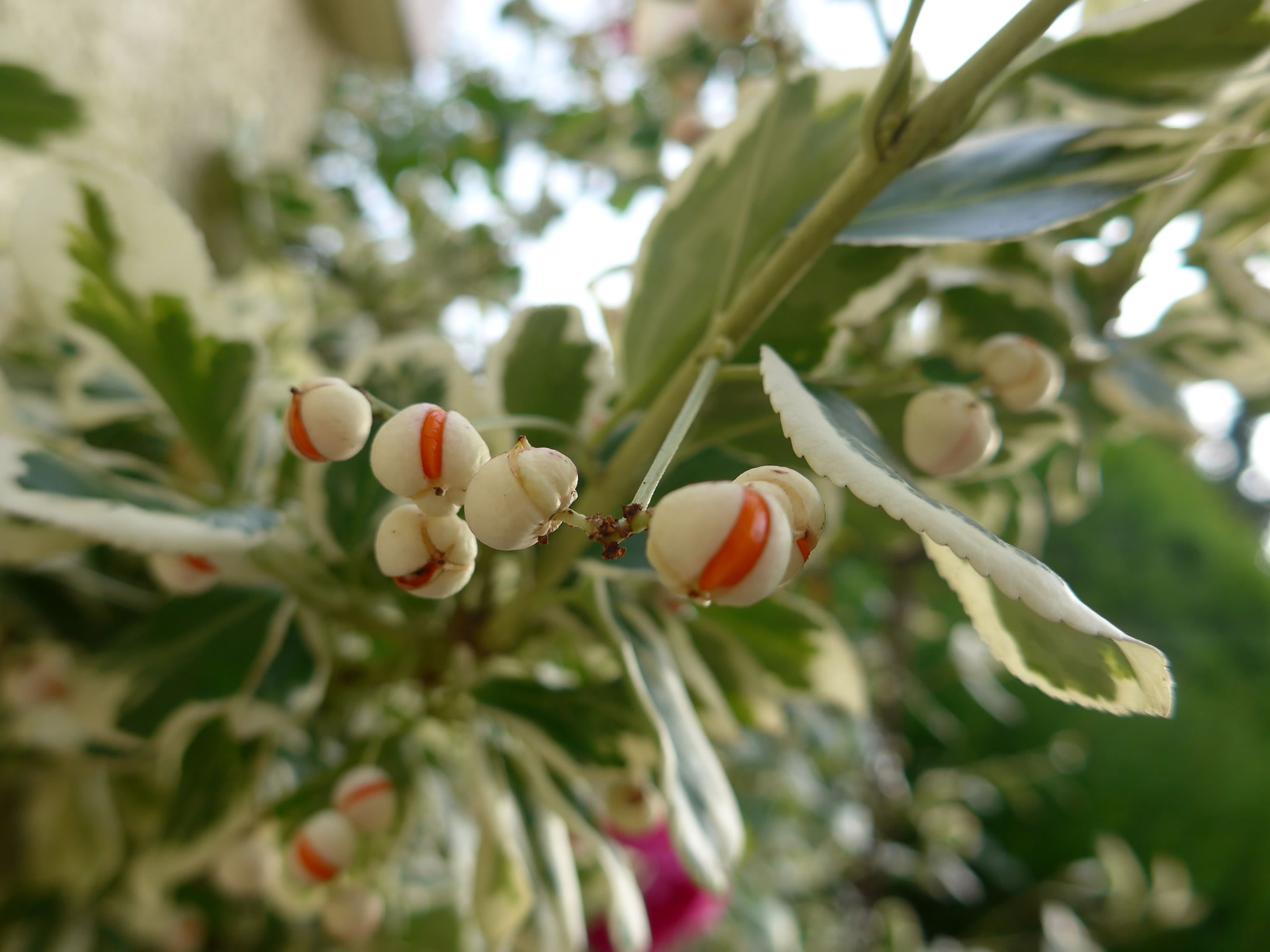 Düssen Harvst bün ik to'n eersten Mal de Früchte vun dat Kriechspindelkruut wies woorn. Dat weern lütte runde Kugeln mit enen Schlitz. Dor keek rode Klöör dörch den Schlitz. Hoffentlich weern de Beern nich giftig! In't Fröhjohr harr ik dor en Büschel mit lütte gele Blöden sehn. Dat Kruut is wedder mal en Neophyt. Ik freu mi ümmer wedder to dat Kruut. Dat is doch smucker as so'n nakelten Tuun. De Biller köönt Se per Klick