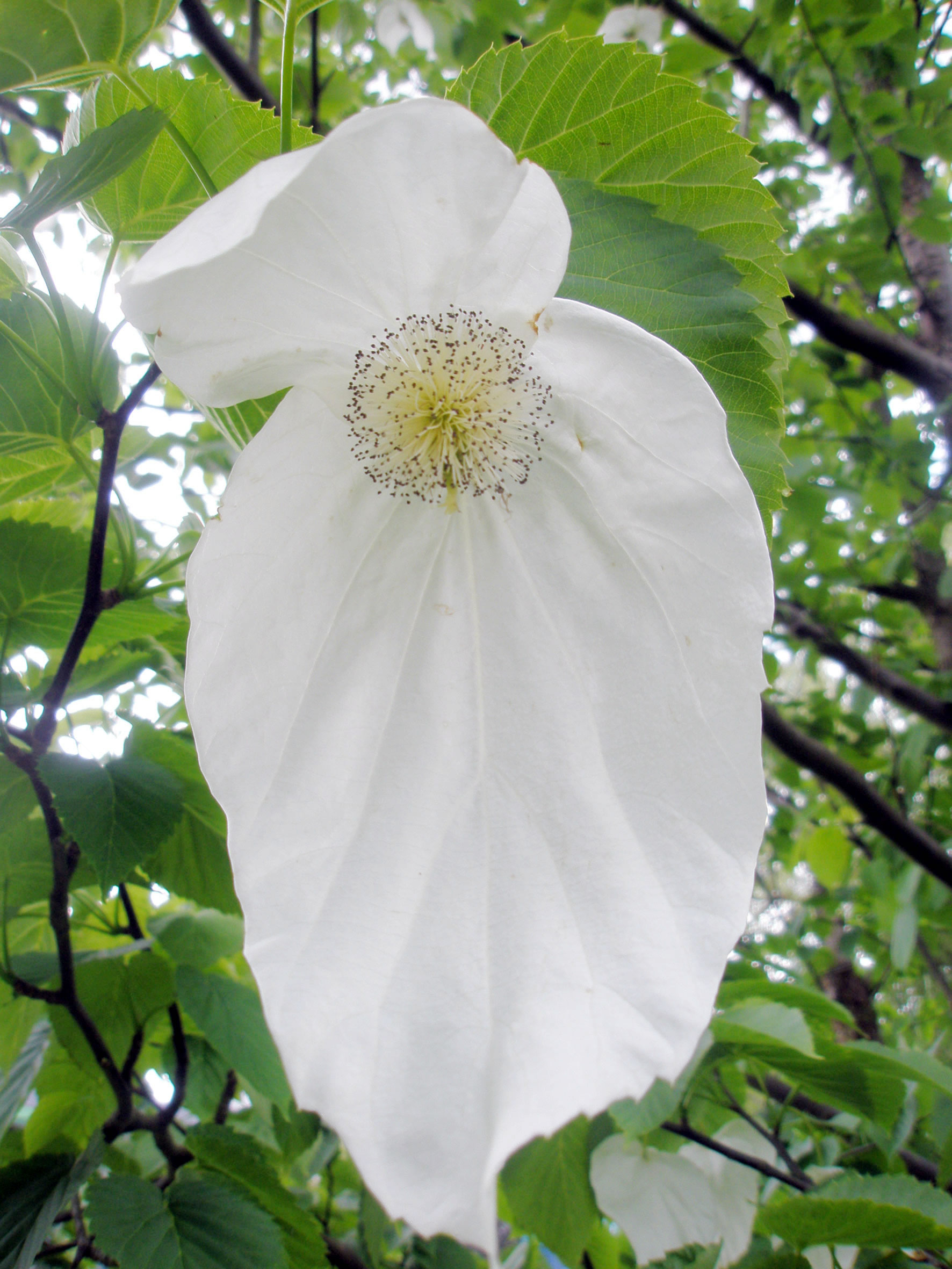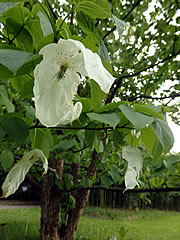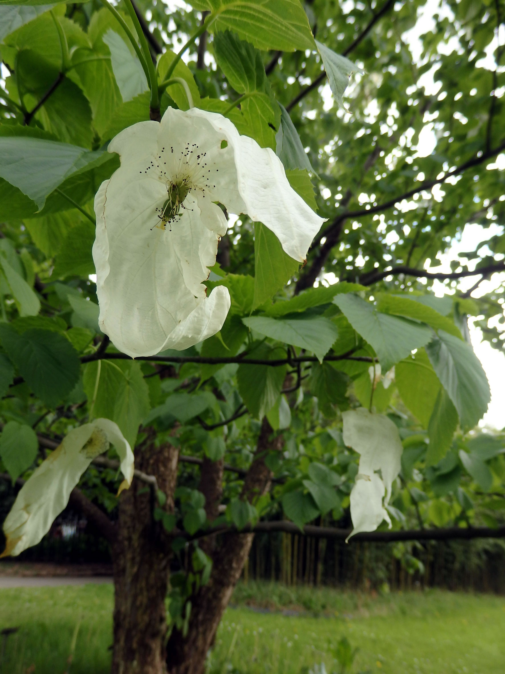 3.7.16 ....De Winkewinke-Boom Annerletzt schick mi mien plattdüütsche Matin Katja Renfert Fotos vun en possierlichen Boom: den Taschendook-Boom. Kunnst ok seggen: en "putzigen" Boom, dat wöör to de Taschendöker passen. Dat sehg ut, as schulln de Biller to den Brexit passen, man Katja sä, nee, se harr dat ahn Achtergedanken wählt, de Boom schull nich de Briten Adjüs winken. Kunn ja ok en Hallo-Winken ween! De Taschendookboom stammt ut en bestimmte Gegend in China un is heel afsünnerlich. He warrt ok "Duvenboom" nöömt. Wikipedia seggt, he is de eenzige Plant in en extra Gattung, de för em opstellt woor. De witten "Taschendöker" orr "Duven" sünd eentlich so nöömte Hoochbläder. Hoochbläder sünd keen Deel vun de Blööt, sünnern wasst bloots neeg bi de Blööt un ümrahmt ehr. De Blöden vun düssen Boom sünd nämlich heel unschienbor, slicht un bruun, un keen Insekt wöör dor op marken, wenn nich de twee groten witten "Taschendöker" üm elk Blööt em winken wöörn. Also sünd de wichtig för't Bestöven un för de Foortplanten.
