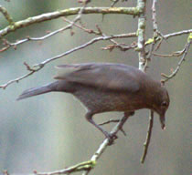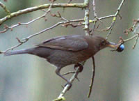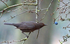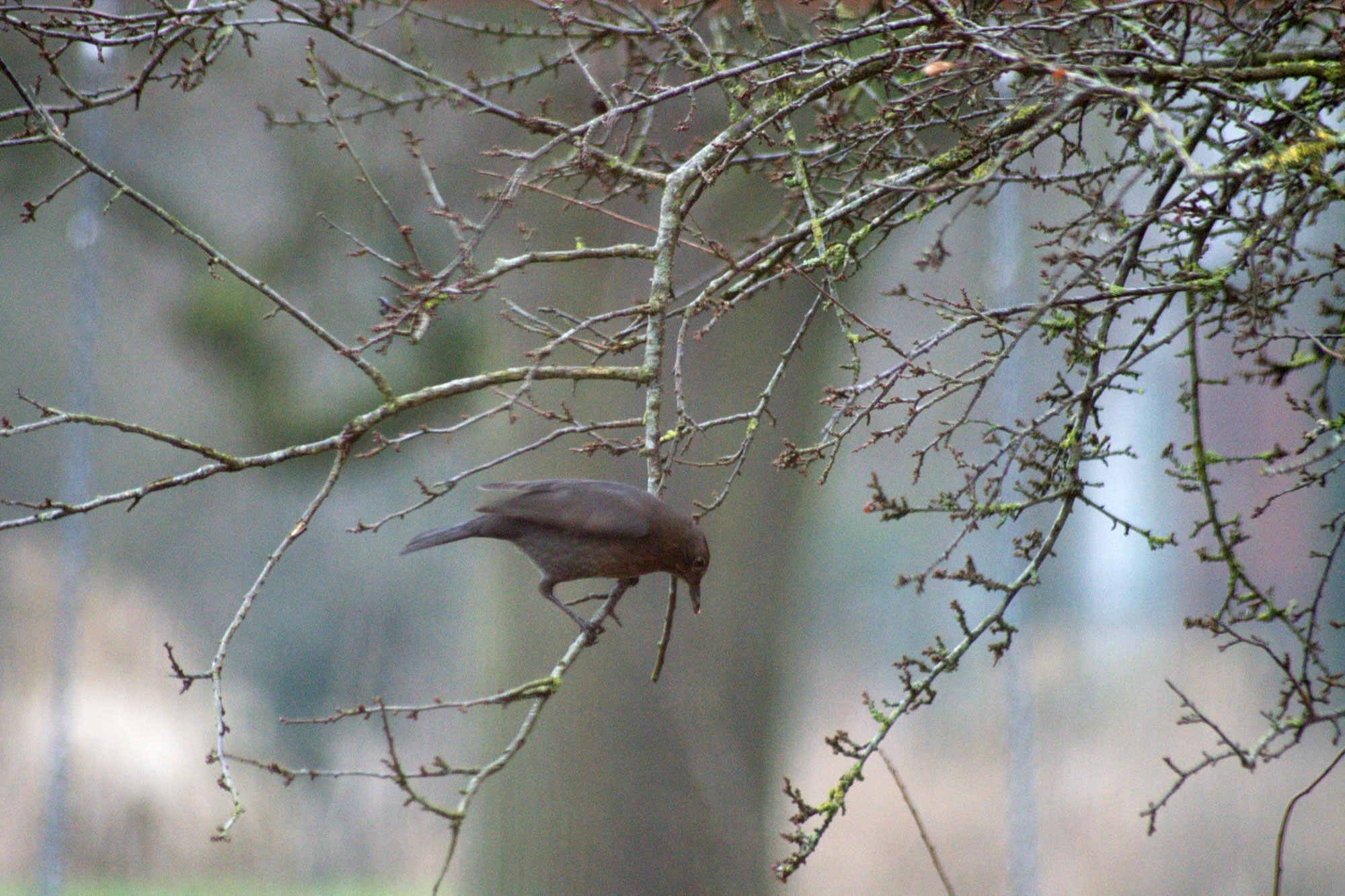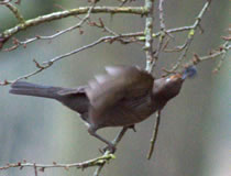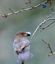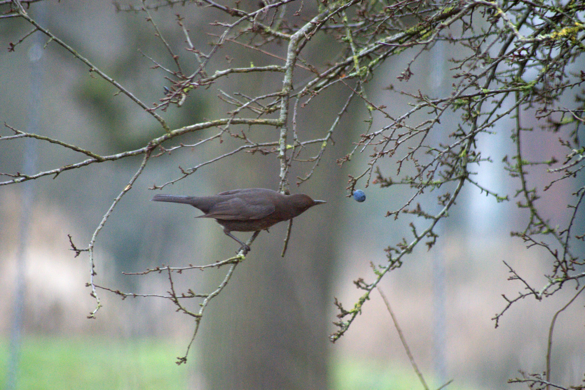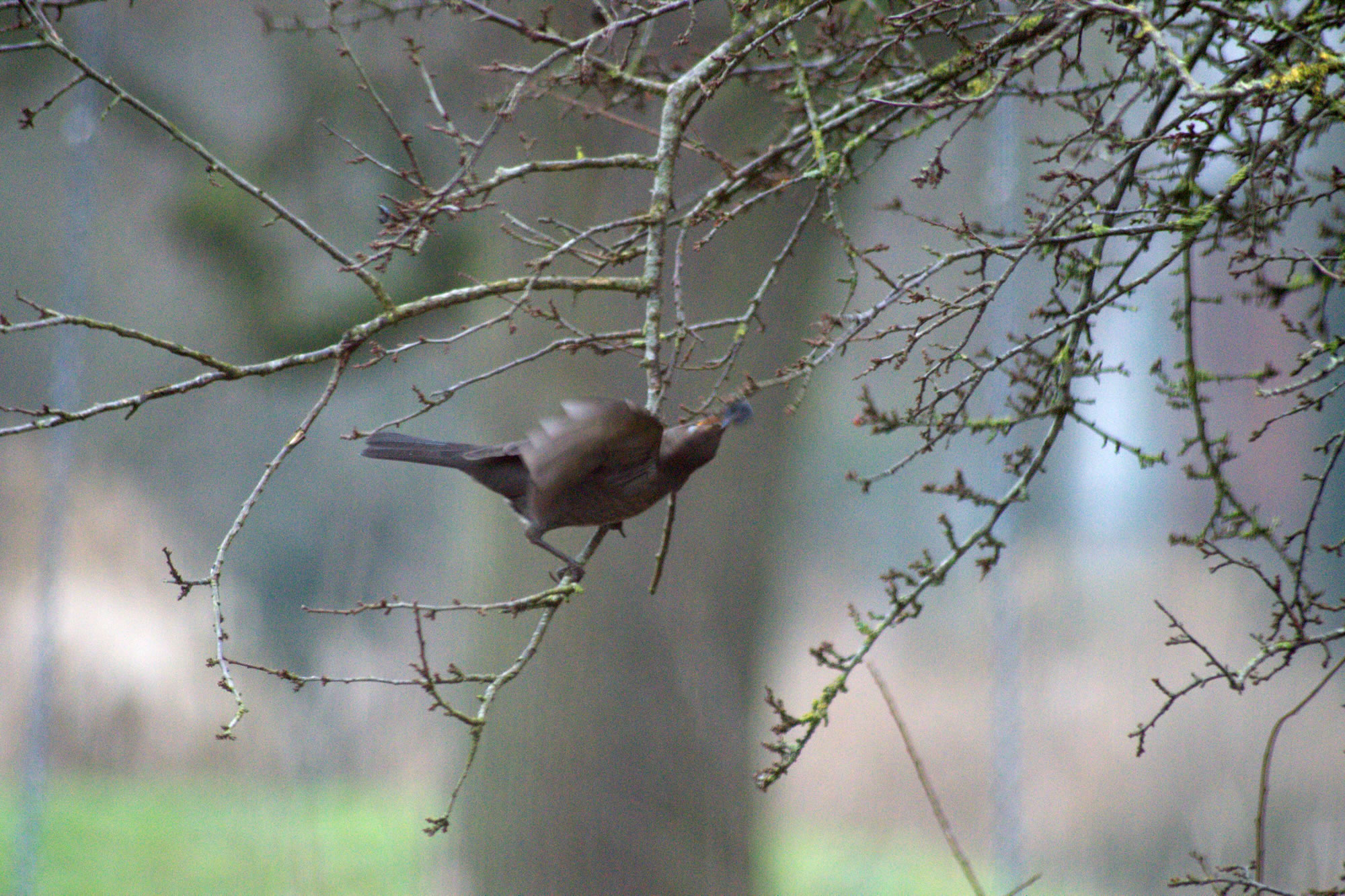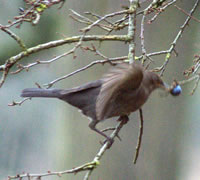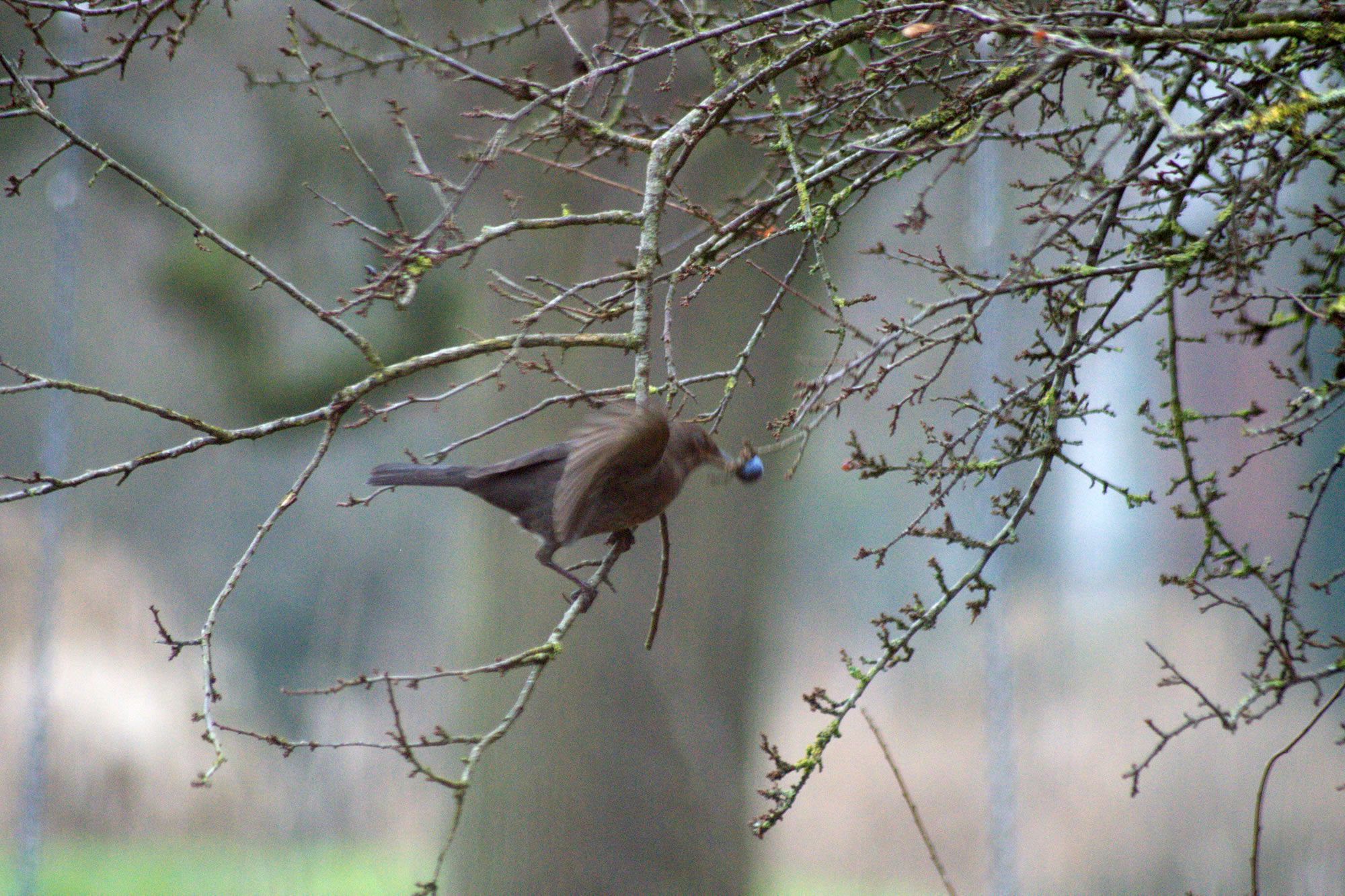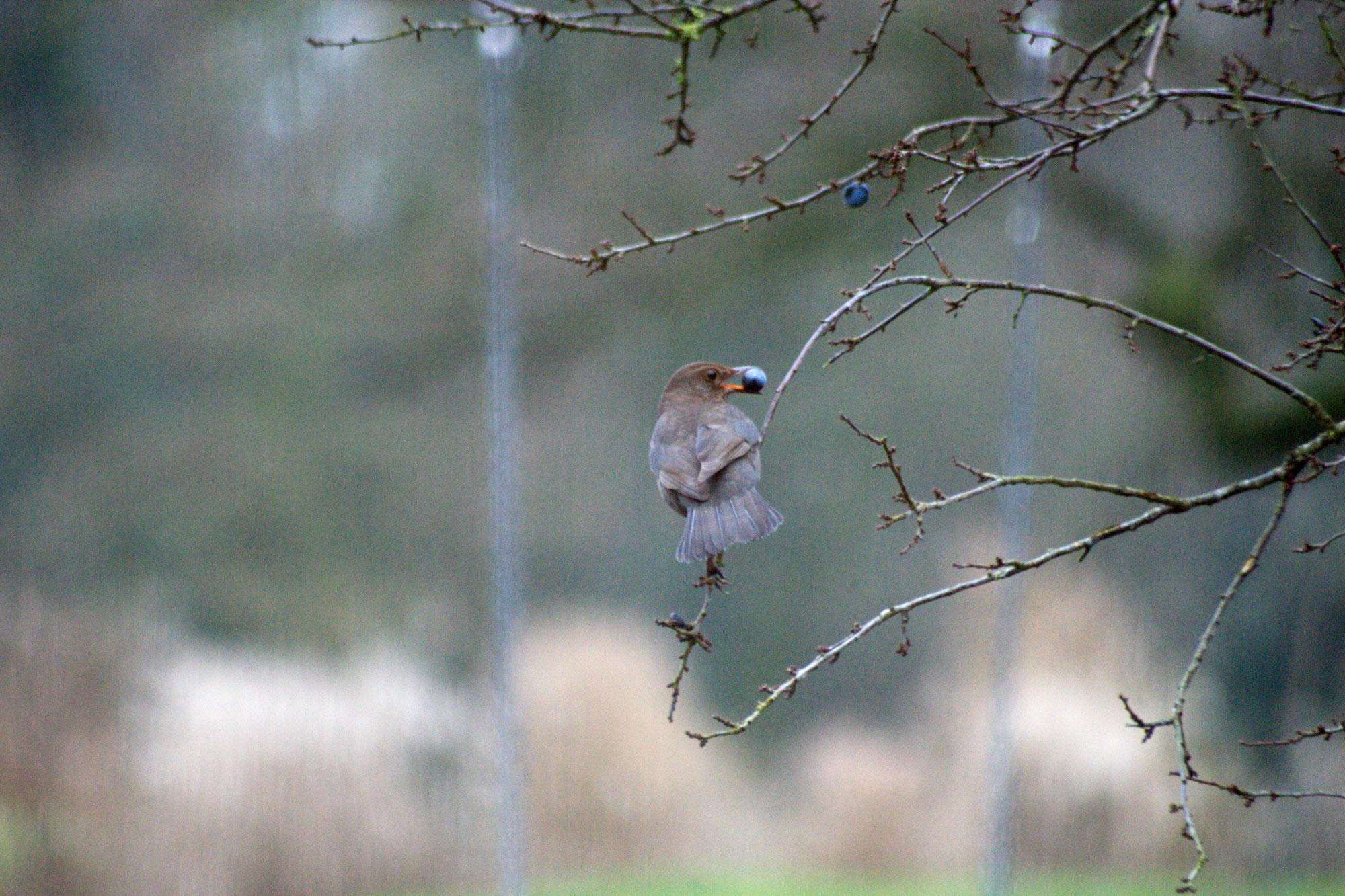 ganz schön verrenken. Eine Beere sieht sie hier, denkend: "Ach, wo krieg ich dir?" Dat is nu recht frie na Wilhelm Busch. De Droßel wull de Beere aver unbedingt hebben, un dat müss ok unbedingt düsse Beere ween. Se möök alle mööglichen Gymnastikfiguren...