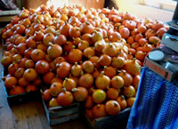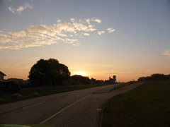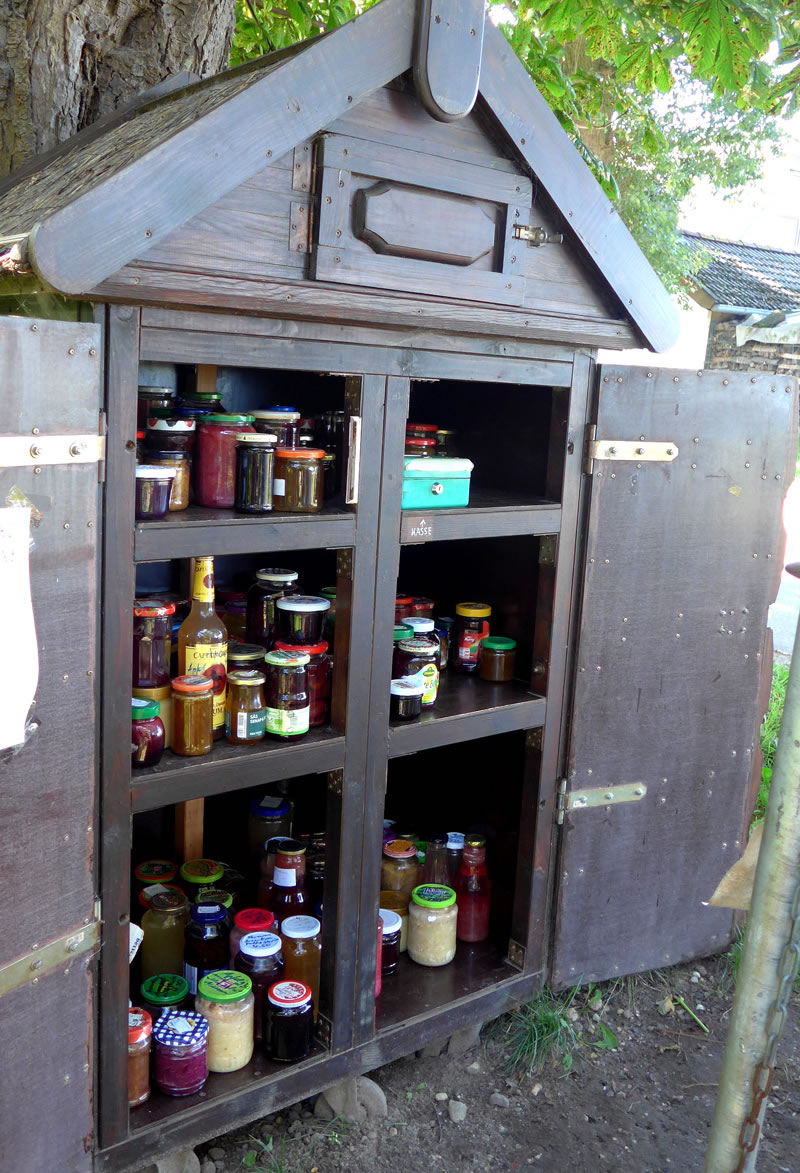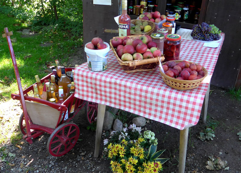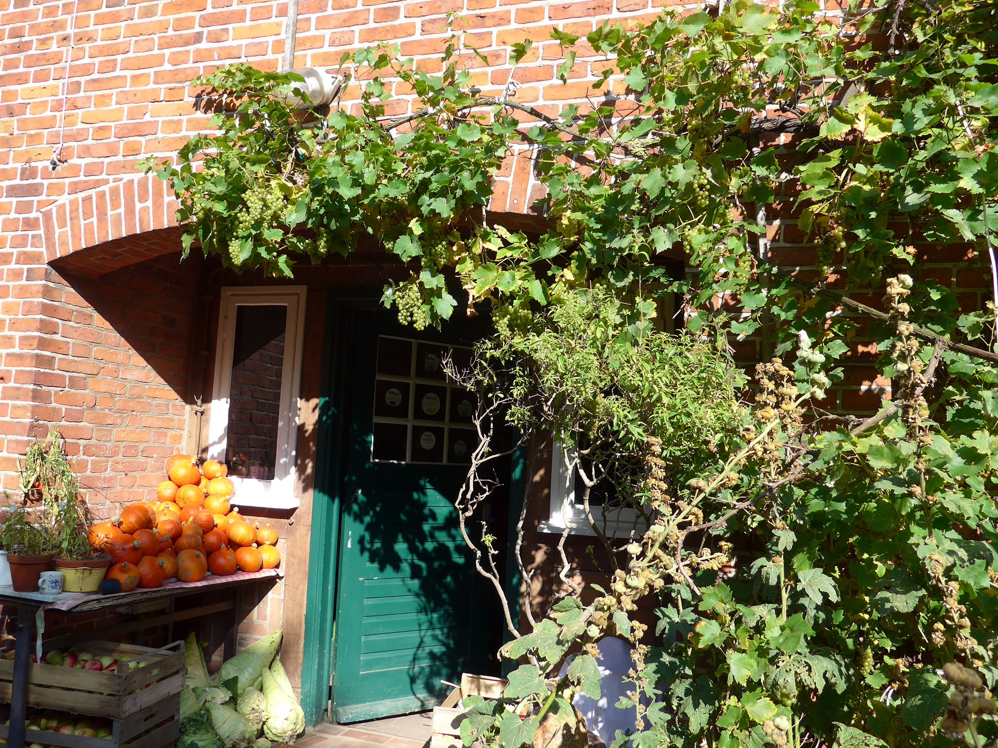 Annern Moorn weck uns Sünnenschien un wi möken uns up den Weg. Vör jeden Buurnhoff stünn in Körf godes Aavt. Neven dat Aavt weer en Doos för Geld. Wi müssen nich eerst op de Buursfruu töven. Deelwies weer ok all Most in Flaschen un Marmelaad utstellt. Wi hebbt uns goot bedeent. Up den Nahuusweg föhrn wi noch an Opas Biohoff vörbi. De harr junge Kantüffeln un frische Eier. Vör sien Huus stünn en Pfirsichboom. De Pfirsich weern ok al riep. An sien Huusdöör hüngen de eersten Wiendruven. Vun allens hebbt wi wat afkregen. Riek beladen föhrn wi na Huus.