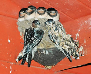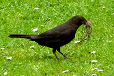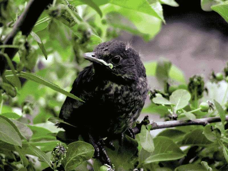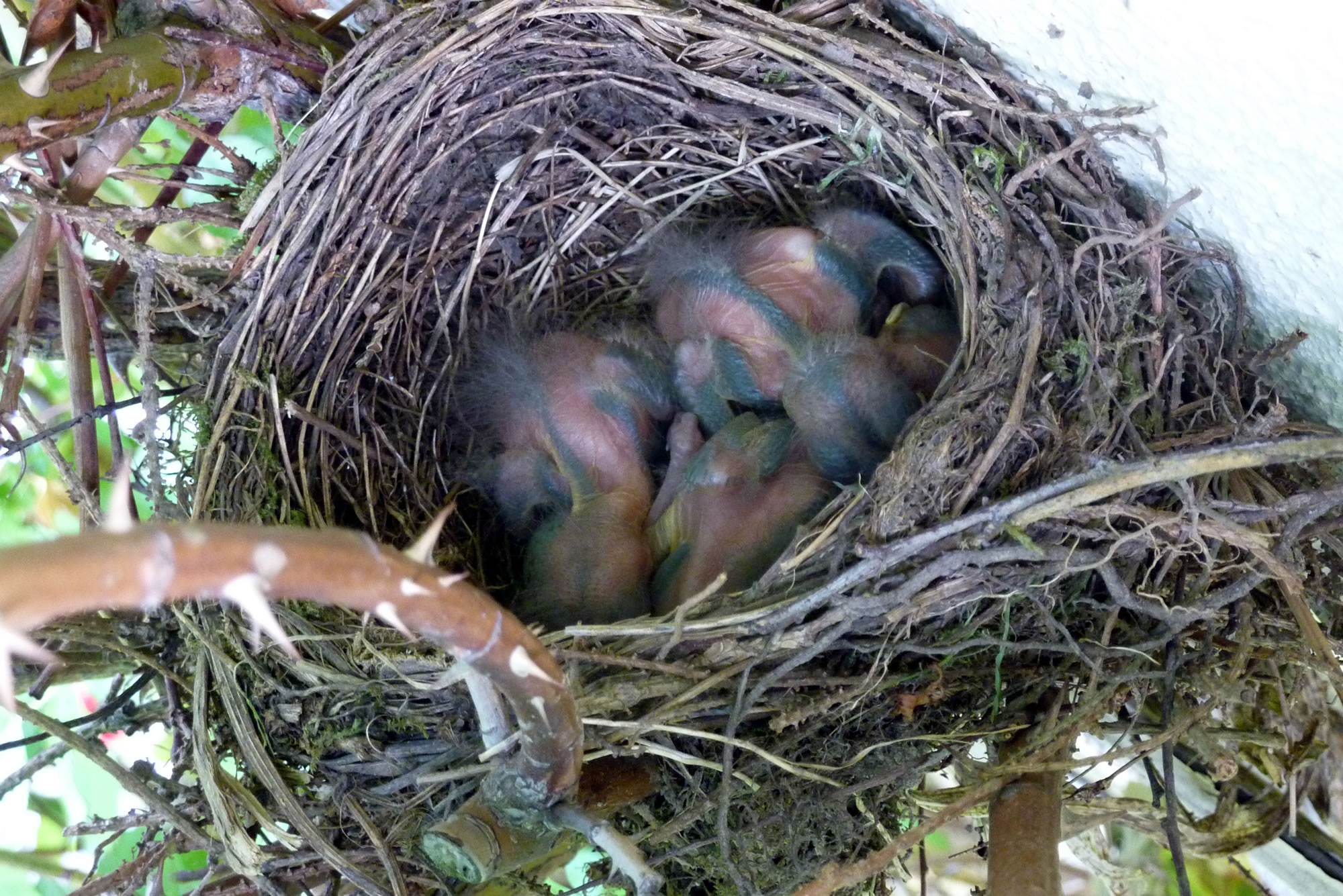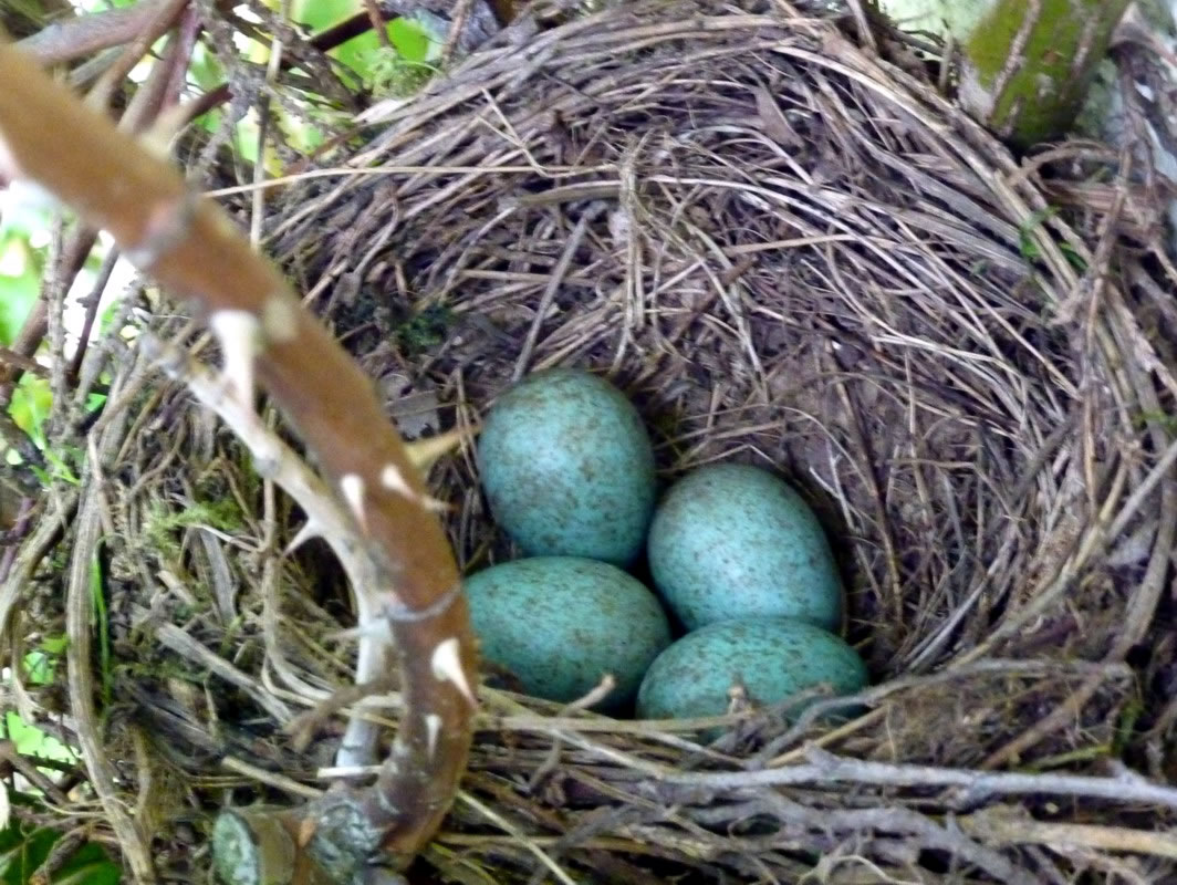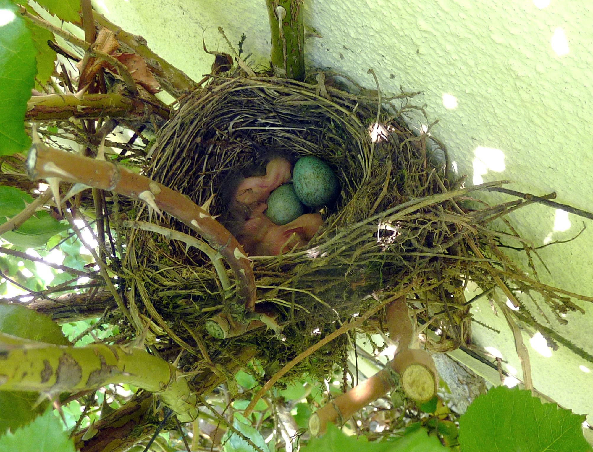 Ik heff natürlich den Nestbuu genauer ünnersöcht. As de Flugverkehr vörbi weer, heff ik en fardiges Nest vörfunnen. Bald legen Eier in dat Vagelnest. Bi veer Eier hebbt se uphört. Nu seten se afwesselnd up de Eier. To de Fröhstückstied weern se immer wedder to Stell. Enes Dags keem de Amselmann mit Würmer in sien Snavel anflagen. Dat weer en Teken, dat de Kinner ut dat Ei krapen weern! Immer wedder keem nu en vun de Öllern mit Würmer anflagen. Se wöörn lutstark vun de Kinner begrööt: "Hunger, Hunger!" Wenn ik wat vun dat Familienglück sehn wull, wöör dat Tiet! Ik heff mi den Tritt ut den Keller haalt. Vorsichtig klatter ik hoch. Dor kunn ik de Familie bekieken. Fief lütte nakelte Amselküken legen in dat Nest! Hoffentlich kunnen de Öllern ehr Kinner düt Johr groot kriegen. Süht good ut düt Johr. Letzt Johr hett de Heister se haalt. Dat Johr vörher harr de Eekkater se klaut. Amseljunge weern wull bi de annern Deerten en begehrten Leckerbissen. De Biller köönt Se per Klick