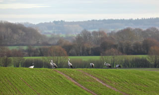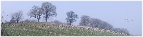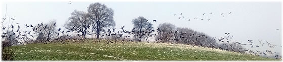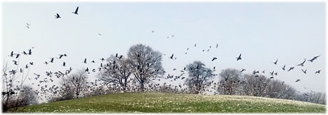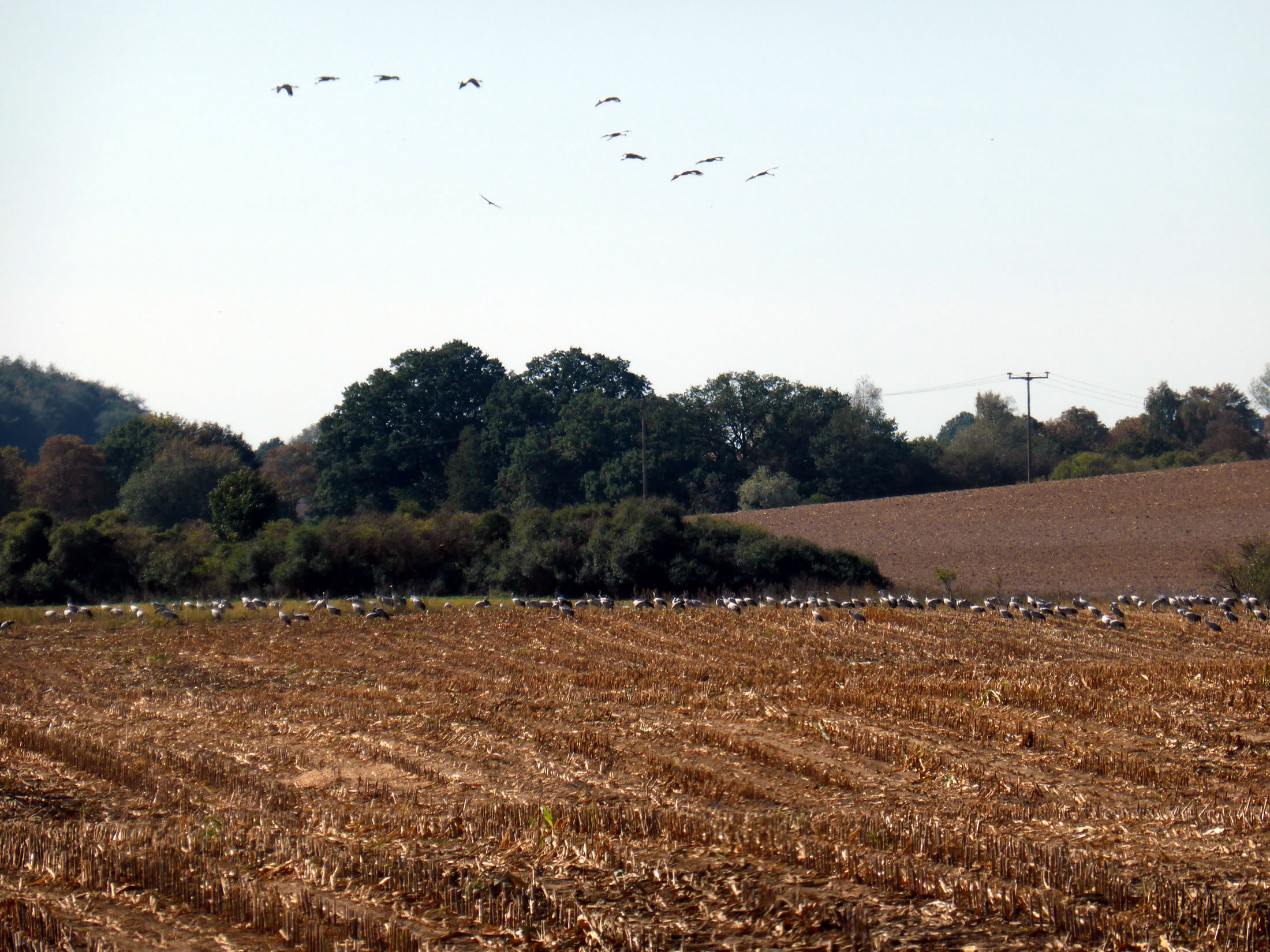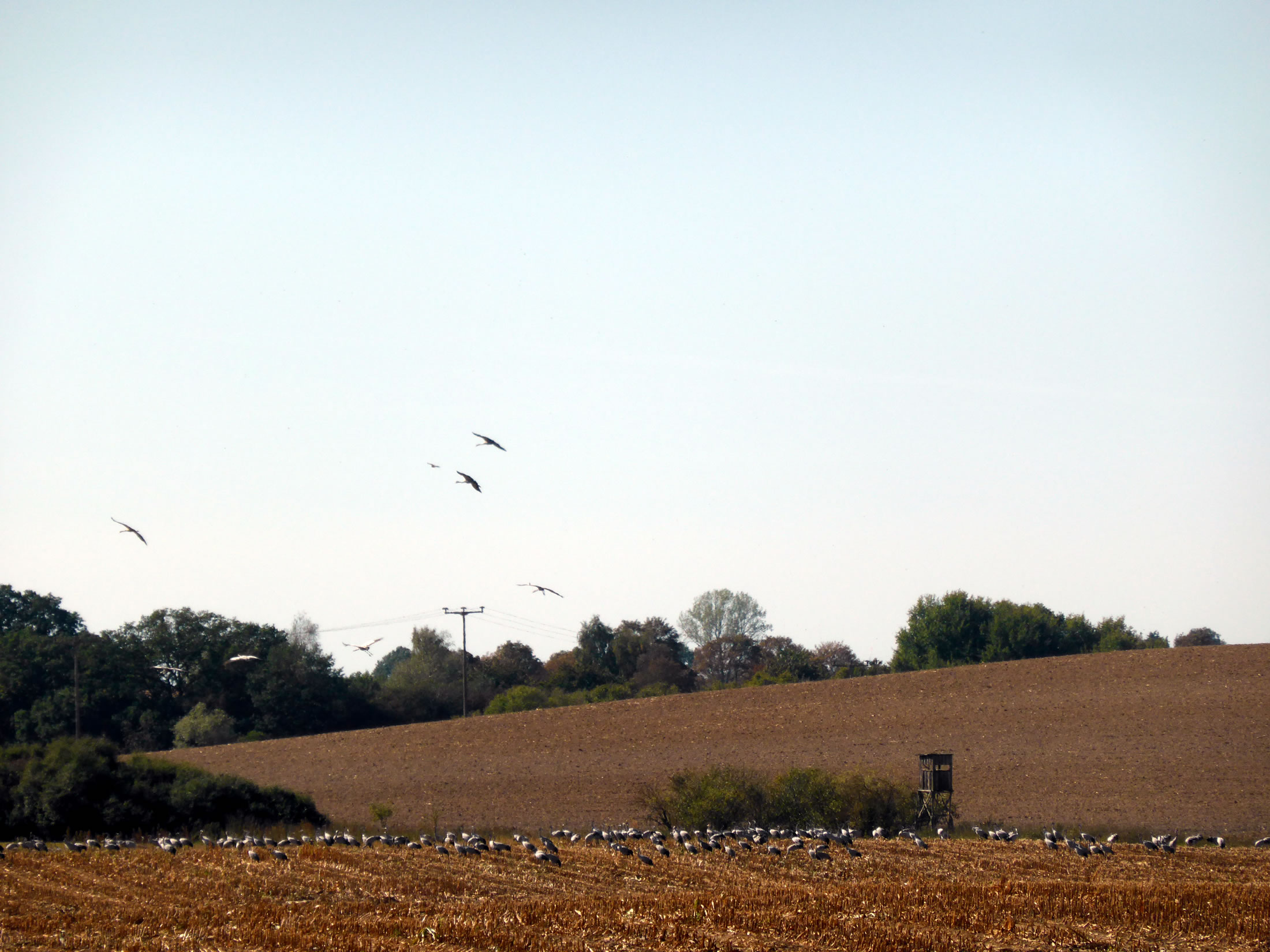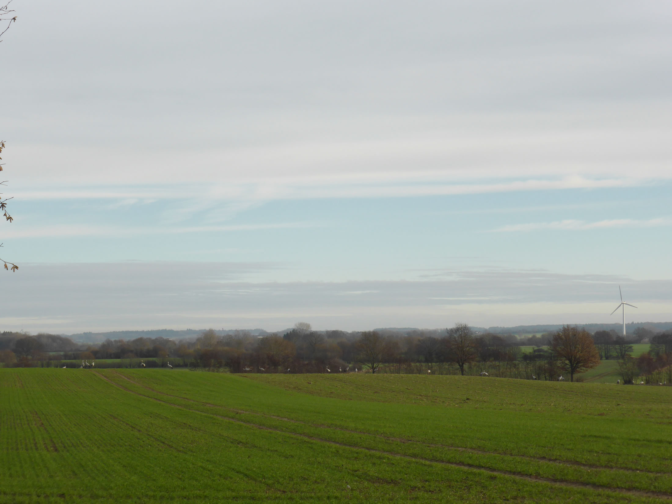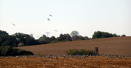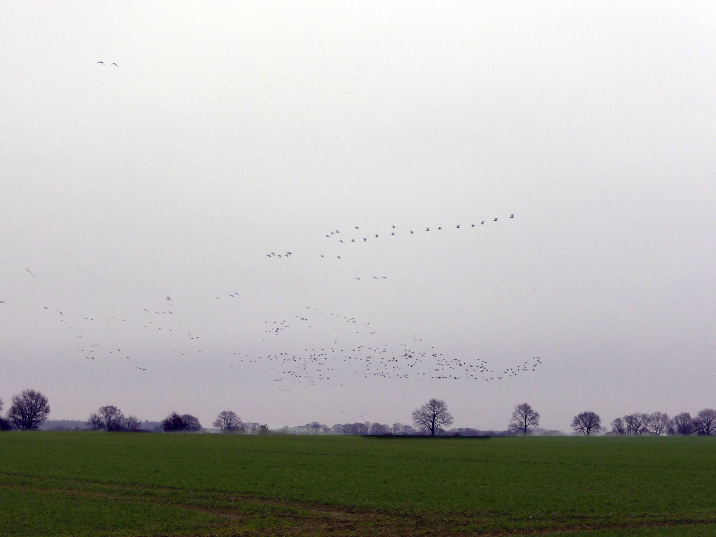 .... In de Neegde vun Hornsmühlen fulln mi gistern opmaal grote Vagelswarms op. Dat weern keen Toogvagels op ehr Reis; dat sehg ut, as weern se bi to öven. Se nehmen Kielform an un lösen sik denn wedder op, störten dal un stegen wedder op, krüüzen en annern Swarm un küseln en Stoot üm den, denn lösen se sik wedder ... un allens jümmer över düsse Ackerflächen! Mi düch, de Vagels müssen vun de Grött her sowat as Wildaanten ween; avers Wildaanten maakt nich solk Toogvagel-Öven un bildt keen Kiels. För de groten Göös-Aarten schienen se mi to lütt, ehr Flünken lepen ok mehr so spitz to. Betere Fotos heff ik avers nich henkregen. Welk Vagelaart mag dat woll ween? De Biller köönt Se per Klick