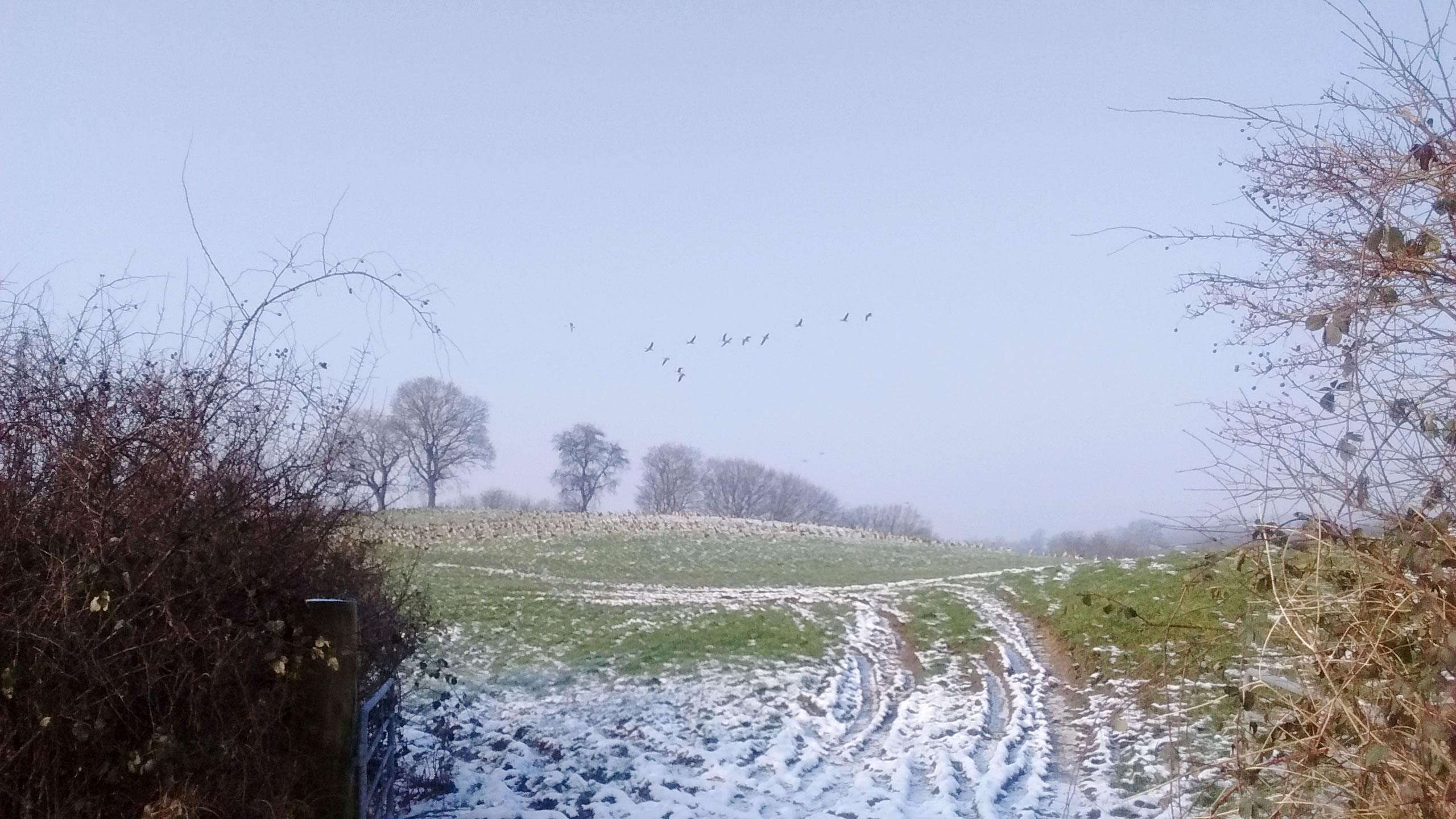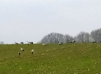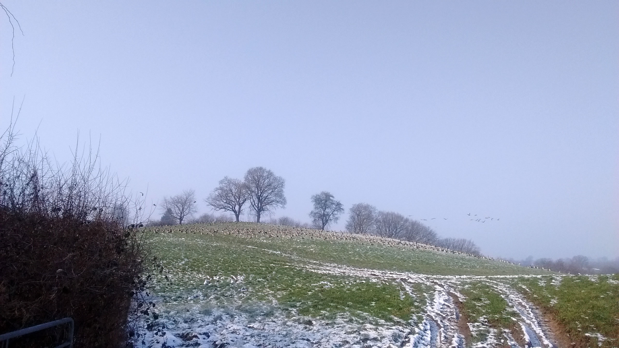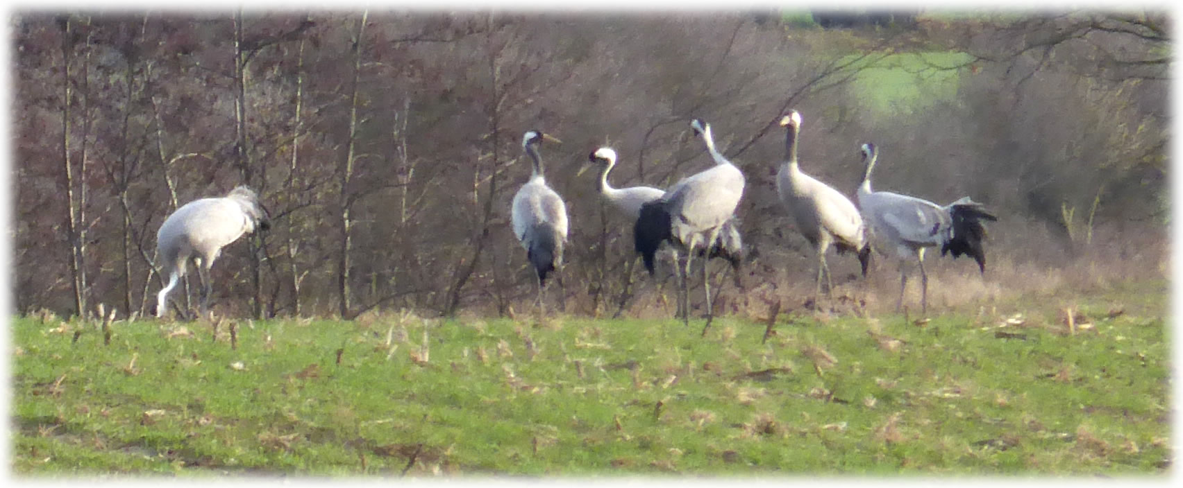 Ik harr mien Fotoapparaat nich to Hand, as ik güstern an düsse Wisch bi Plön vörbikeem. De Dag weer wunnerschöön. Över mi seil en lütte Kiel Wildgöös, ik folg ehr mit de Ogen, un süh, de Wisch, woneem se landen dään, weer merkwördig sprenkelt: Wildgöös, hunnerte, dusende Wildgöös seten dor al! Un jümmers noch kemen welk dorto! Mien Fotos hebbt nu leider bloots Handy-Qualität, avers kunnst düütlich sehn, dat dat Griese Göös weern sünnerlich in'n Floog. Dat kunn keen Göösvolk ween, dat hier överwintert harr, dorför weern dat to vele; ik bün vermoden, de Göös sünd al wedder op ehrn Fröhjohrstoog, un stückerwat Töög harrn sik hier drapen. Denn sünd se ja al Baden vun'n Lent! Bang sünd düsse Deerten ja nich so licht, man as ik neger un neger ran wull, flögen se doch alltohoopen op en Bild as ut Hitchcocks Film un dreihn wraaksüchtig Krinken över mi. Ik bün utneiht.