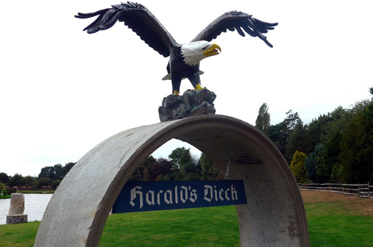 16.7.17 ....Lent an Haralds Diek Harald sien künstlichen Diek hebbt wi na de Dööp noch öfter besöcht. Aver mit dat Strietschohlopen is dat nix worrn. De Winter weer nich kolt noog, un dat Ies woor nich dick noog. Dor werrn wi glatt inbroken! Aver in't Fröhjohr trock uns dat wedder an Haralds Diek.