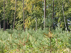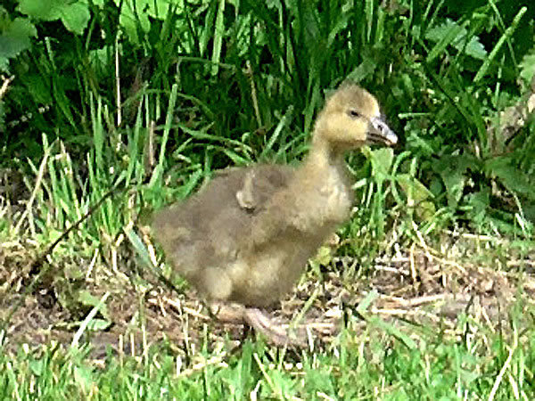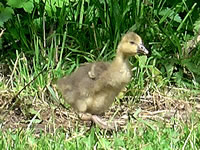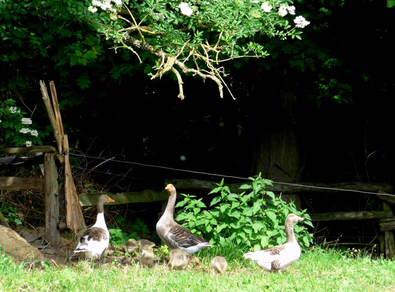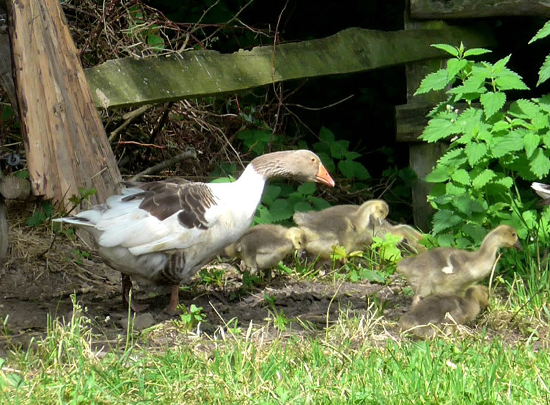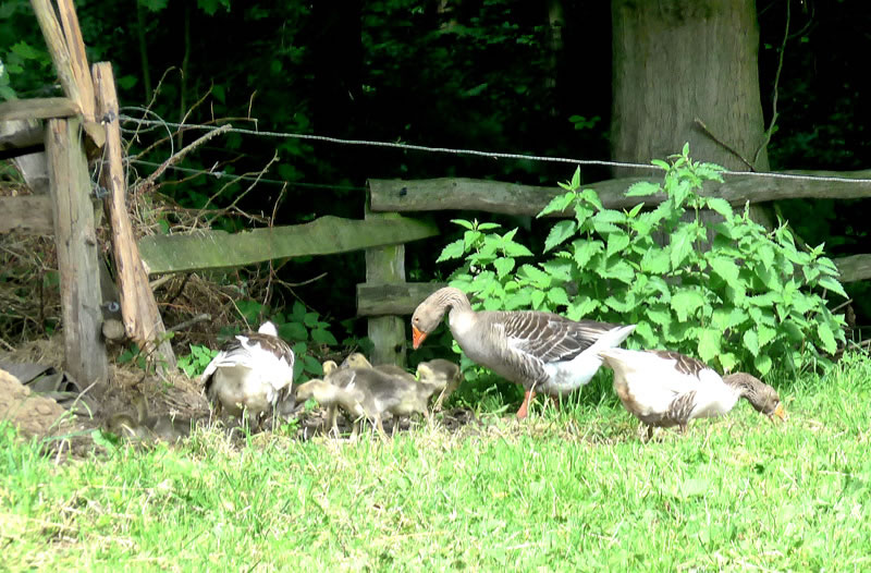 na Nu föhrt wi eerstmal na den Hoff Schimmel. Kort vör den Leonorenwoold stünn dat smucke Schild: "Imkerei Schimmel". Ob de mi wull noch kennt? Vör söss Johr weer ik dat letzt Mal op den Hoff. Seker harr sik dor so Eeniges verännert! Wi wöörn mit luut Gebell vun enen Hund anmellt. Aver denn keem glieks de Fru. "Wie schön, dass Sie einmal wieder zu uns kommen! Wir haben auch wieder kleine Gössel, die können Sie knipsen!" Wat heff ik mi över dat Weddersehn freut! Unsen Weg güng glieks na de Wisch. Dor seten wohrhaftig lütte Gössel mit Vadder un Modder an'n Rand vun den Woold ünner en Flederbeebusch. As se mi wies wöörn, reck Vadder den Kopp hoch un wull mi verjagen. Gau heff ik noch en poor Biller maakt.