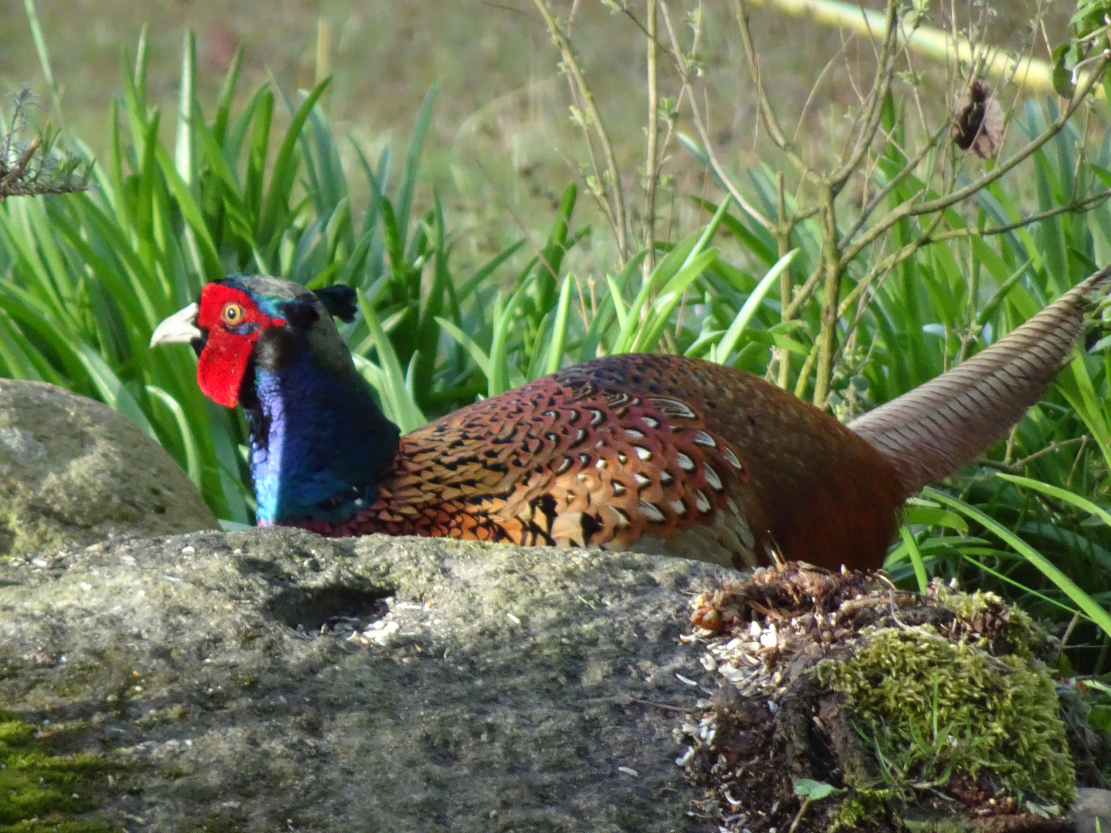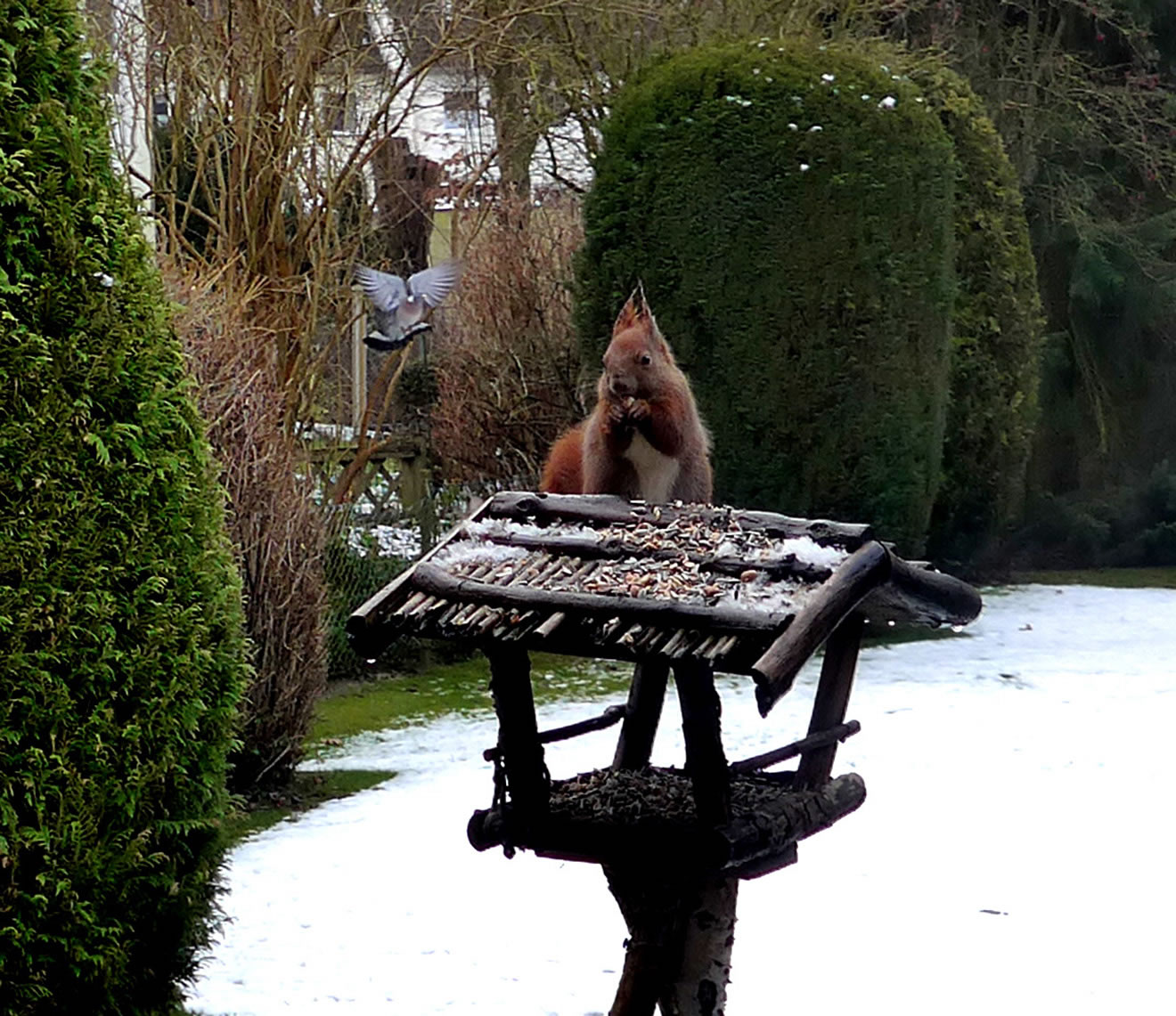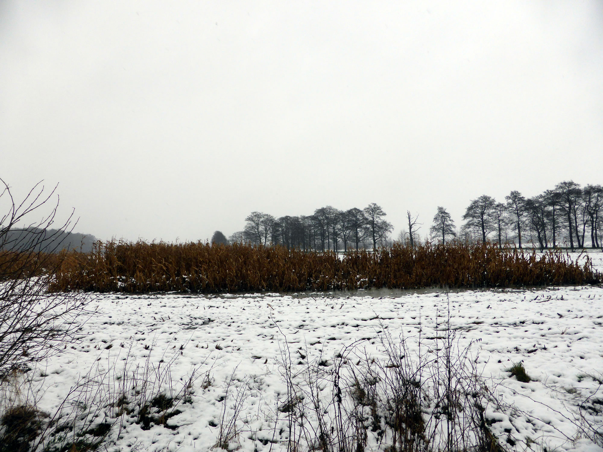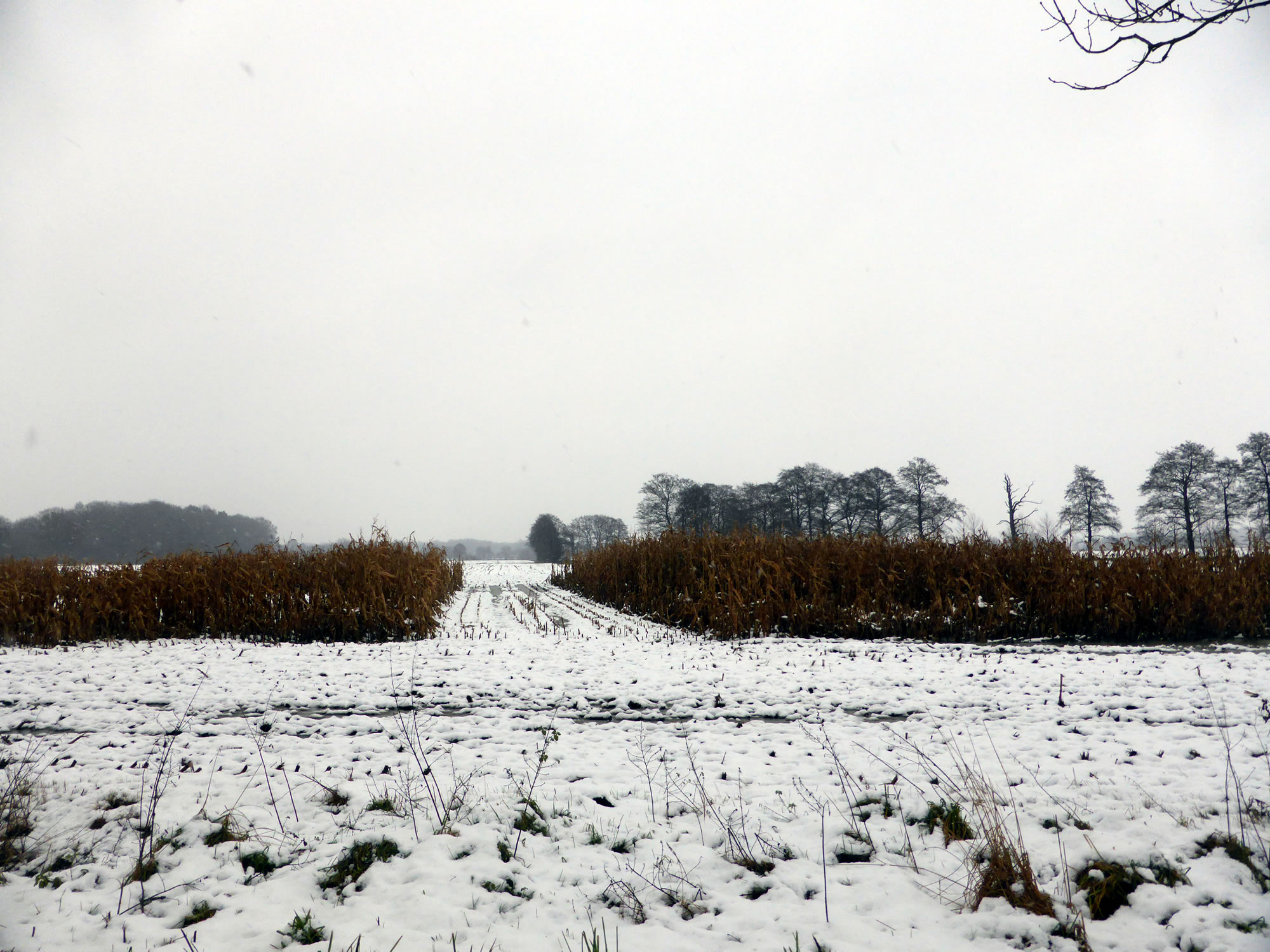 De nableven Mais aver is hüüt en willkamen Winterfoder. Lünken, Amseln un sogor Duven raschelt dortwüschen rüm un pickt na den Mais. Knipsen laten wulln se sik nich, aver ik heff ehr fladdern sehn. Tja, wat den enen sien Uul, is den annern sien Nachtegall! De Biller köönt Se per Klick