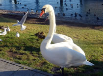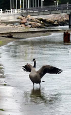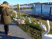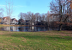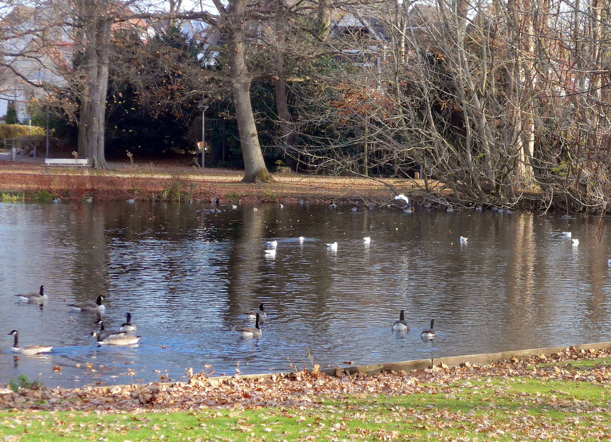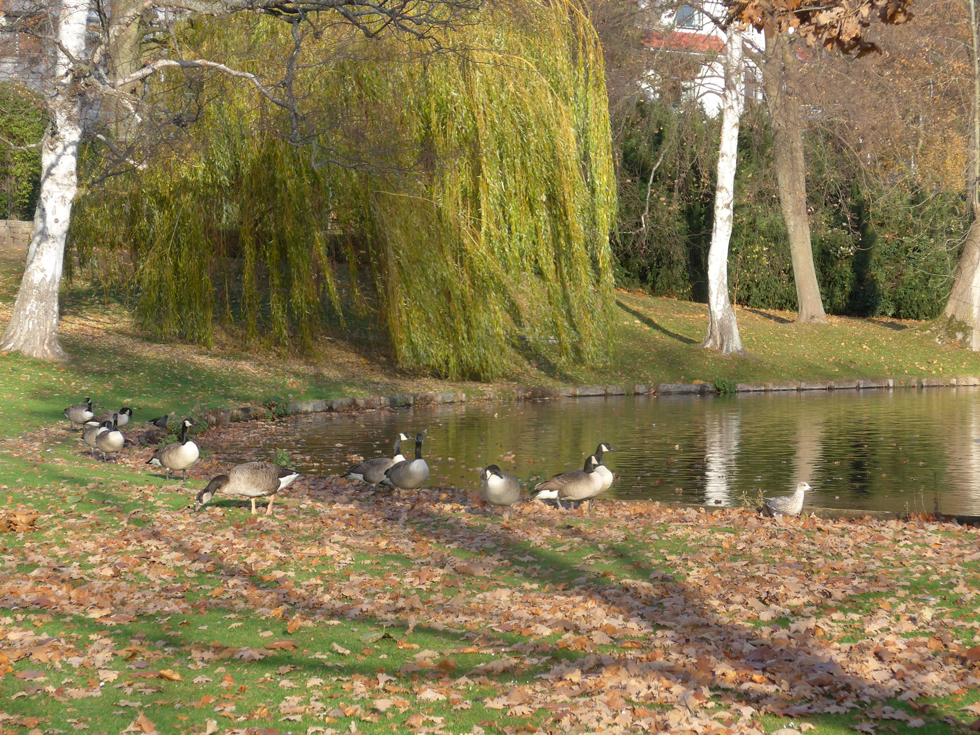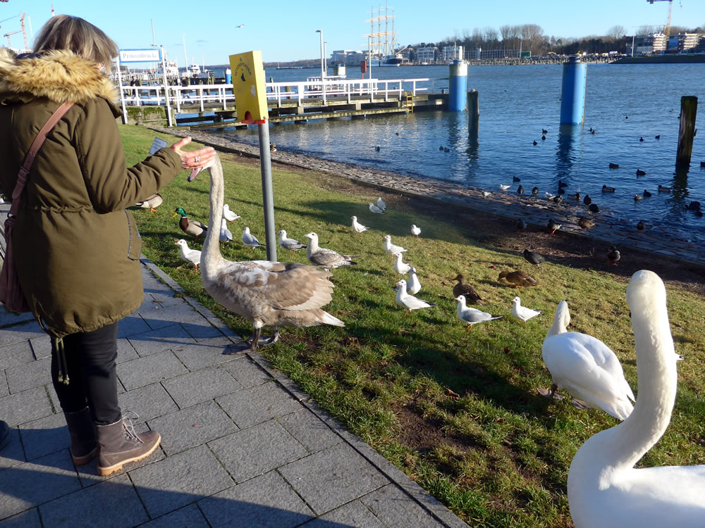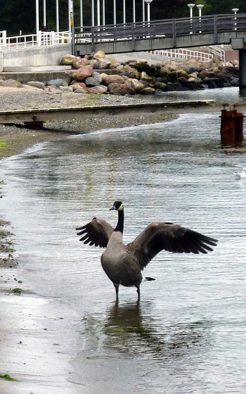 över uns Köpp. Ünner uns Water harr de Aalbek noog. Dor müss sogoor en niege Stratenbrüüch buut warrn. De Verbinnung vun de Aalbek mit den Fischereehaven na de Oostsee geev dat ümmer noch. So müssen wi den Footweg vun den Parkplacken na den Vagelpark inslaan. Geschrei vun de verscheden Vagels ut alle Welt weer al wiet to höörn. De Biller köönt Se per Klick