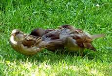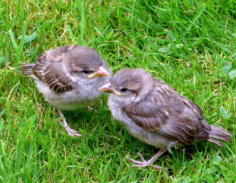 De weern seker ut ehr Nest fullen. Se kunnen noch nich richtig up de dünnen Been stahn. De Ogen harrn se to. Se lehnen sik aneenanner un geven sik Stütt, so good dat güng. Mit eens möken beide de Ogen up. Ehr Moder keem mit Foder! Glieks höör dat Tschilpen up. Moder harr ehr nich verlaten, ok buten dat Nest nich! Ik kunn beruhigt in't Huus gahn. Na mien Meddagsslaap weer mien ersten Gang in Goorn. Dat Tschilpen harr uphört, dat Fedderknüdel weer nich mehr to sehn. Hoffentlich weern de beiden lütten Lünken in Sekerheit! In de Naverschap gifft dat leider veel Katten! De Biller köönt Se per Klick