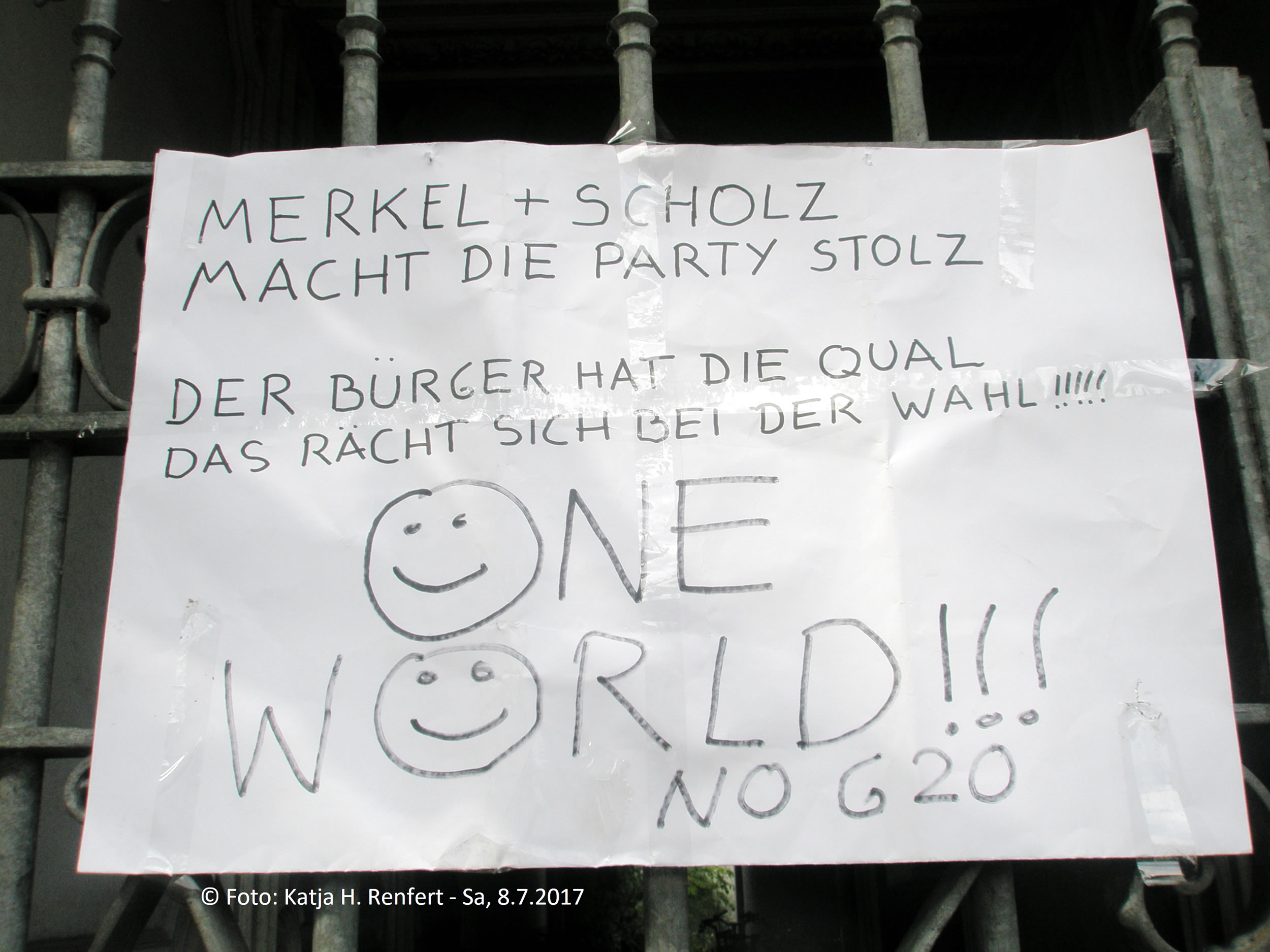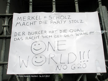 en Glas mit Water stellt. Dat is wenigstens 'n beten Freud na düsse Horror-Nacht (ik wahn an de Sicherheitszone 1 vun den G20-Gipfel in de Messehallen). Bi mien Morgenspazeergang vörhin harr ik Musik-Begleitung: 3 kreisende Hubschrauber, dat weer dat Foortsetten vun de Nachtmusik (also, bi Mozart hört sik dat ganz anners an!), rasende tatü-tata-Wagens ätzend! Wat för'n Glück, dat ik mit de lüttje Blööt en Freud heff. De groten Lüüd makt dat jo anners: Konzert in'ne Elphi un achterna 'n üppig Eten. Dat fragt sik blots, welkeen mehr Freud hett un för annere maakt: ik mit mien lüttje Blööt or uns Muddi un Olaf ... De Biller köönt Se per Klick
